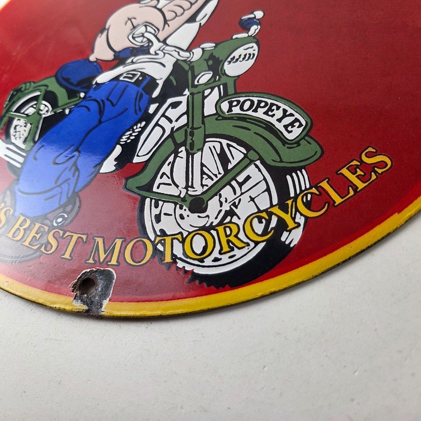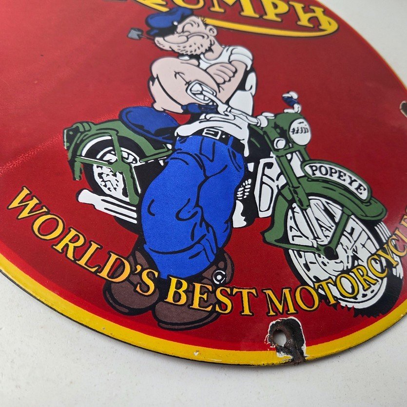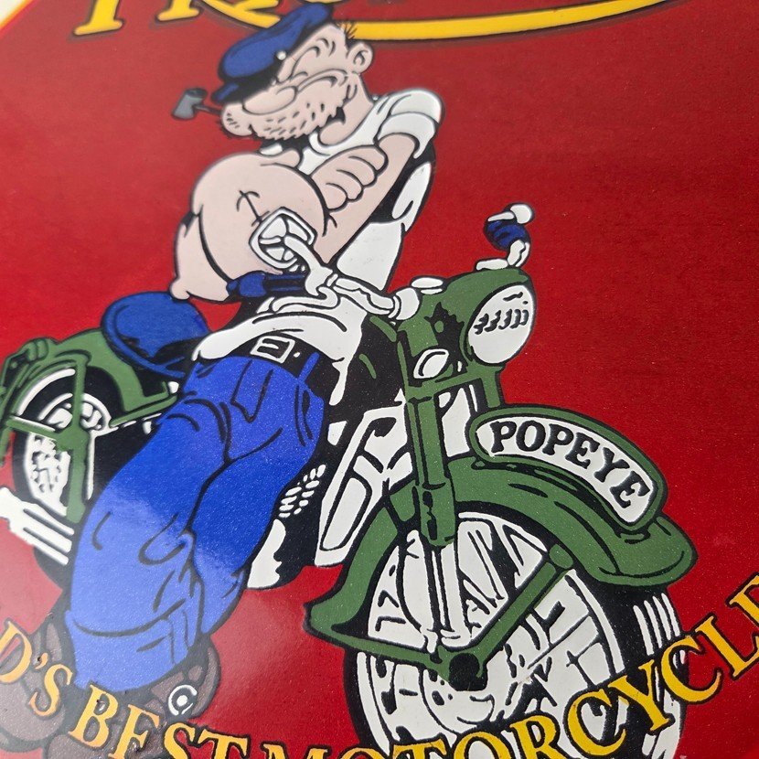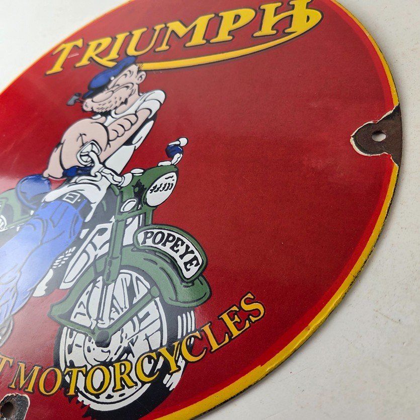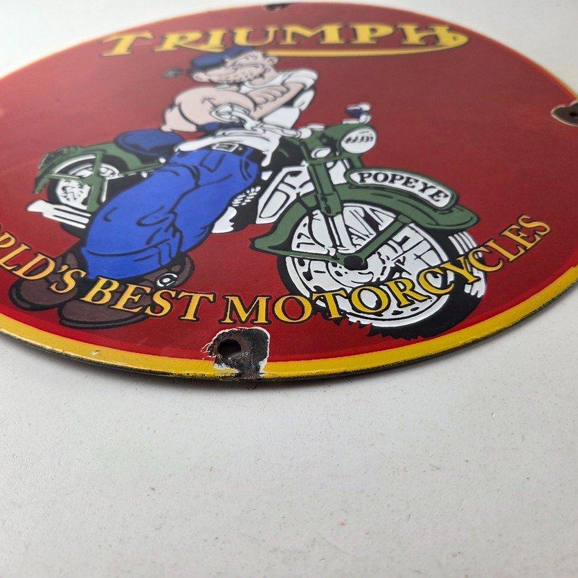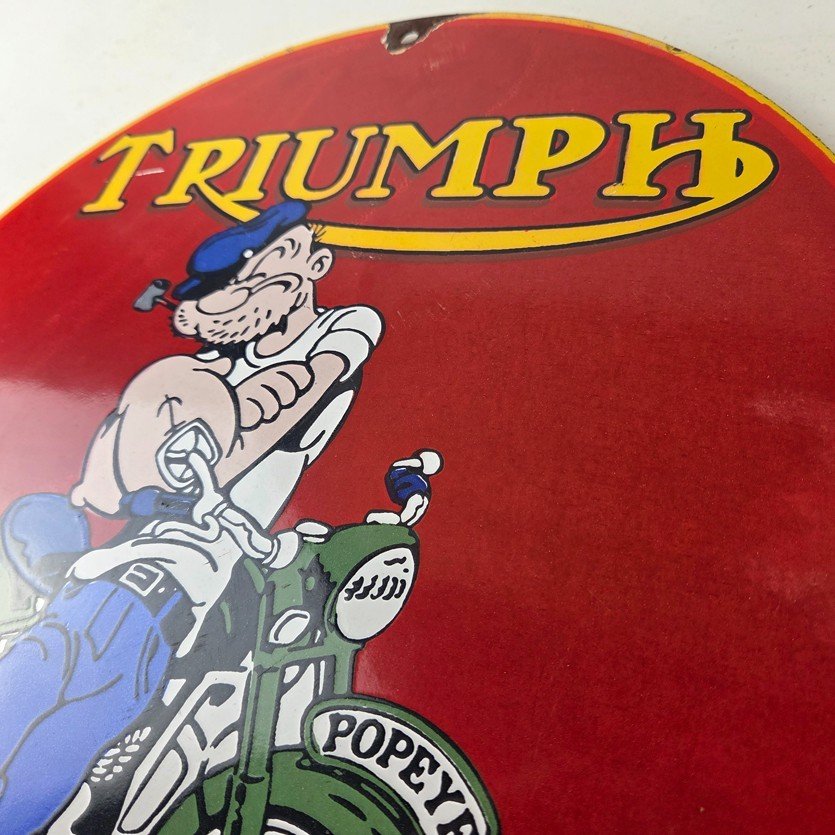 This vintage Triumph Automobiles porcelain sign features the Triumph Motorcycles and Popeye. This sign is perfect for advertising your love for Triumph culture and measures 12″ across.