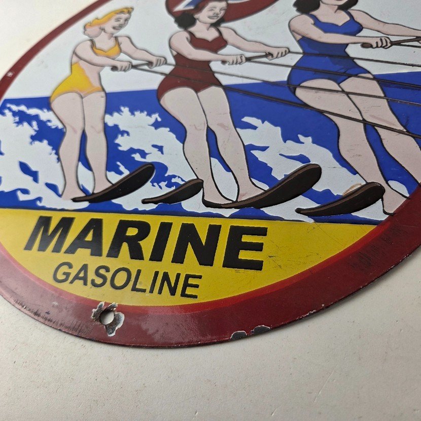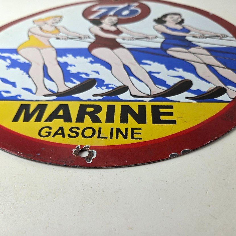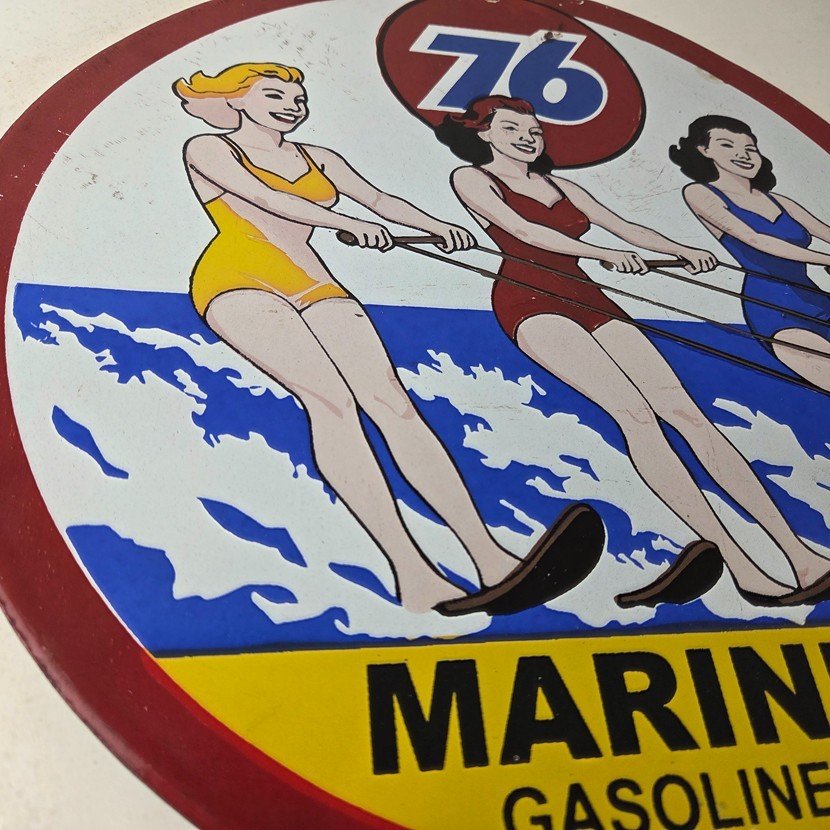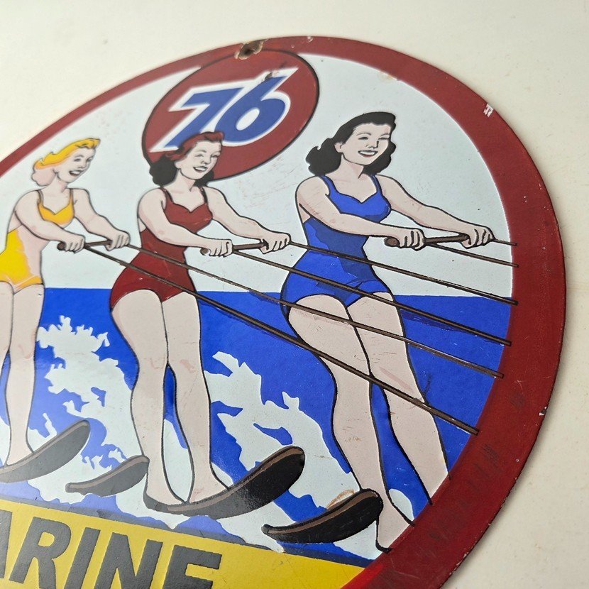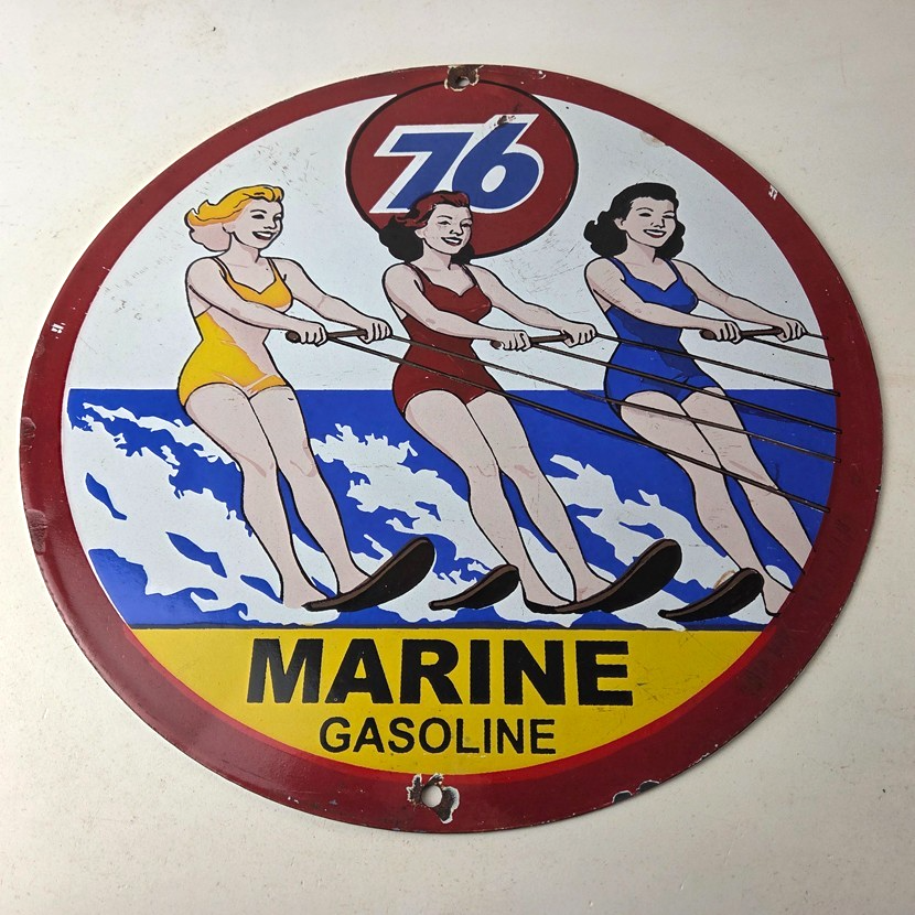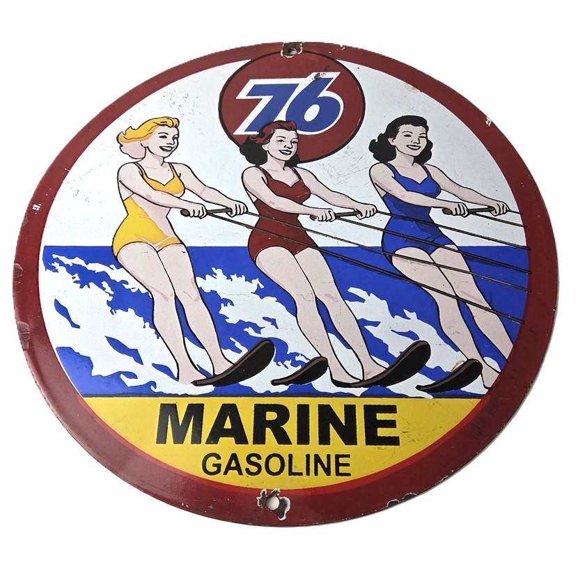 This vintage Union 76 porcelain sign is a true gem for any collector of oil & gas memorabilia. Enhance the look of your garage or man cave with this vintage porcelain gas motor oil service pump sign featuring the iconic Union 76 Gasoline brand. This 12″ sign is a perfect addition to any collection of gas & oil themed memorabilia.