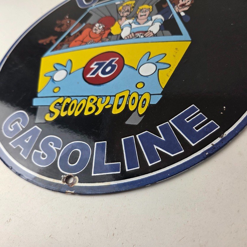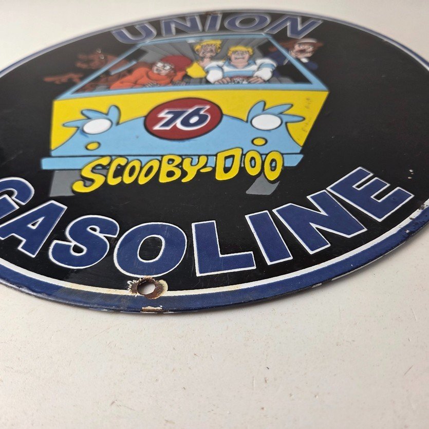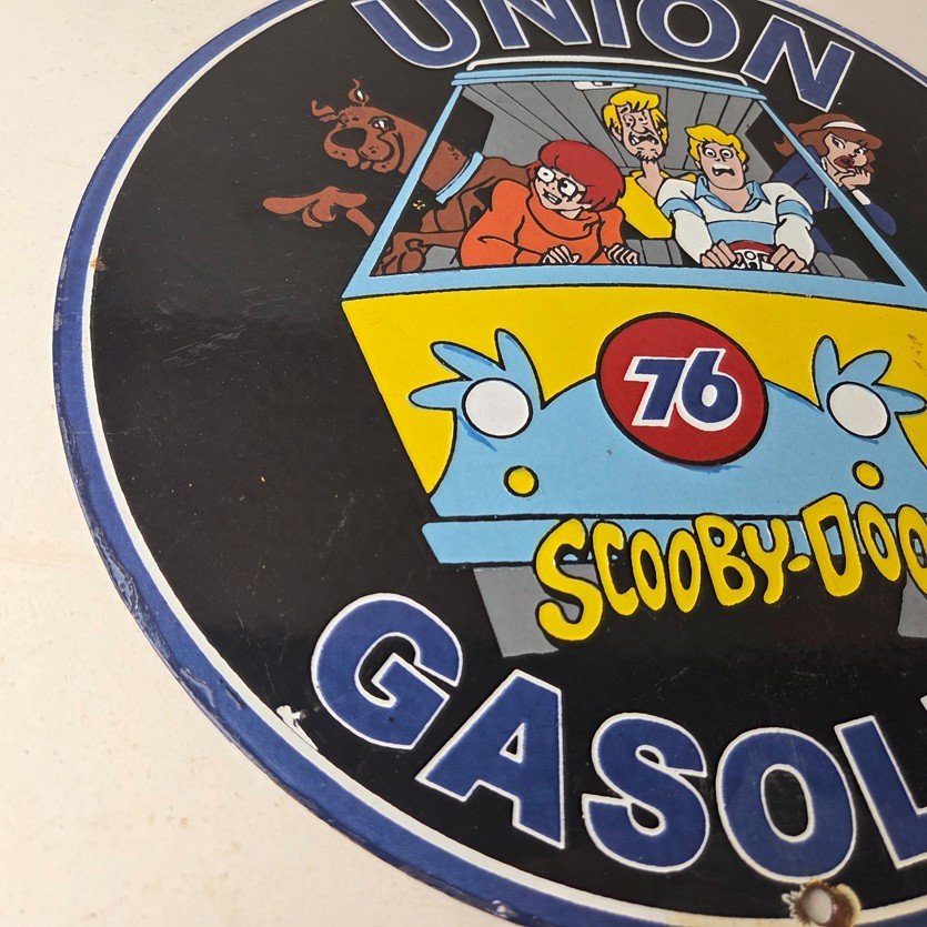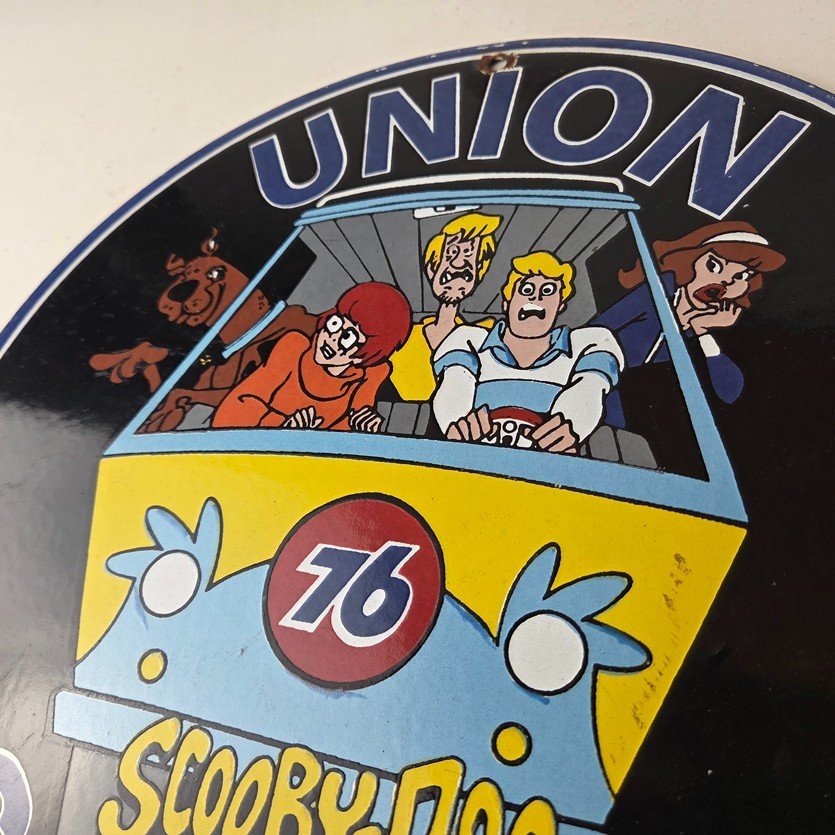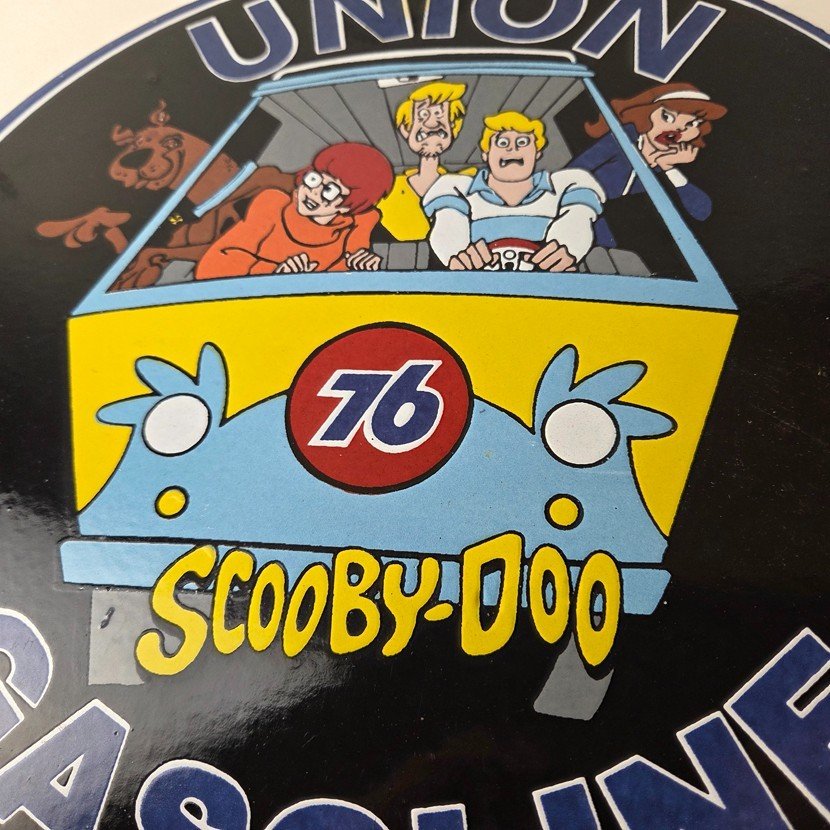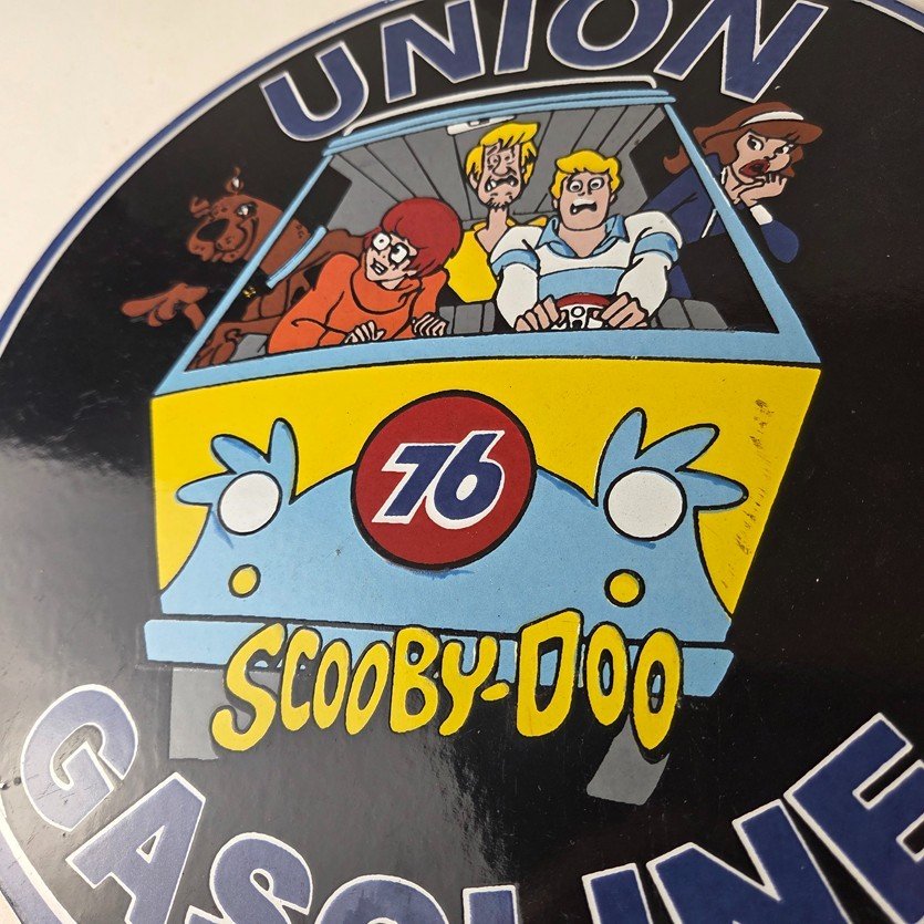 This vintage Scooby-Doo Union 76 sign makes a great addition to a garage, shop display, man cave, or any Scooby-Doo memorabilia collection, vintage gas station advertising collection, or cartoon crossover collection.