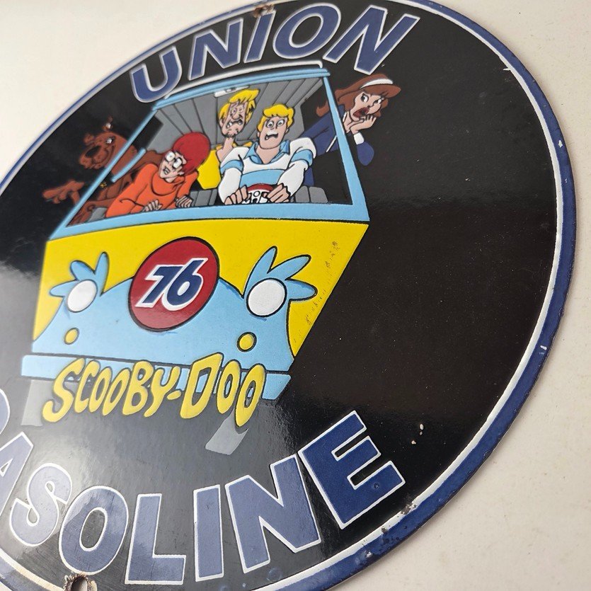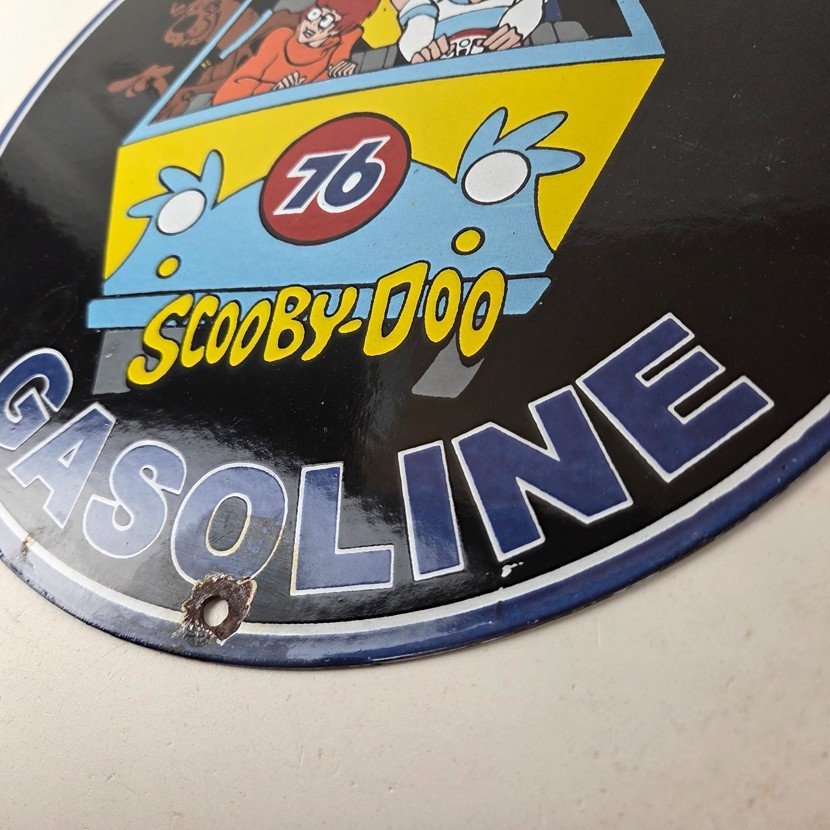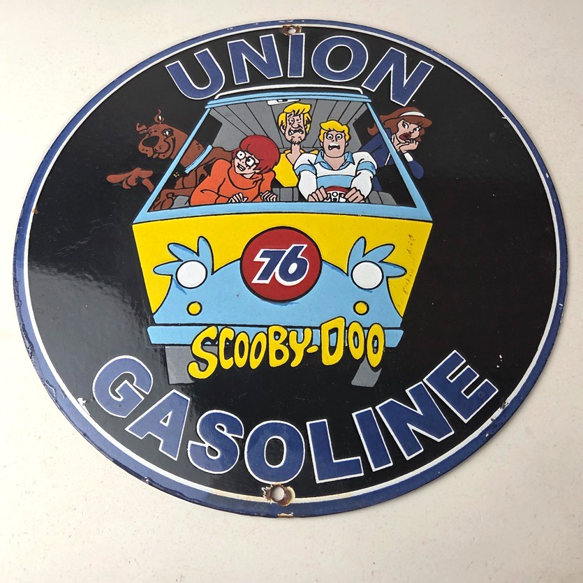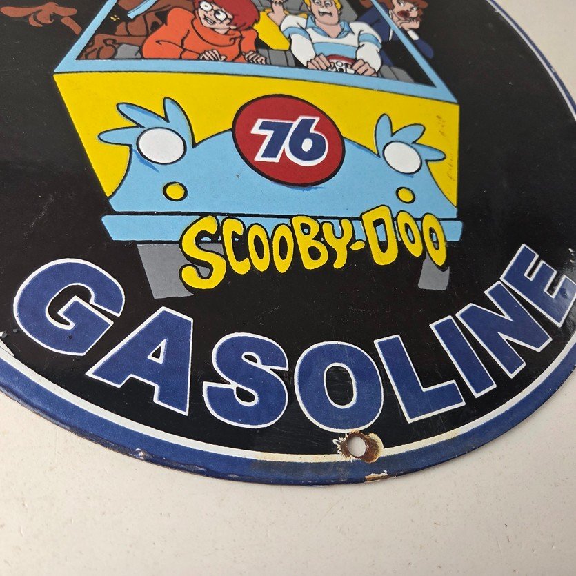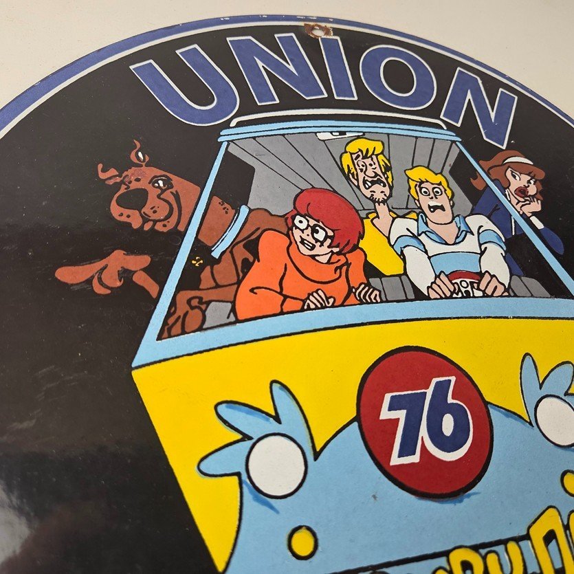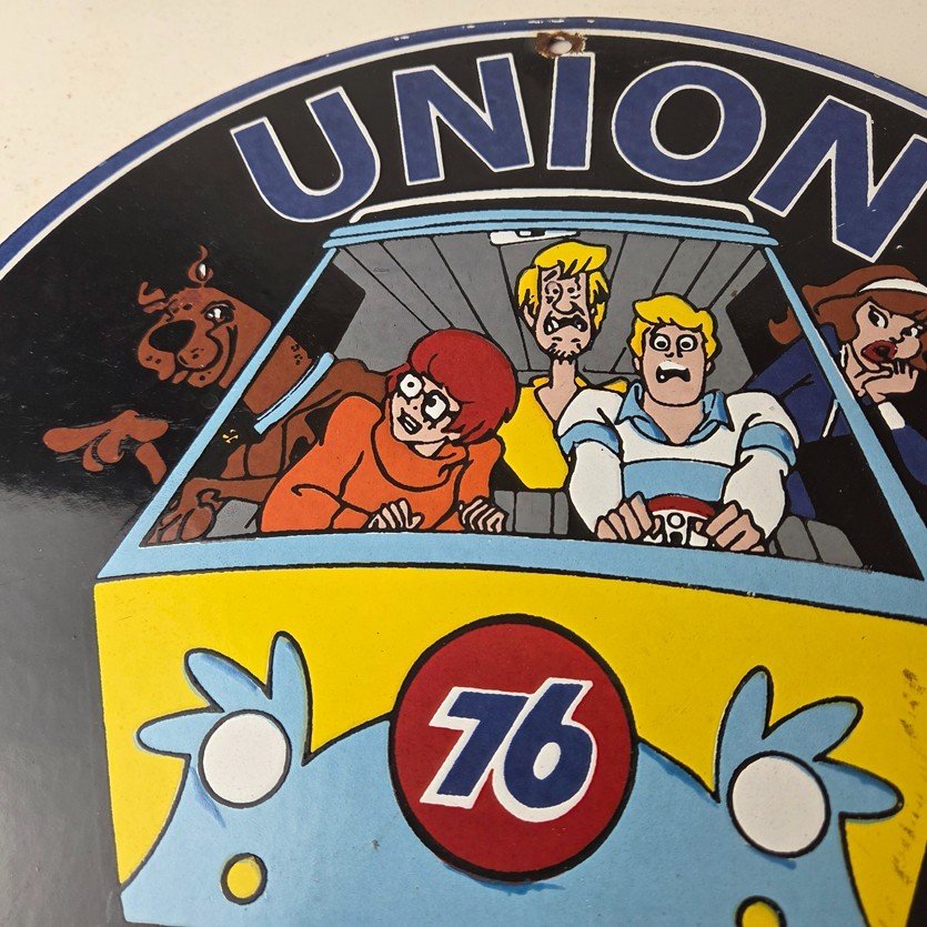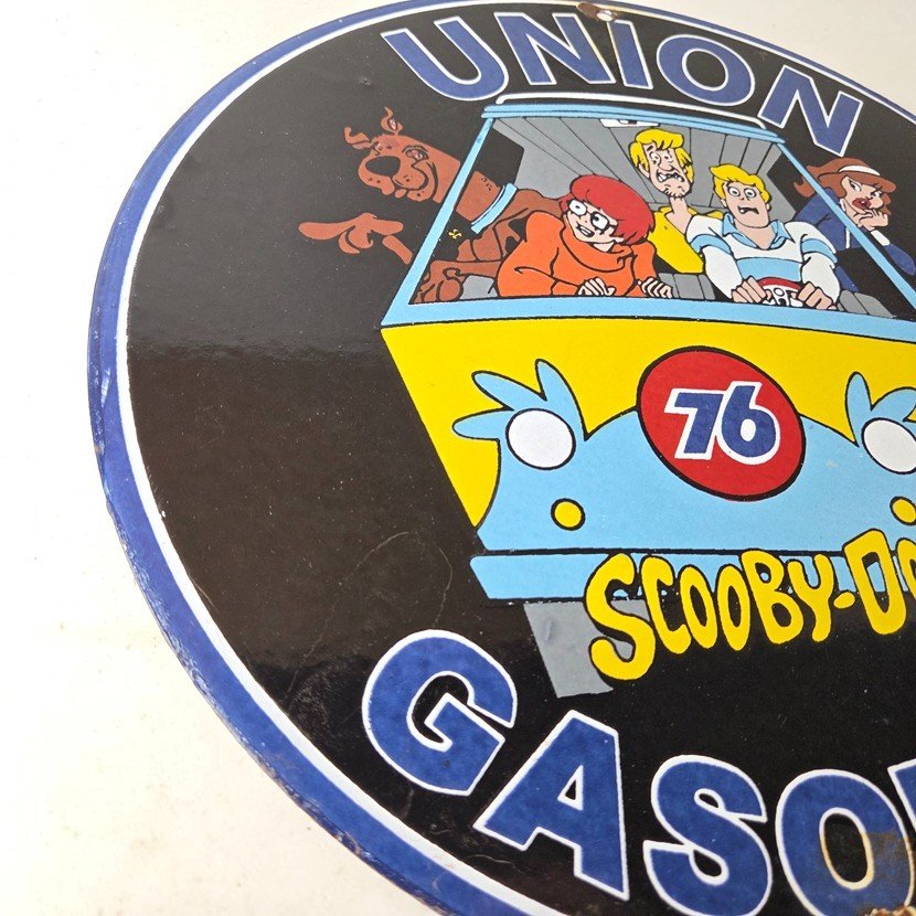 This vintage Scooby-Doo Union 76 sign makes a great addition to a garage, shop display, man cave, or any Scooby-Doo memorabilia collection, vintage gas station advertising collection, or cartoon crossover collection.