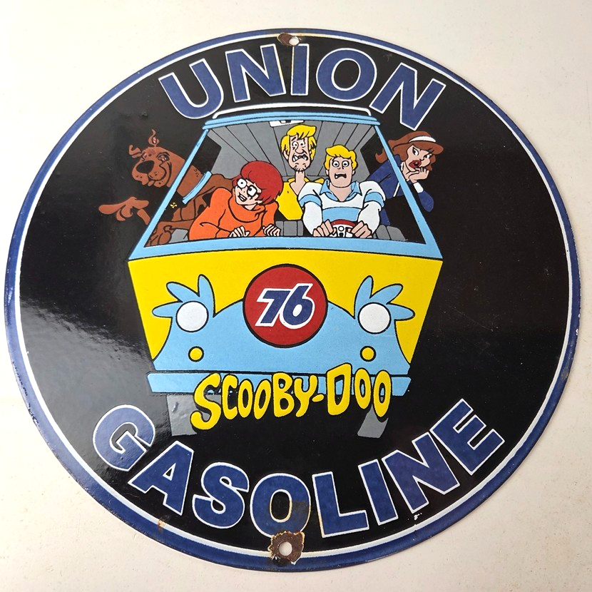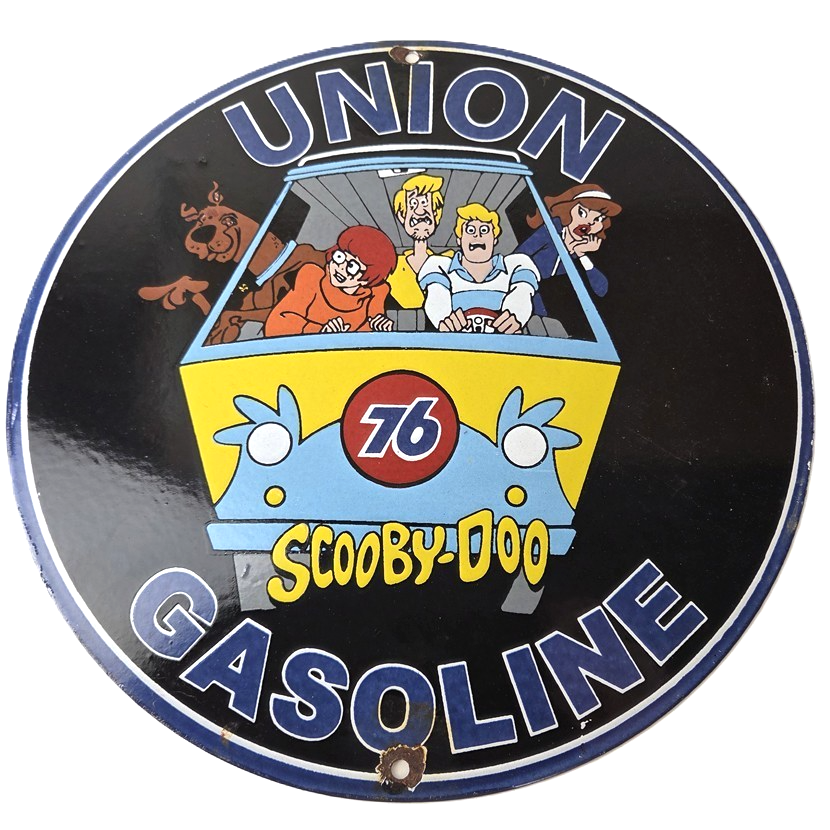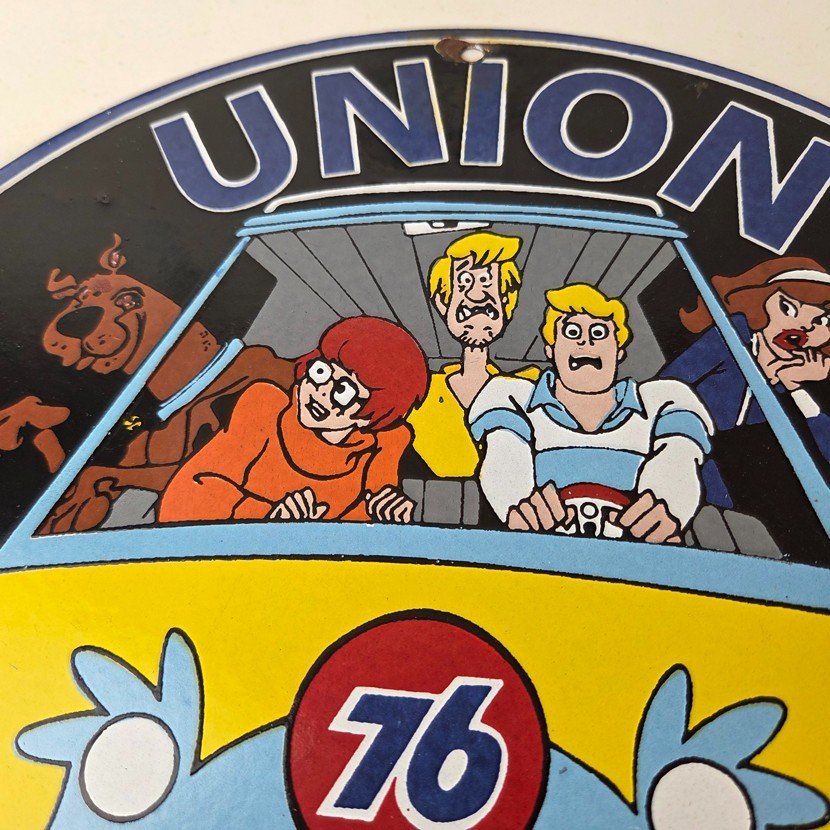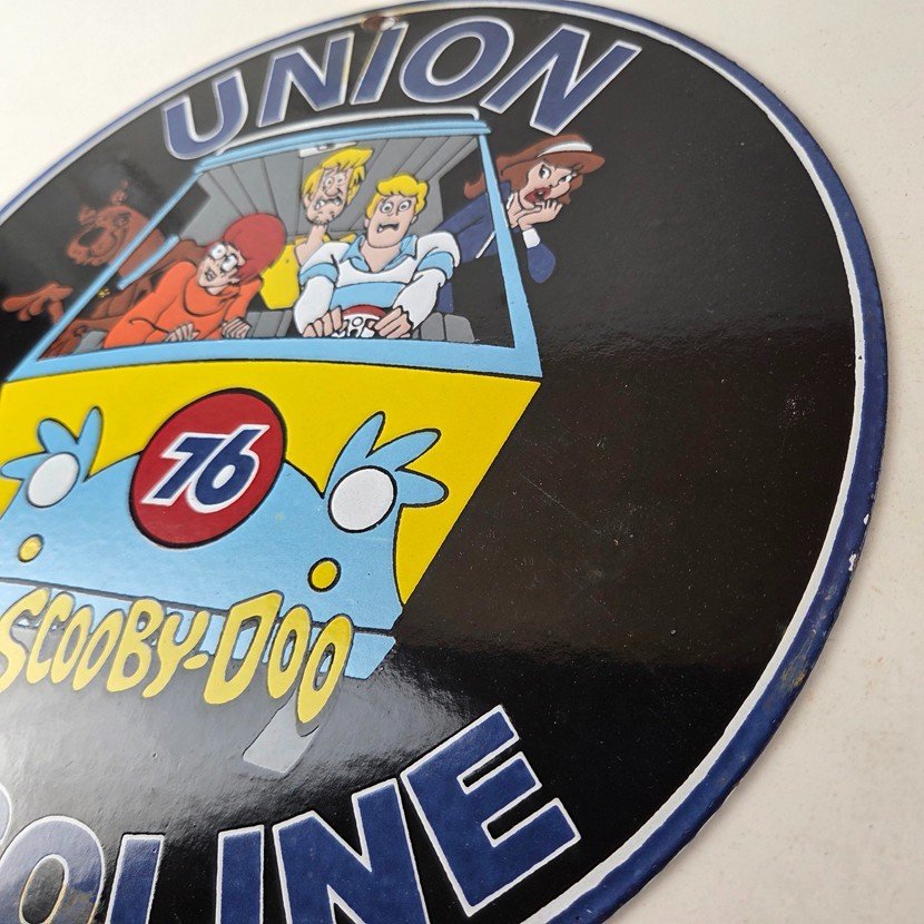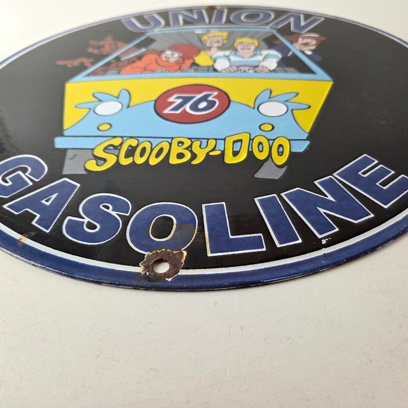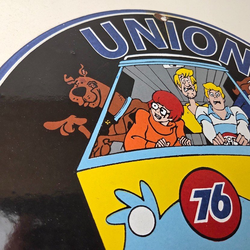 This vintage Scooby-Doo Union 76 sign makes a great addition to a garage, shop display, man cave, or any Scooby-Doo memorabilia collection, vintage gas station advertising collection, or cartoon crossover collection.