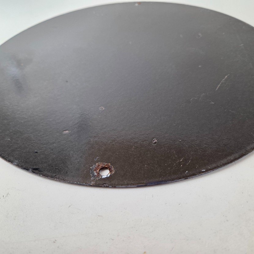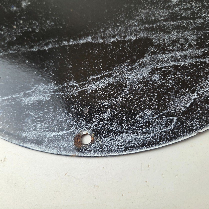 Made of porcelain enamel on steel with patina and wear: rust spotting around the mounting holes, minor edge chips, light surface scratches, and minimal discoloration. This is a porcelain enamel advertising sign in excellent condition, exactly as shown in the photos.
