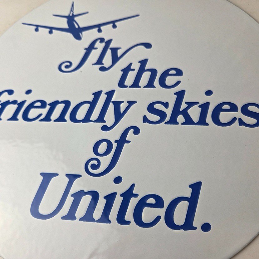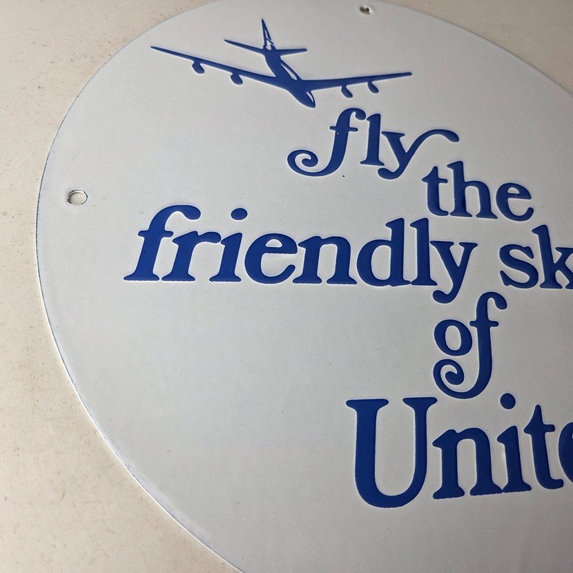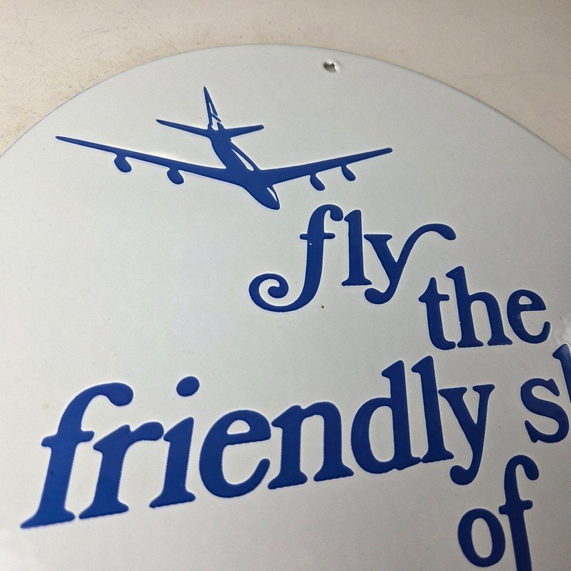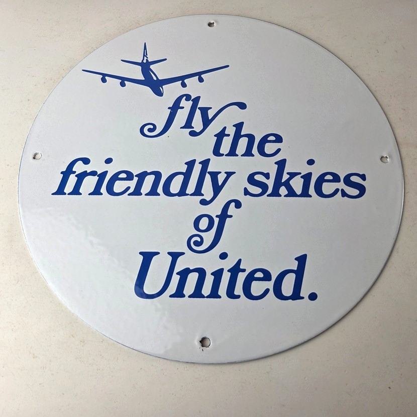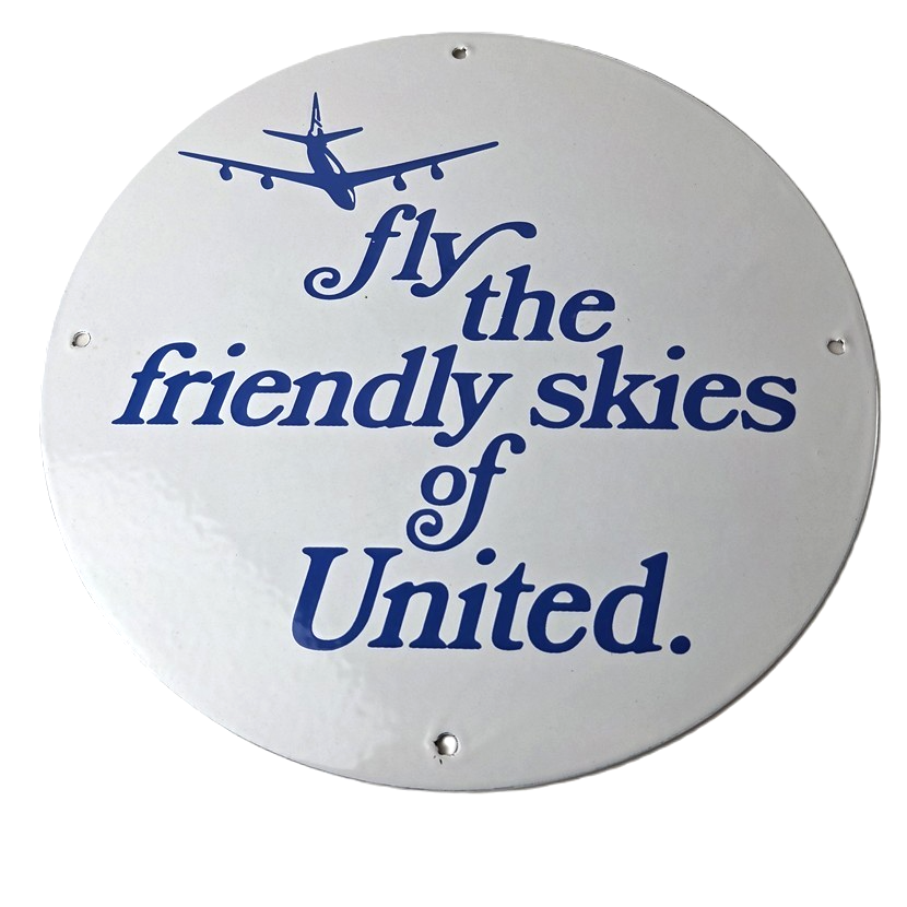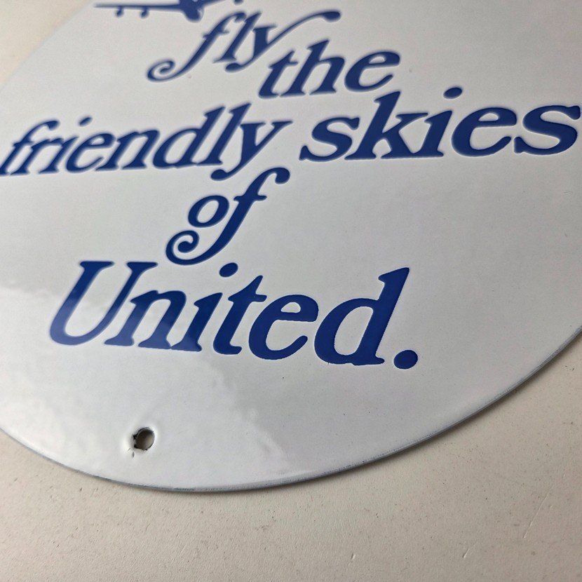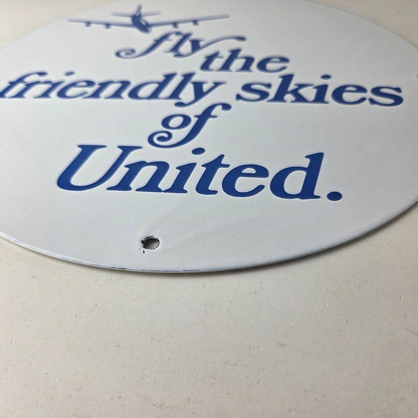 This vintage United Airways porcelain sign is a must-have for collectors and aviation & gasoline enthusiasts alike. With its eye-catching blue color and United Airlines brand, it’s a perfect addition to any collection. Measuring 11 3/4″, this porcelain sign has excellent lettering with the old aircraft in the center.