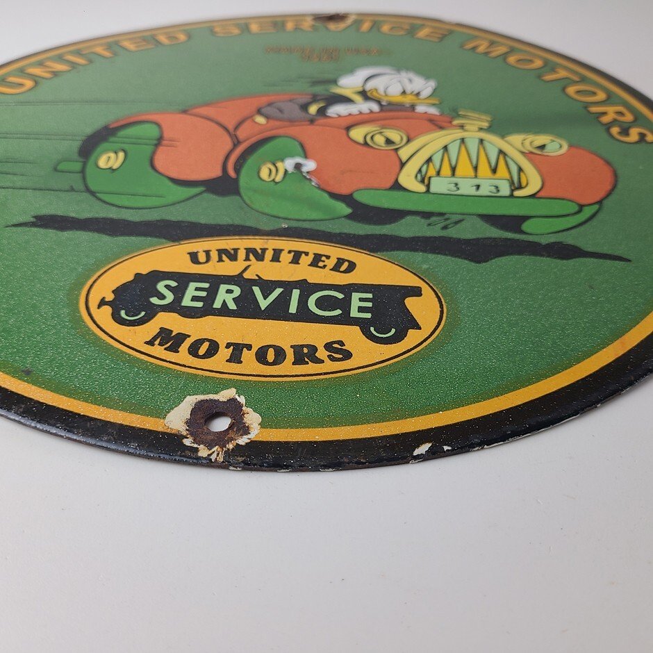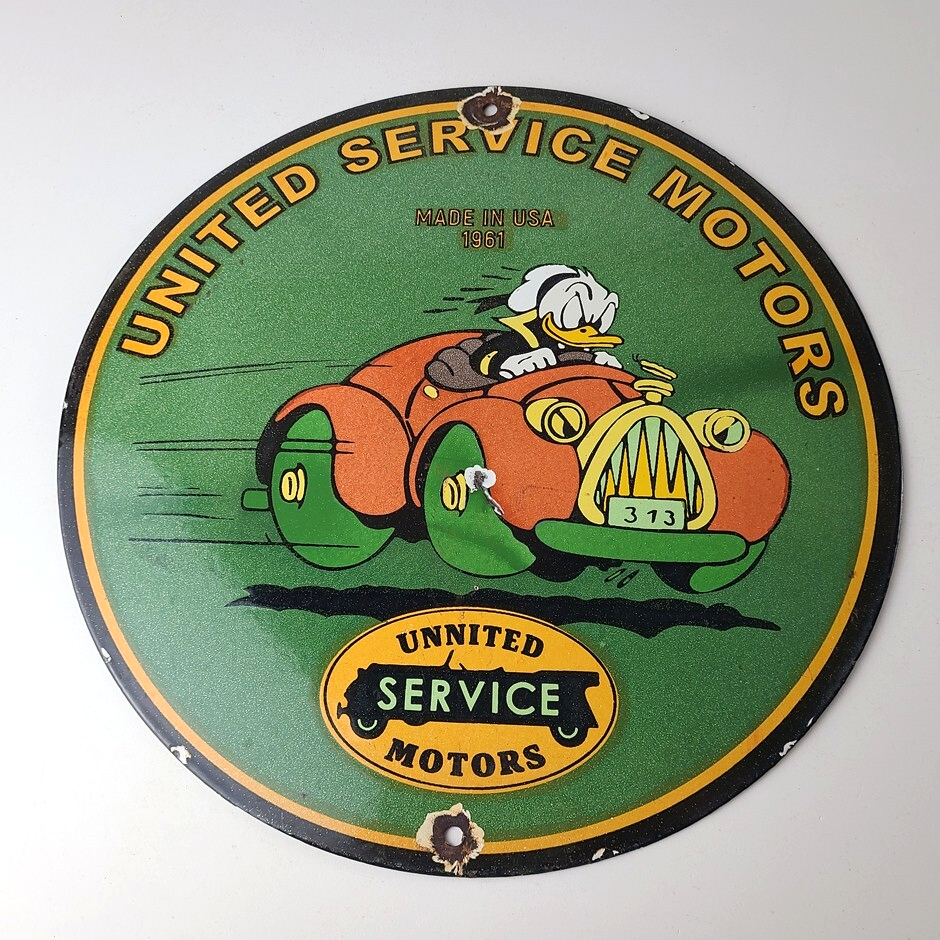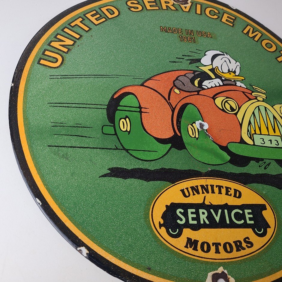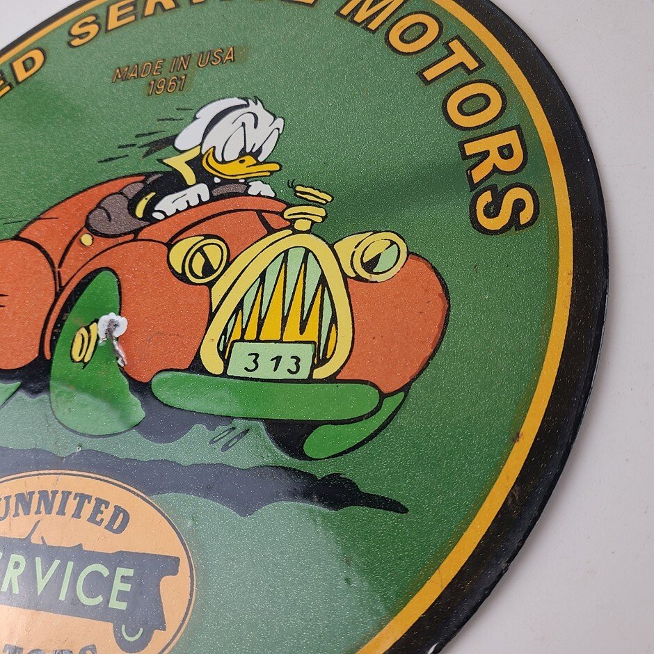 This vintage porcelain sign is a must-have for any Chevrolet enthusiast. Featuring the beloved character Donald Duck, with the United Motors graphic and lettering around the upper part of the rim. The sign is made of durable porcelain and has a colorful design that will add a nostalgic touch to any collection. Perfect for display in a garage, man cave, or any other space, this sign is sure to be a conversation starter.