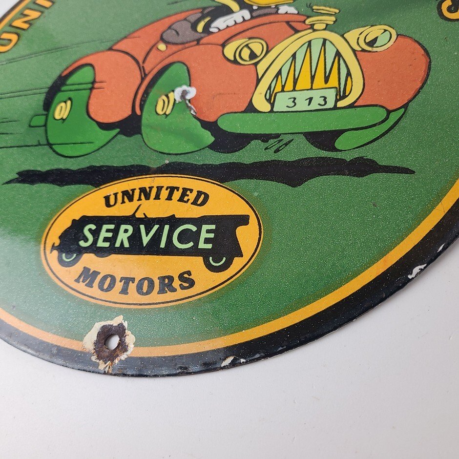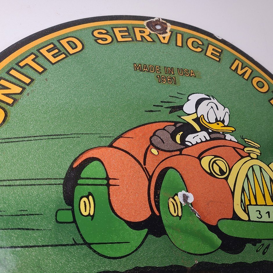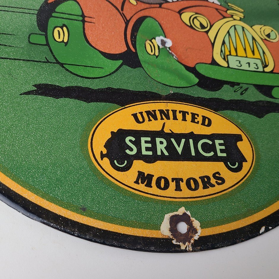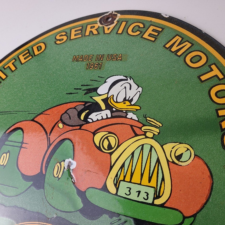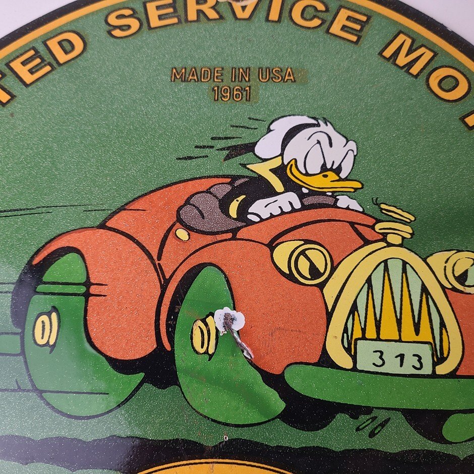 This vintage porcelain sign is a must-have for any Chevrolet enthusiast. Featuring the beloved character Donald Duck, with the United Motors graphic and lettering around the upper part of the rim. The sign is made of durable porcelain and has a colorful design that will add a nostalgic touch to any collection. Perfect for display in a garage, man cave, or any other space, this sign is sure to be a conversation starter.