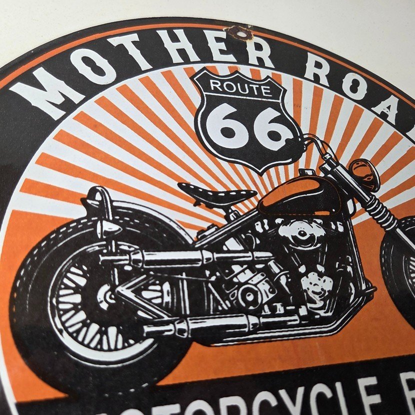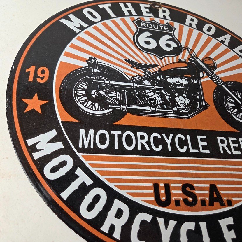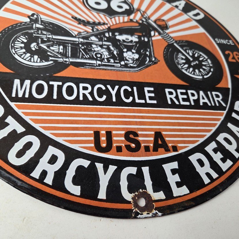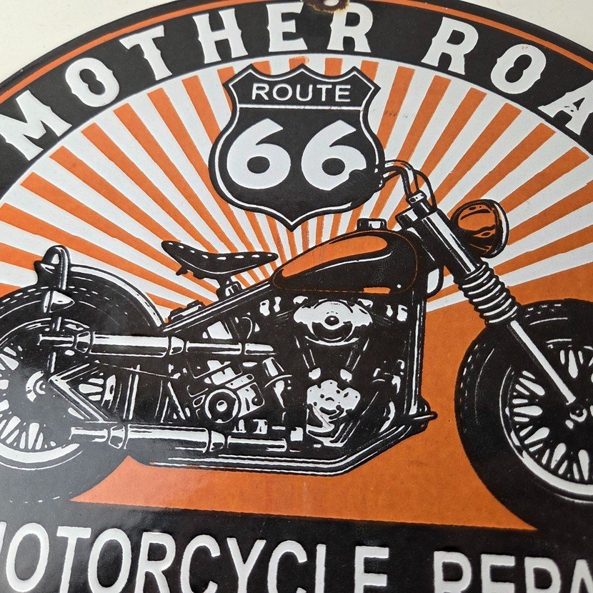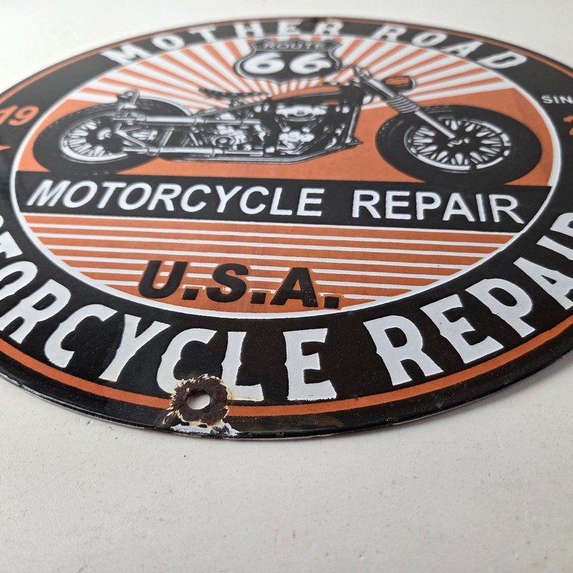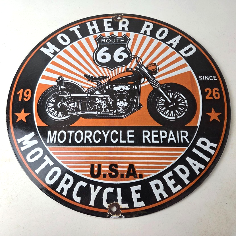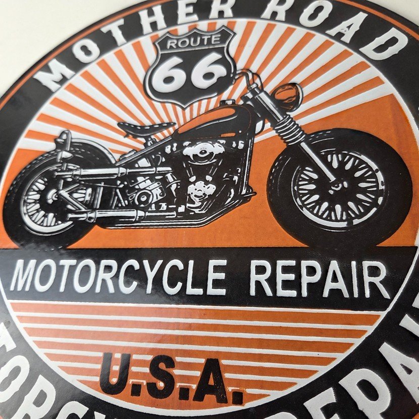 This vintage Route 66 motorcycle repair sign makes a great addition to a garage, shop display, man cave, or any Route 66 memorabilia collection.