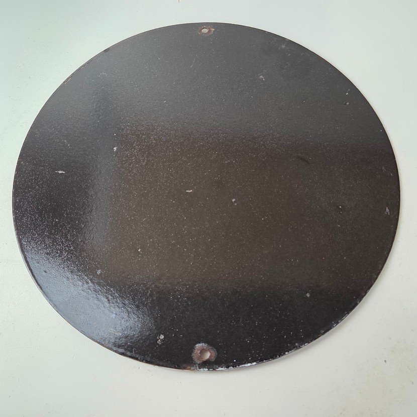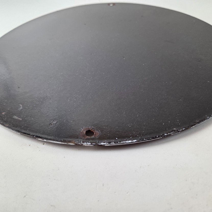 Made of porcelain enamel on steel with patina and wear: rust spotting around the mounting holes, minor edge chips, light surface scratches, and natural age discoloration. This is a porcelain enamel advertising sign in excellent condition, exactly as shown in the photos.