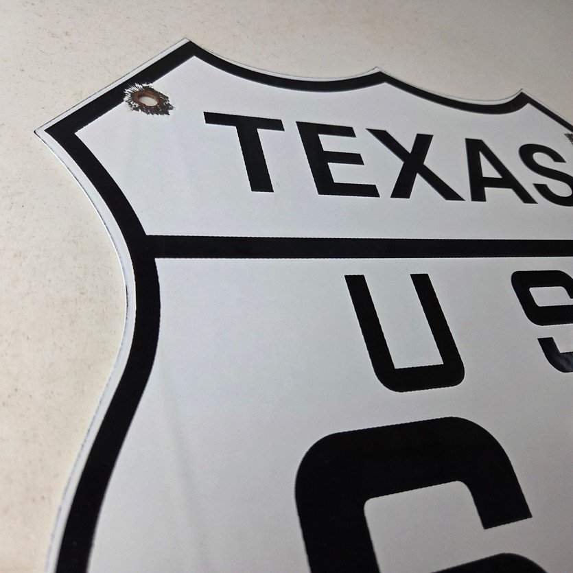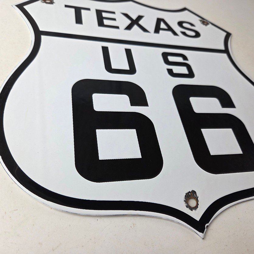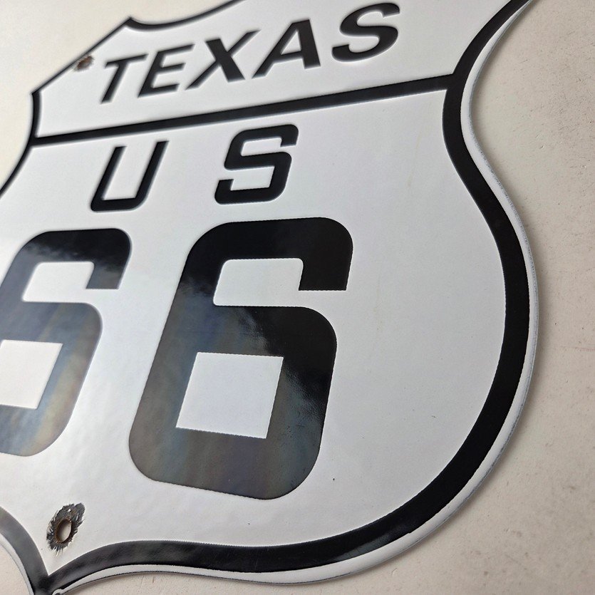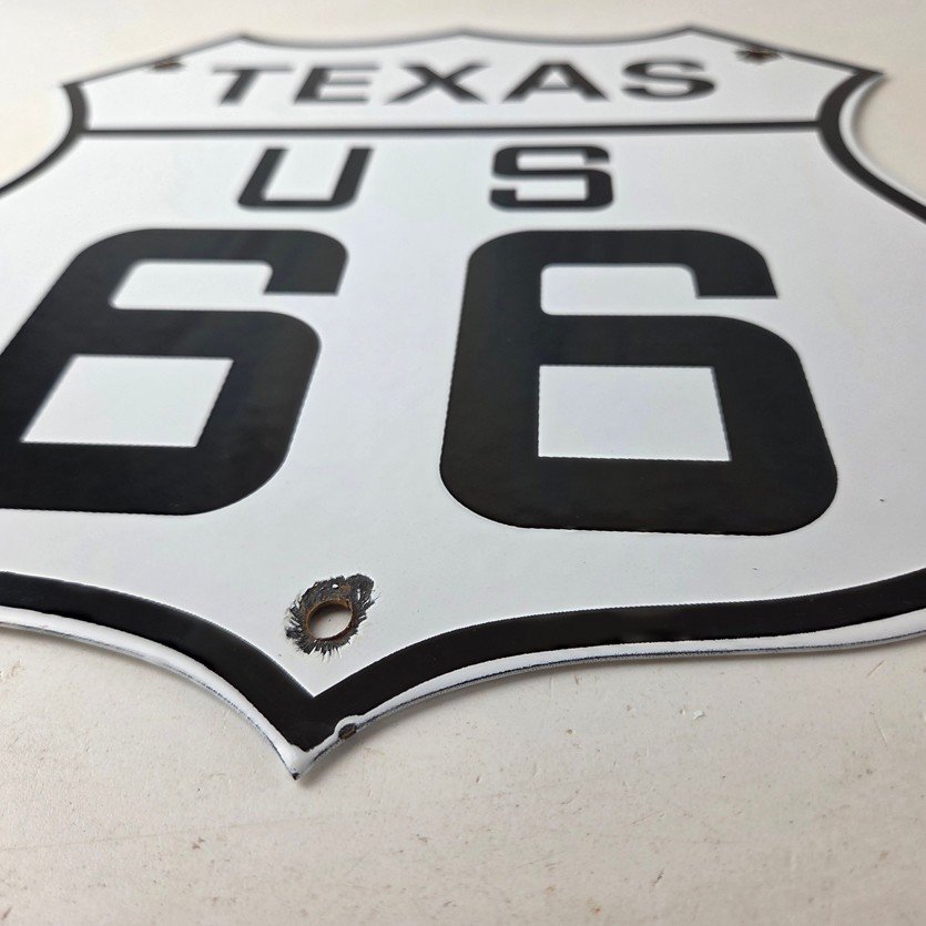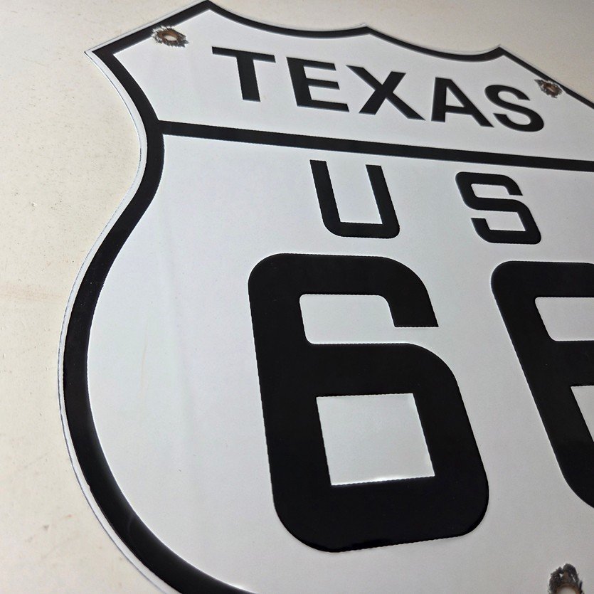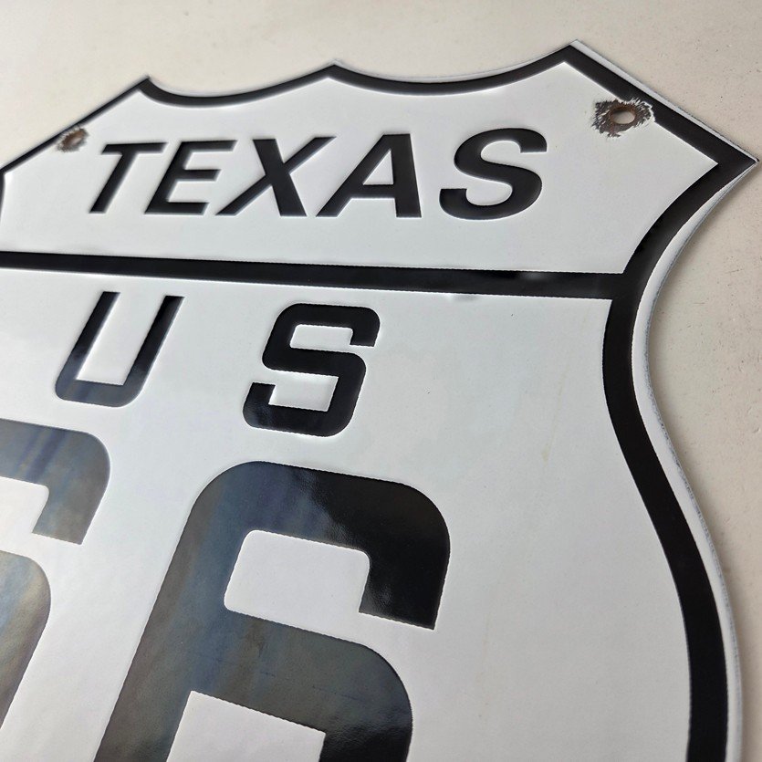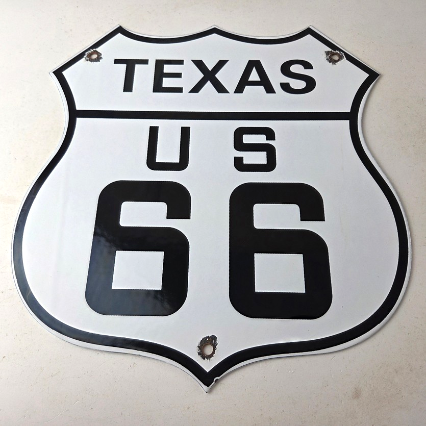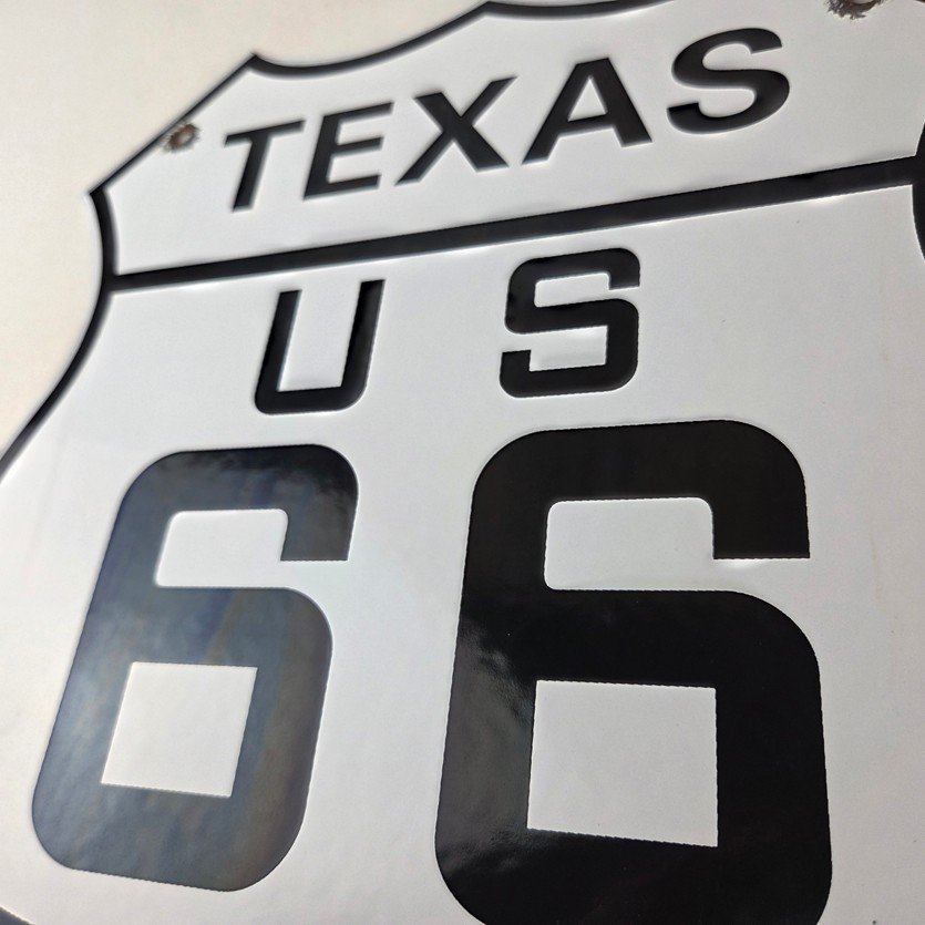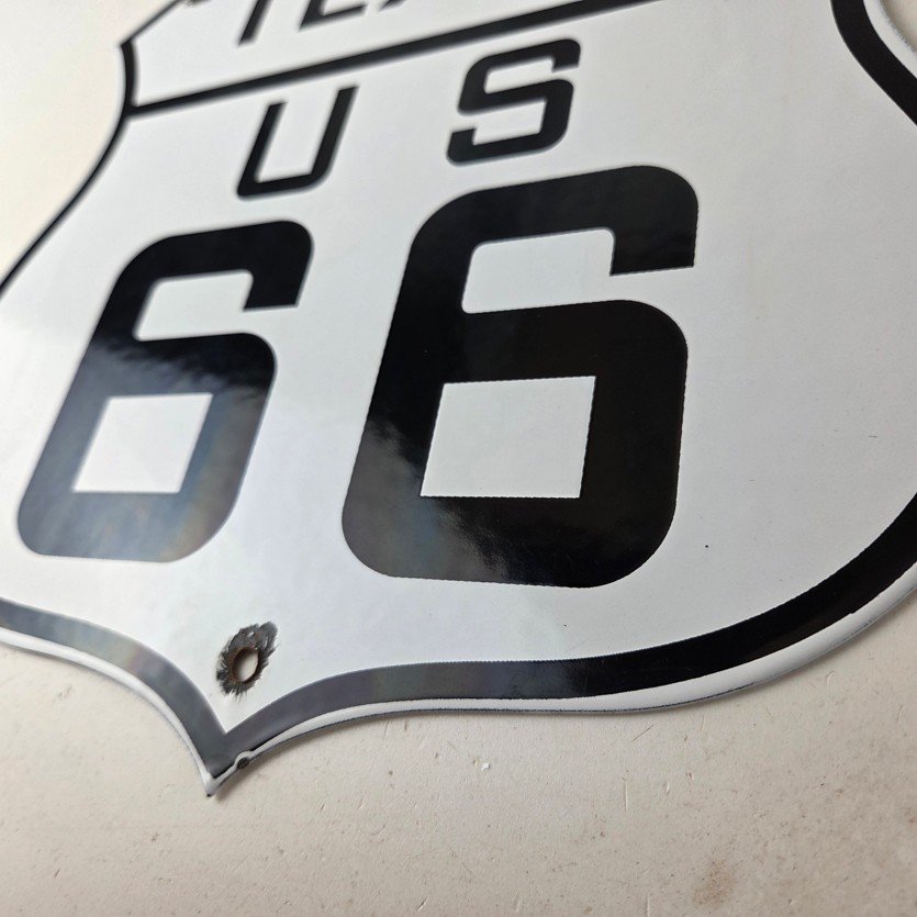 This vintage U.S. Route 66 sign is a classic piece of Americana that will transport you back to a simpler time. The 11 1/2″ x 11″ porcelain sign features the iconic highway shield and is perfect for any collector of gas and oil memorabilia. Made in the United States with porcelain on both sides. This sign will enhance your retro man cave, gasoline collection, shop, bar, or garage. It is your chance to own a piece of the Mother Road.