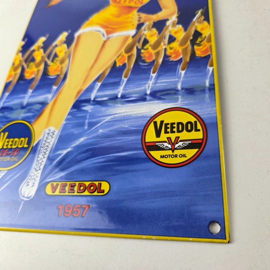This vintage Veedol Motor Oil porcelain sign is a must-have for any gas and oil advertising enthusiast. The sign features bold colors and prominently displays the Veedol brand with a pin-up girl on roller skates. The sign is made of durable porcelain and would make a great addition to any service station or gas pump display.
