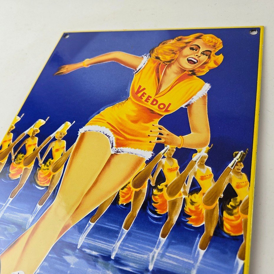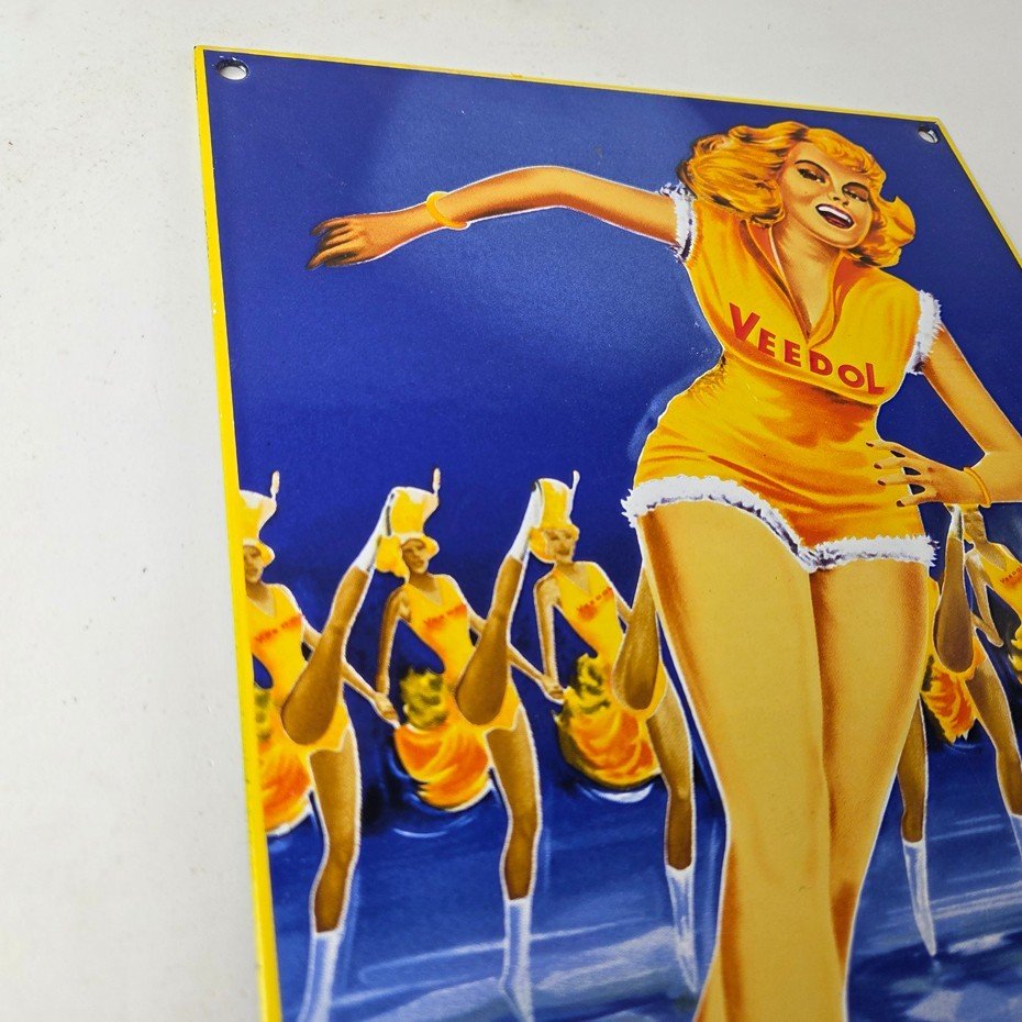 This vintage Veedol Motor Oil porcelain sign is a must-have for any gas and oil advertising enthusiast. The sign features bold colors and prominently displays the Veedol brand with a pin-up girl on roller skates. The sign is made of durable porcelain and would make a great addition to any service station or gas pump display.