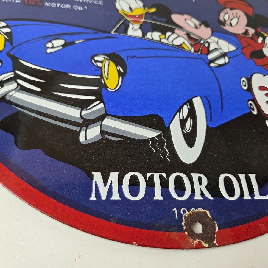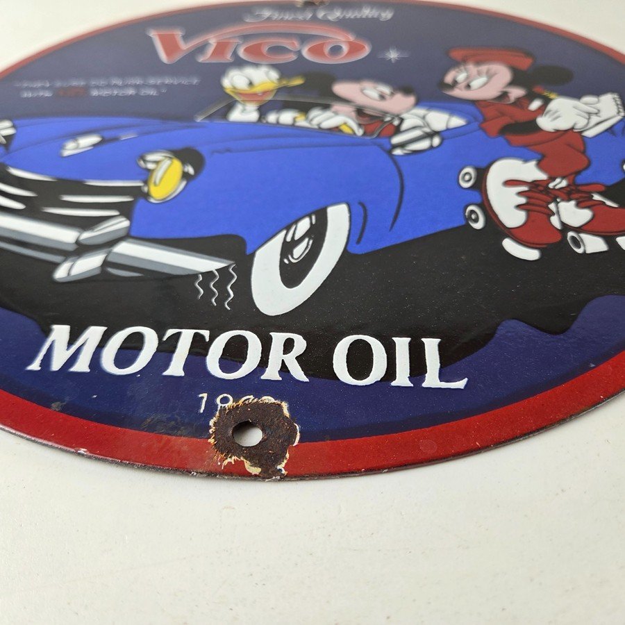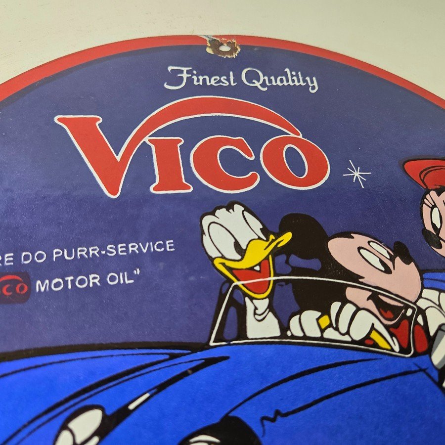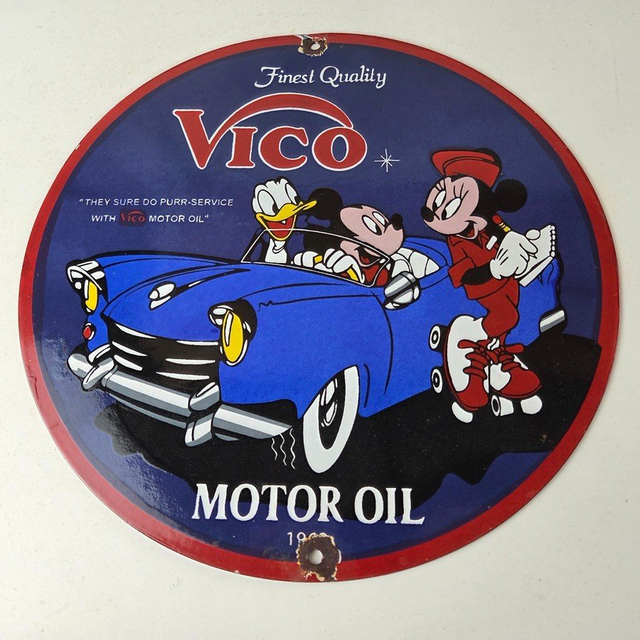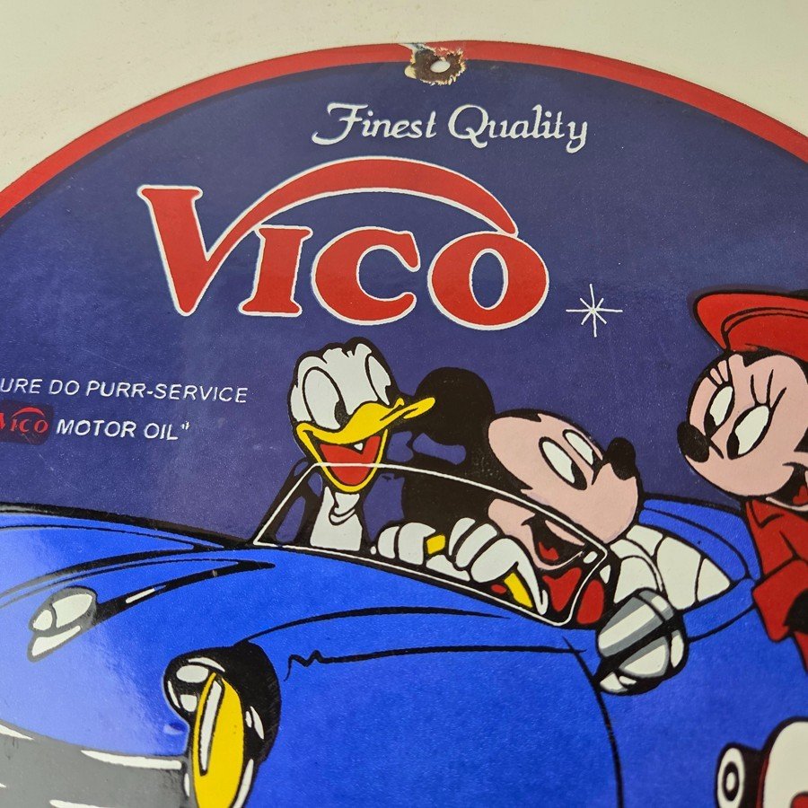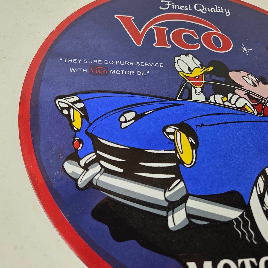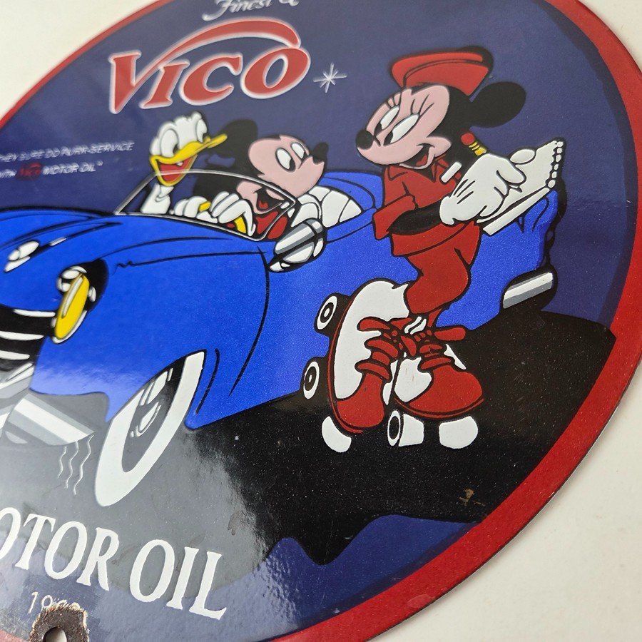 This vintage Vico Gasoline sign is a great addition for collectors of gas and oil memorabilia. The sign features Mickey and Minnie Mouse. Made of porcelain, this sign measures 12″ across. Don’t miss your chance to own this unique gas pump plate sign. Make an offer on this Buy it Now listing!