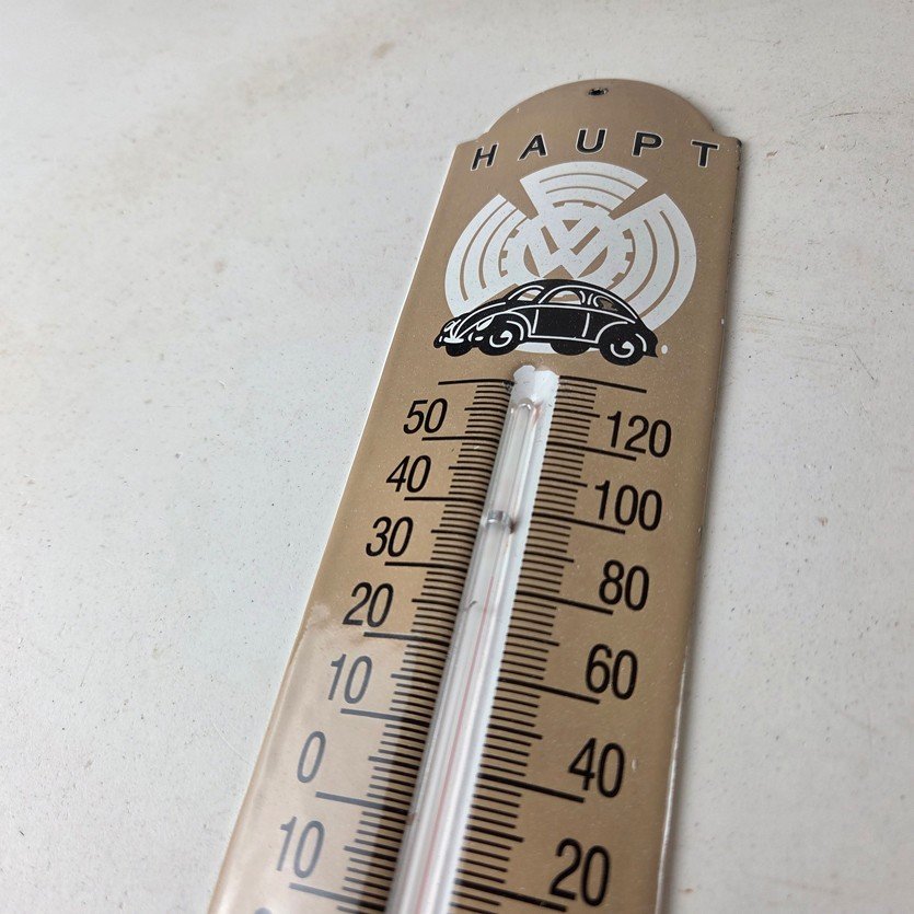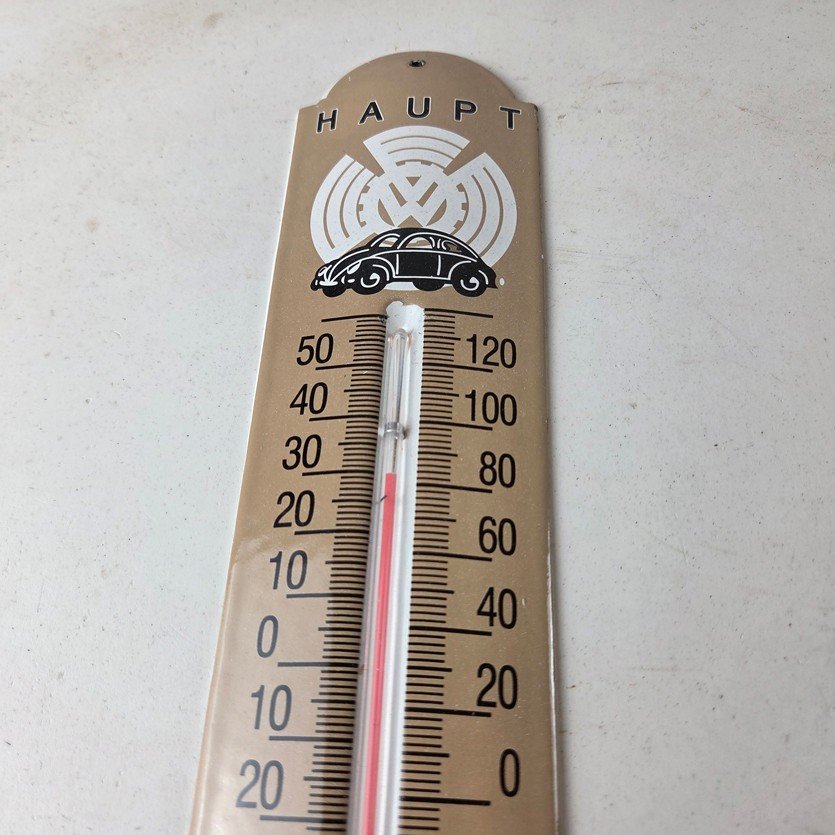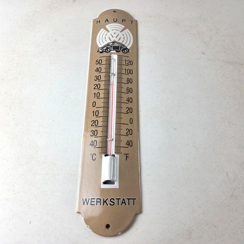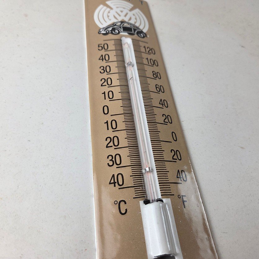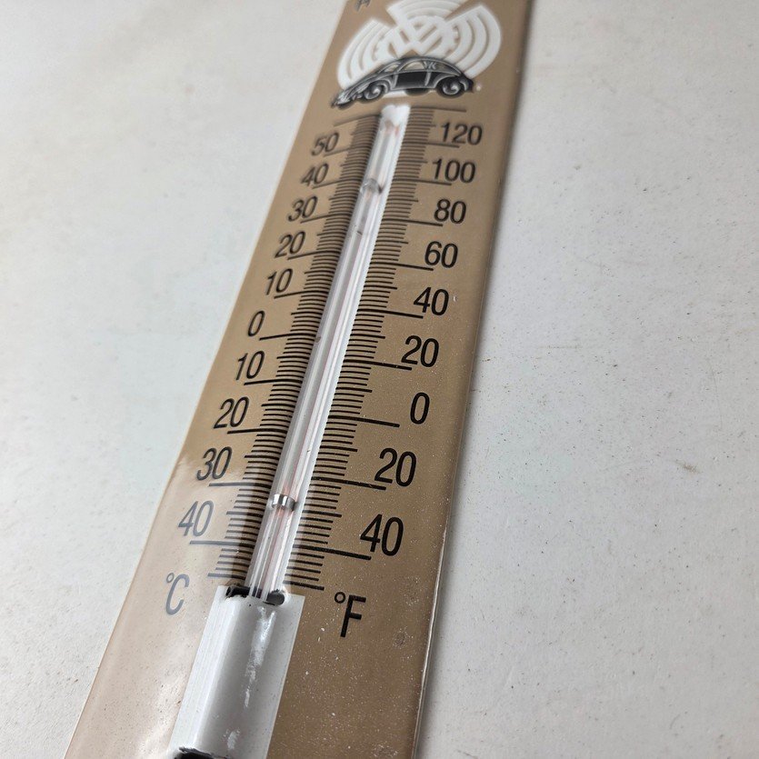 This vintage Volkswagen Bug porcelain thermometer measures 11 3/4″ x 2 1/2″. This thermometer is a great addition to any collection. It features the iconic VW Bug graphic and has vibrant colors with excellent gloss.