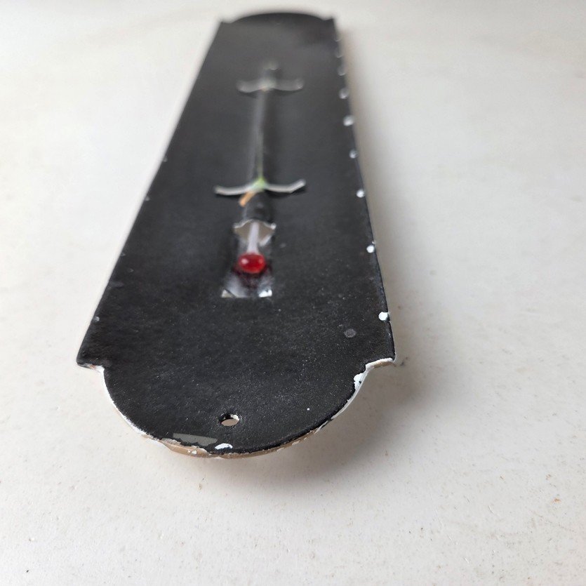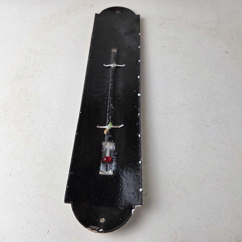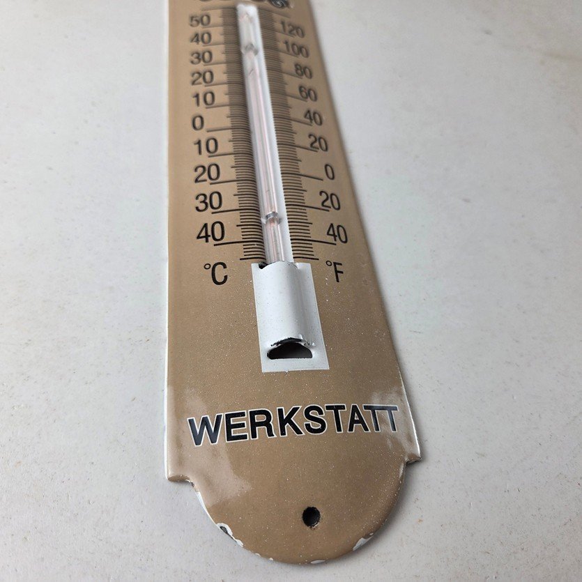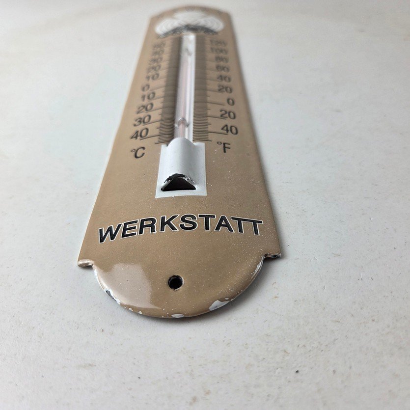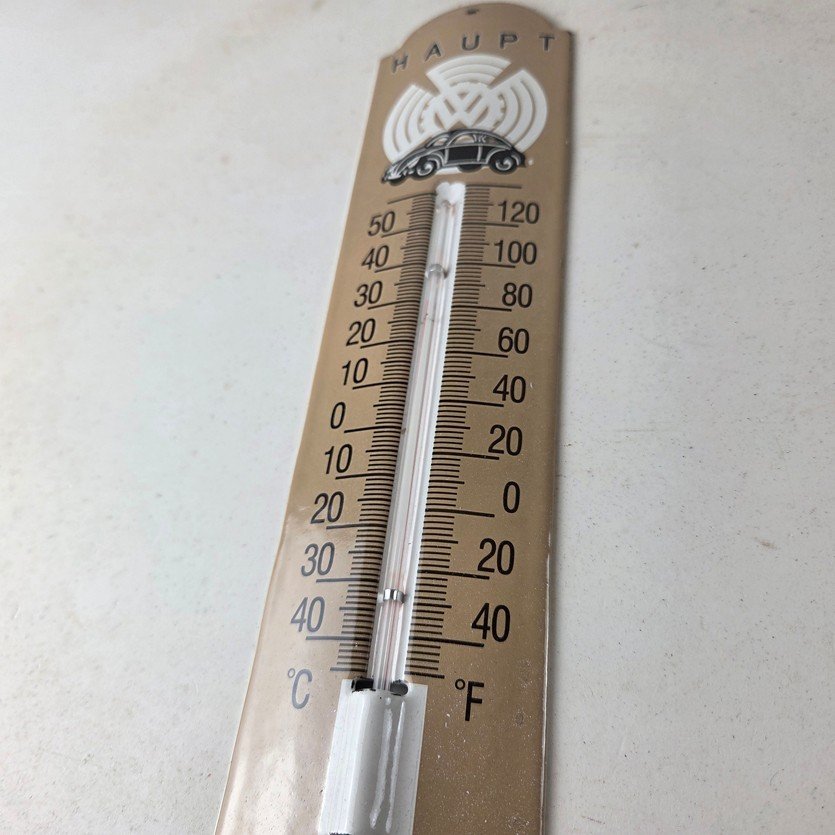 This vintage Volkswagen Bug porcelain thermometer measures 11 3/4″ x 2 1/2″. This thermometer is a great addition to any collection. It features the iconic VW Bug graphic and has vibrant colors with excellent gloss.
