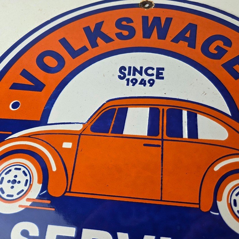 This vintage Volkswagen Beetle service sign makes a great addition to a garage, shop display, man cave, or any Volkswagen memorabilia collection, vintage VW advertising collection, or classic air-cooled Beetle enthusiast collection.