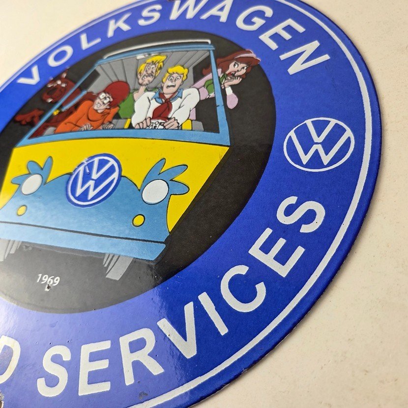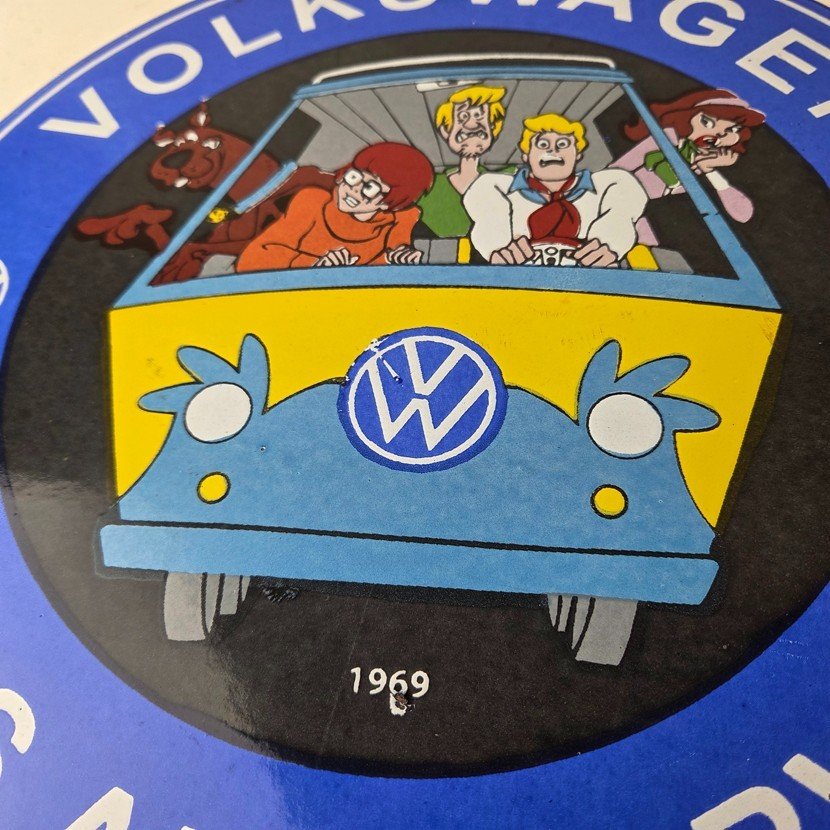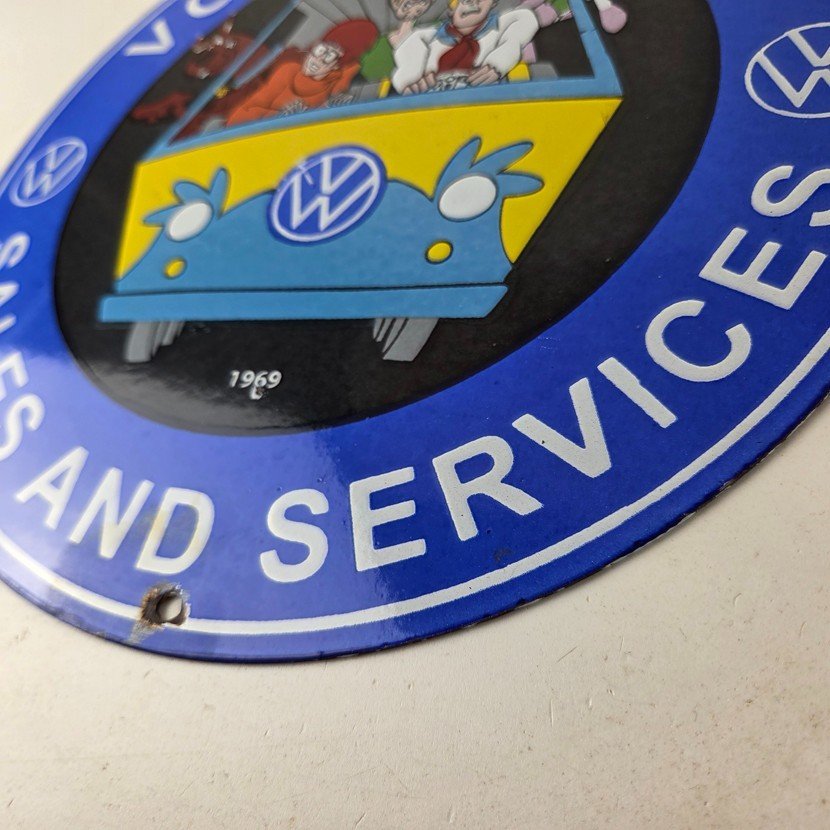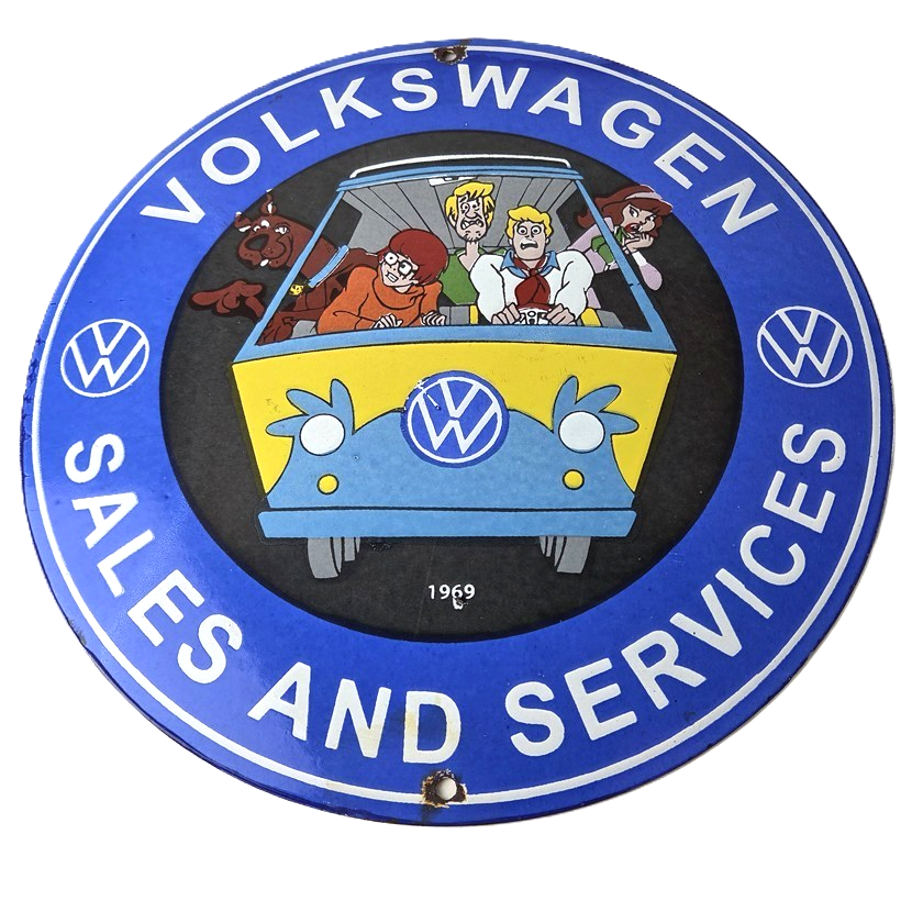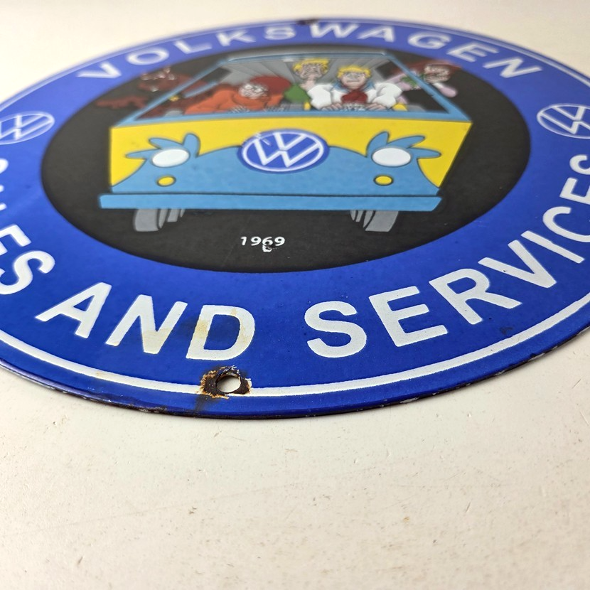 This vintage Volkswagen Automobiles porcelain sign is a must-have for any collector or enthusiast of automobile memorabilia. The sign features the iconic VW bug in excellent color, making it a unique addition to any gas and oil themed collection. Made of porcelain, this dealership sales sign is durable and measures 12″ across.