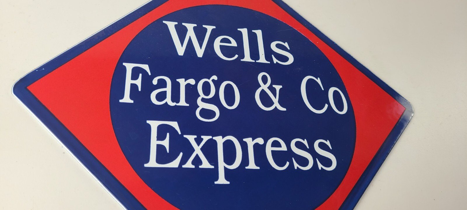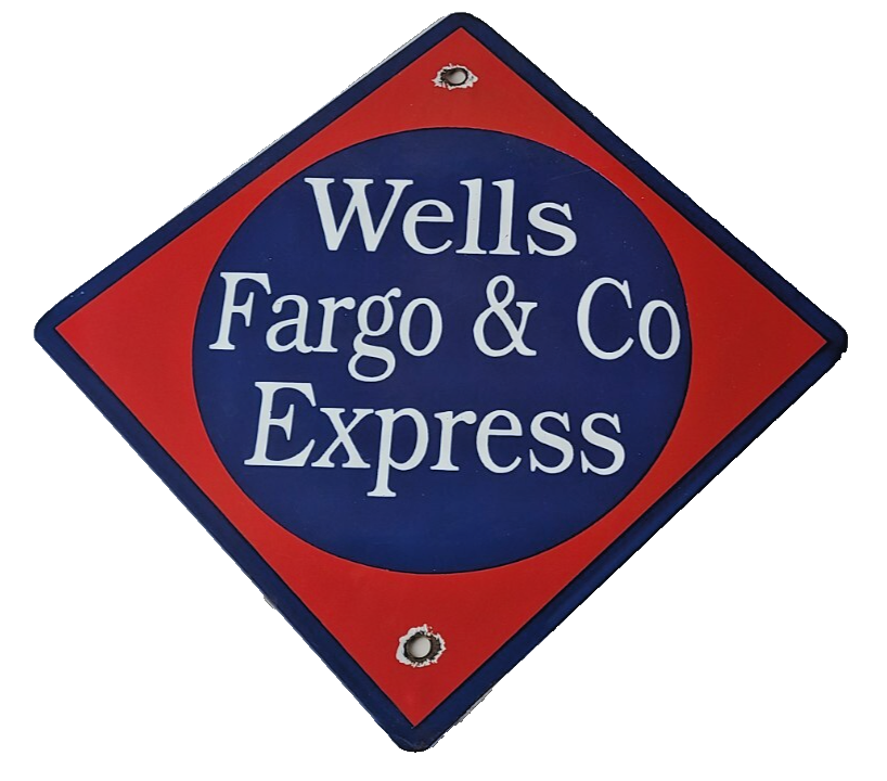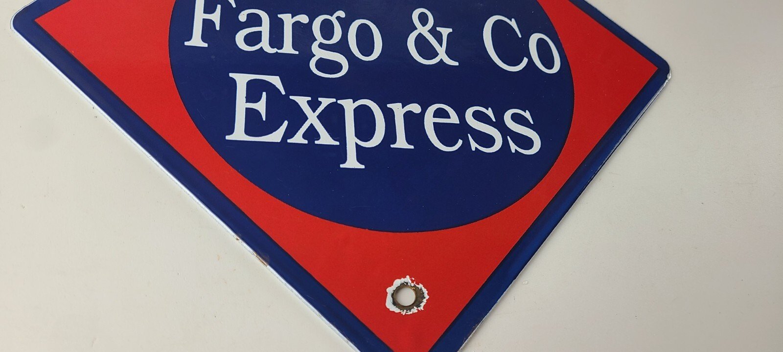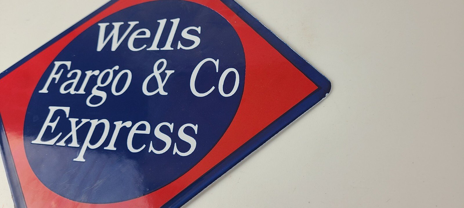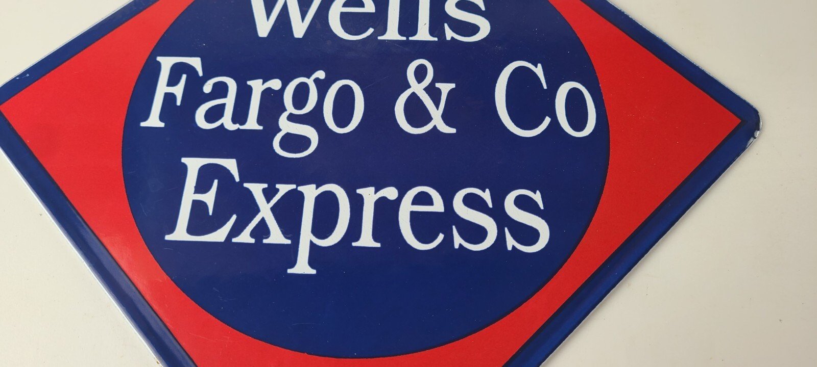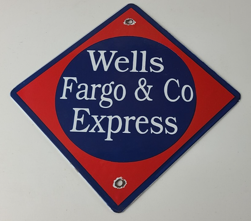 This vintage Wells Fargo & Co Express porcelain sign features the large lettering and has excellent red & dark blue color and made of porcelain. The sign is made of porcelain and measures 8″.