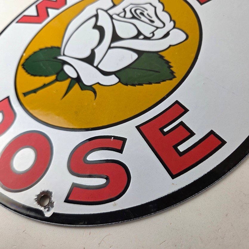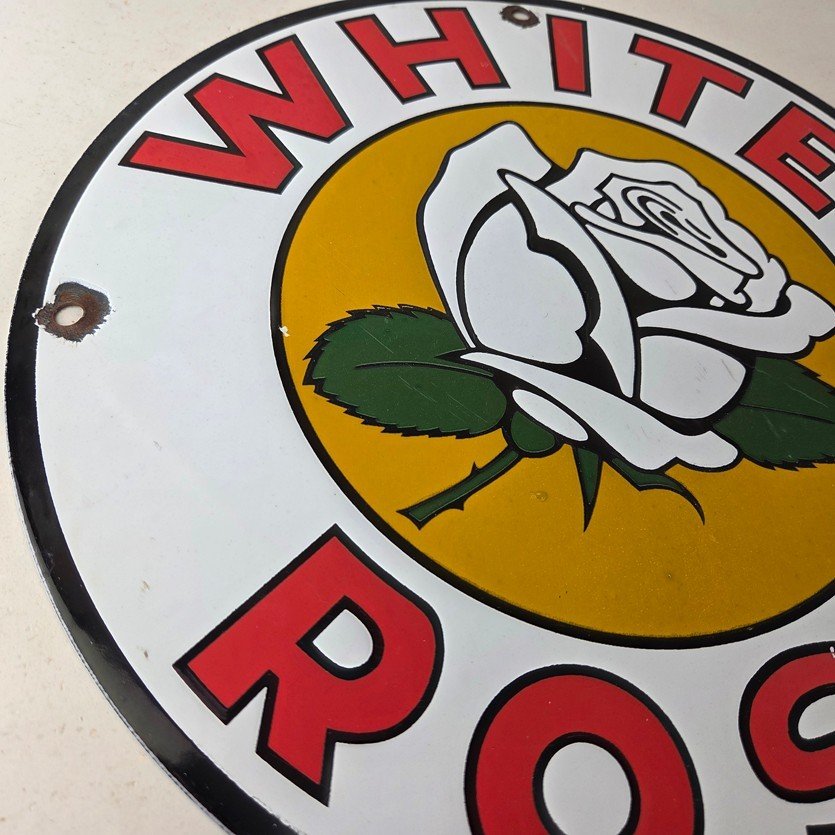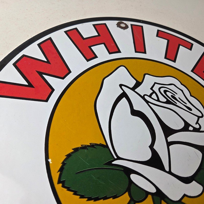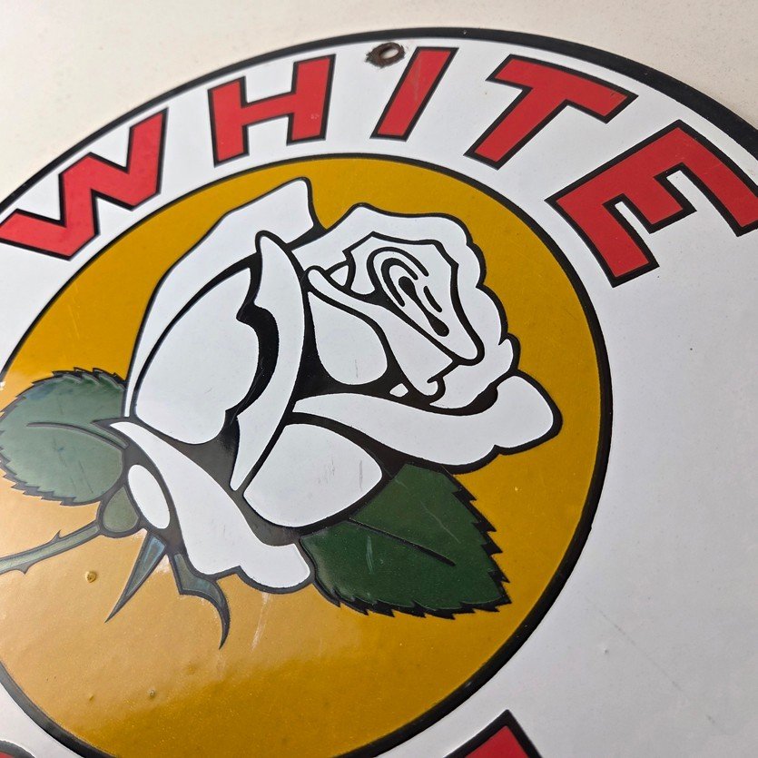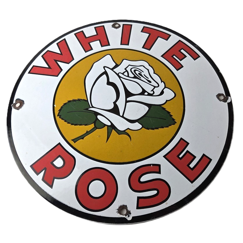 This vintage White Rose Gasoline Porcelain sign measures 11 3/4″ across. It has the neat graphic of the White Rose flower in the center with large lettering around the rim.