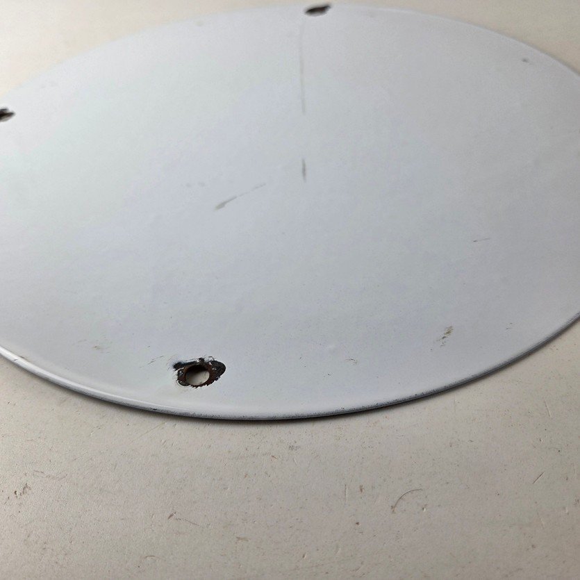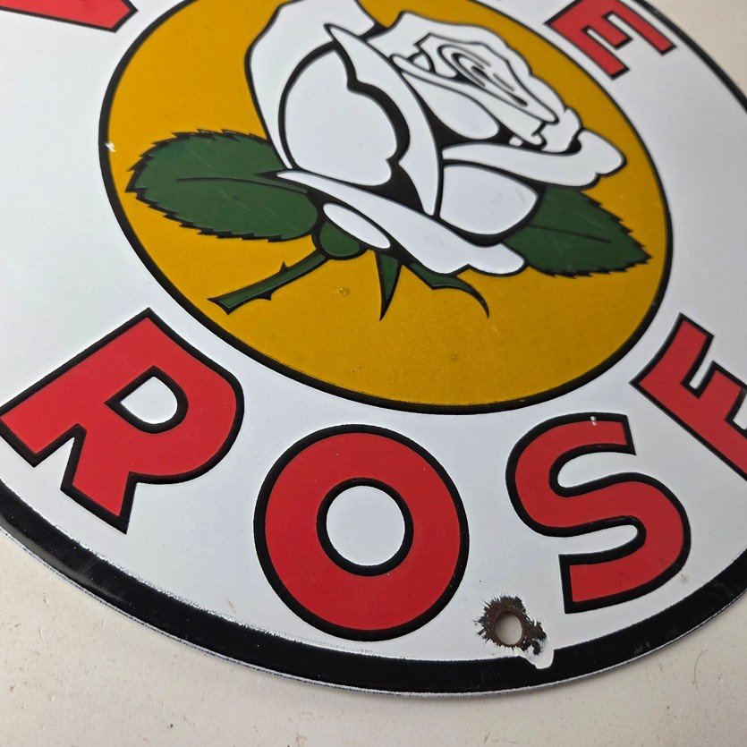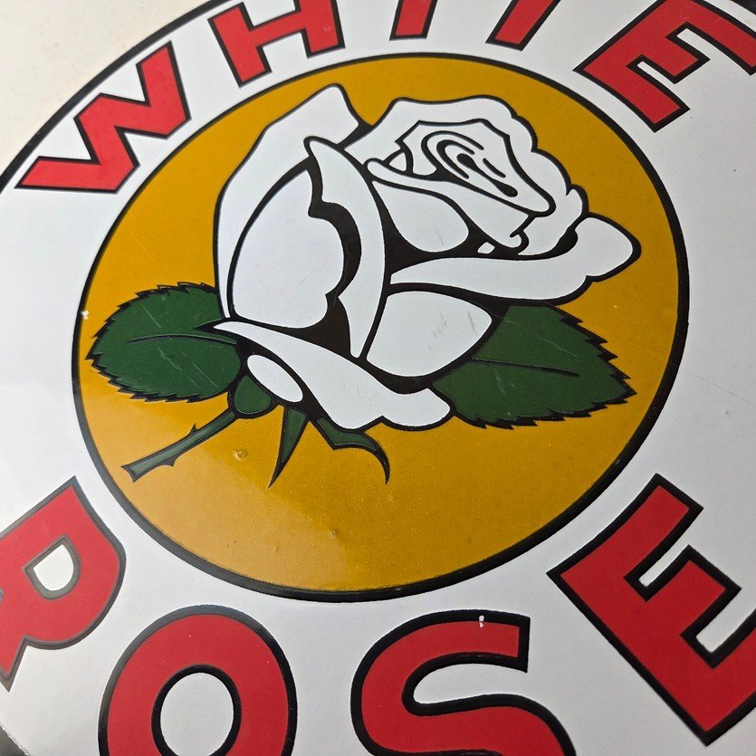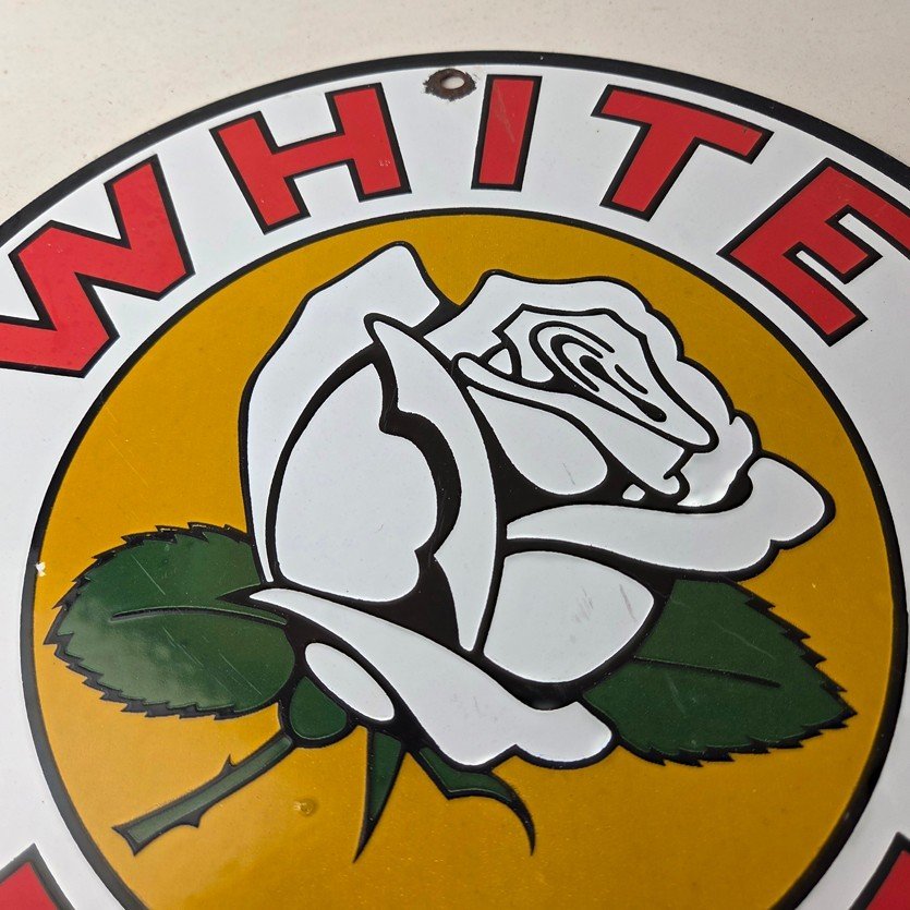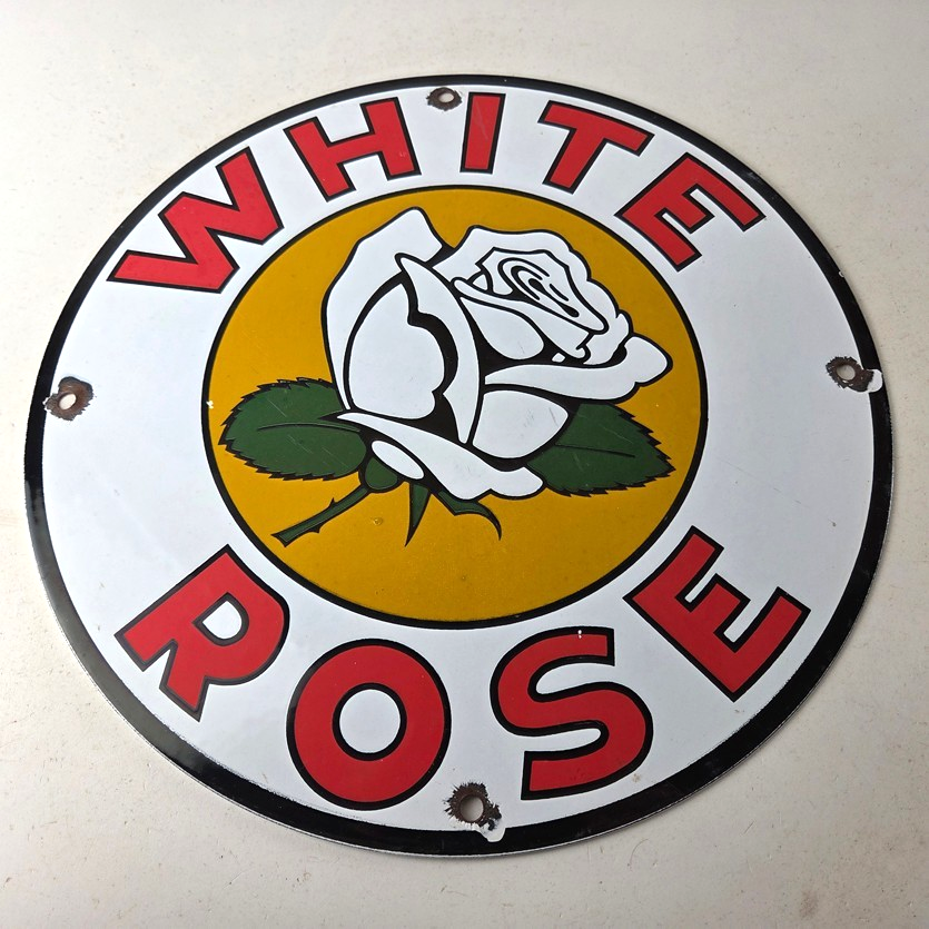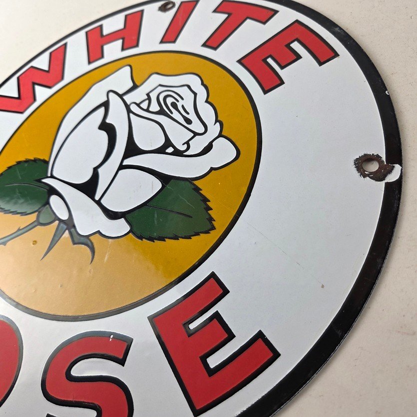 This vintage White Rose Gasoline Porcelain sign measures 11 3/4″ across. It has the neat graphic of the White Rose flower in the center with large lettering around the rim.