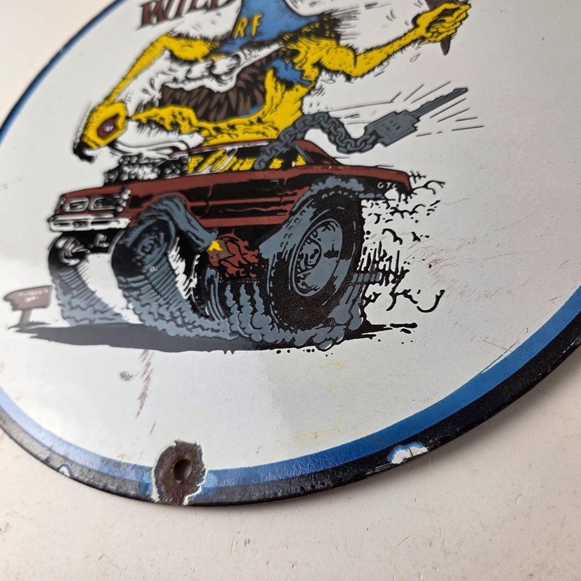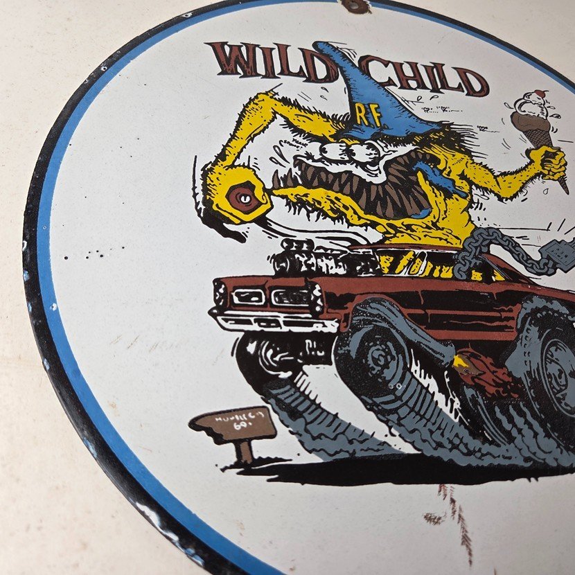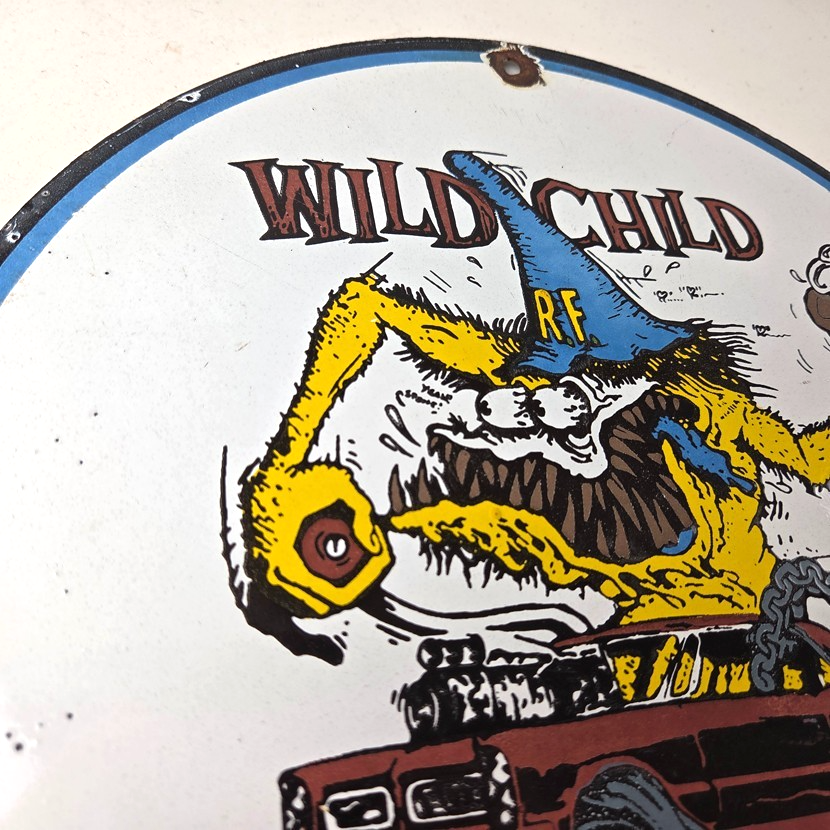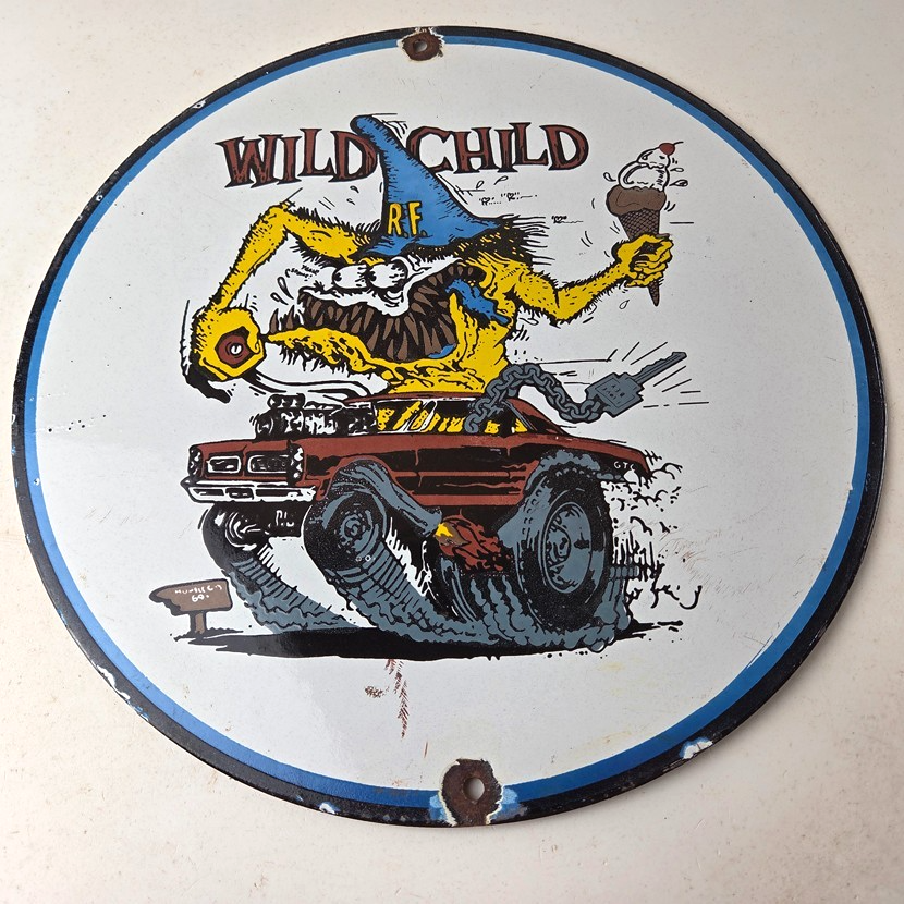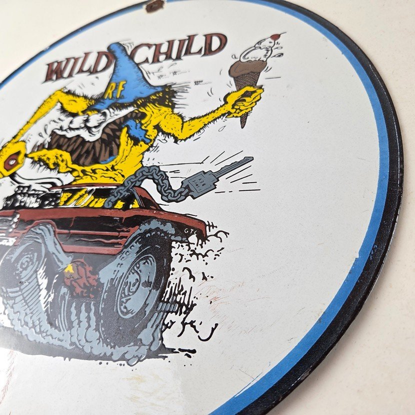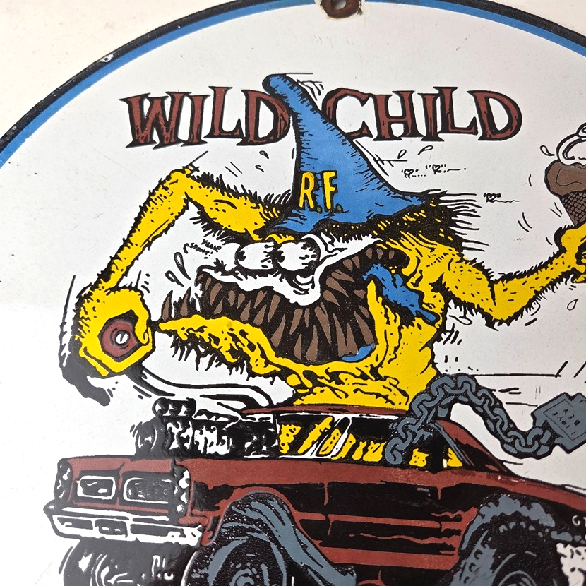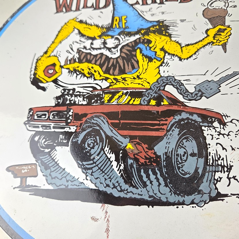 This is a vintage Wild Child Rat Fink porcelain sign (also known as a Rat Fink advertisement mechanic shop), measuring 12 inches round. It features the iconic Ed “Big Daddy” Roth character: the yellow “Wild Child” monster in a blue wizard hat with “RF” on it, riding a massive red hot rod monster truck with blower, chains, huge tires kicking up smoke and dirt, holding an ice cream cone in one claw and a pistol in the other, motion lines and wild grin — a classic Rat Fink Wild Child hot rod advertising sign.