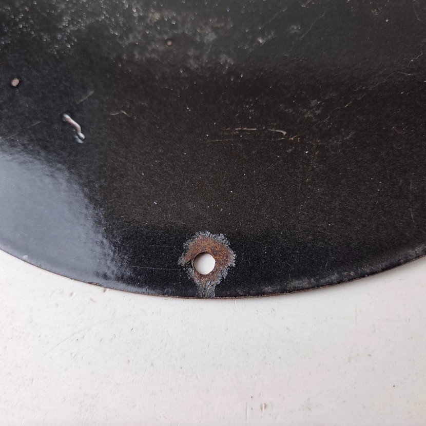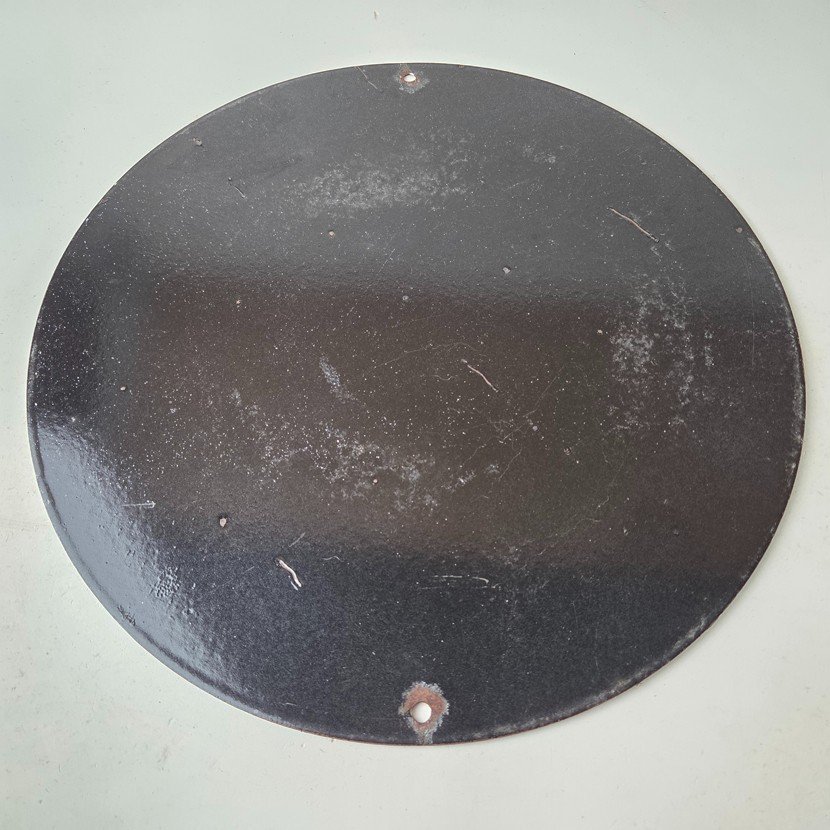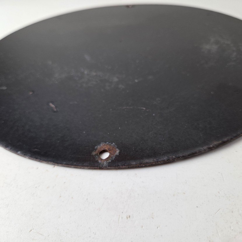 Made of porcelain enamel on steel with patina and wear: rust spotting around the mounting holes, minor edge chips, light surface scratches, and minimal discoloration. This is a porcelain enamel advertising sign in excellent condition, exactly as shown in the photos.