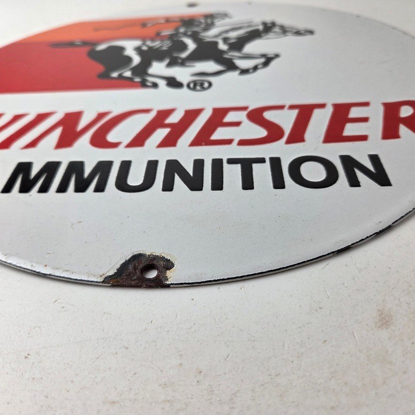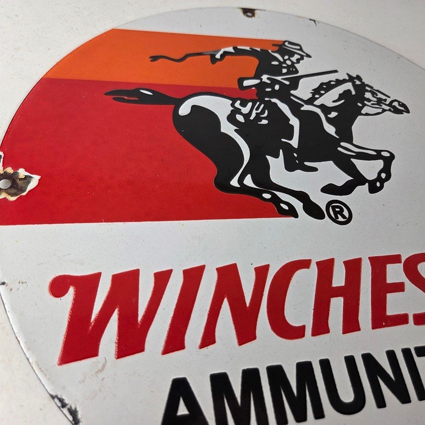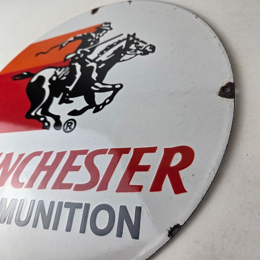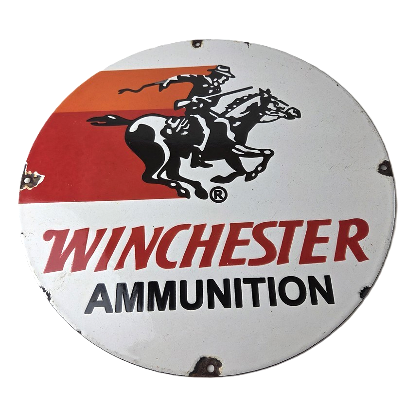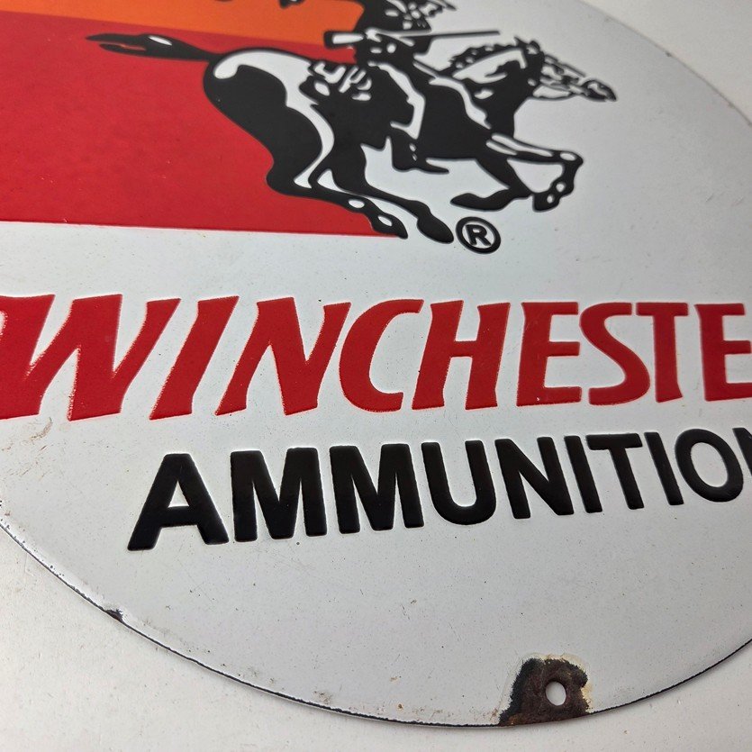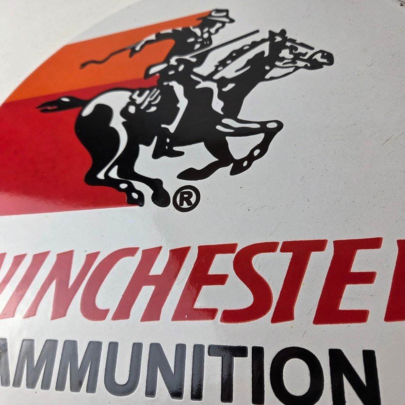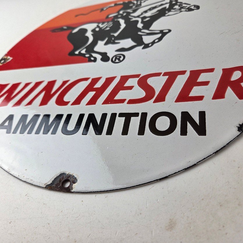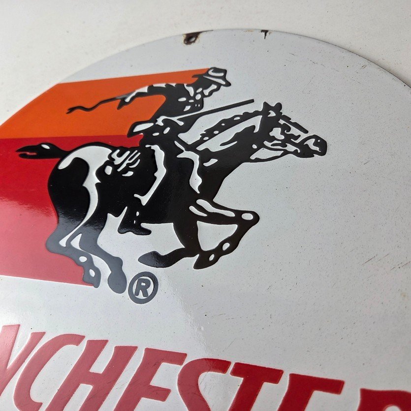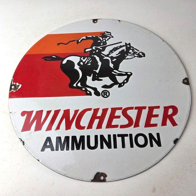 This vintage Winchester sign is a must-have for any collector of gas and outdoor sports memorabilia. Made of durable porcelain, it features the iconic Winchester lettering in the center and the is perfect for display in a garage or man cave. Measuring at 12 inches, it is a great size for display in a service station or man cave.