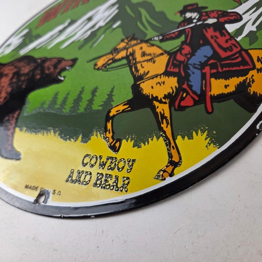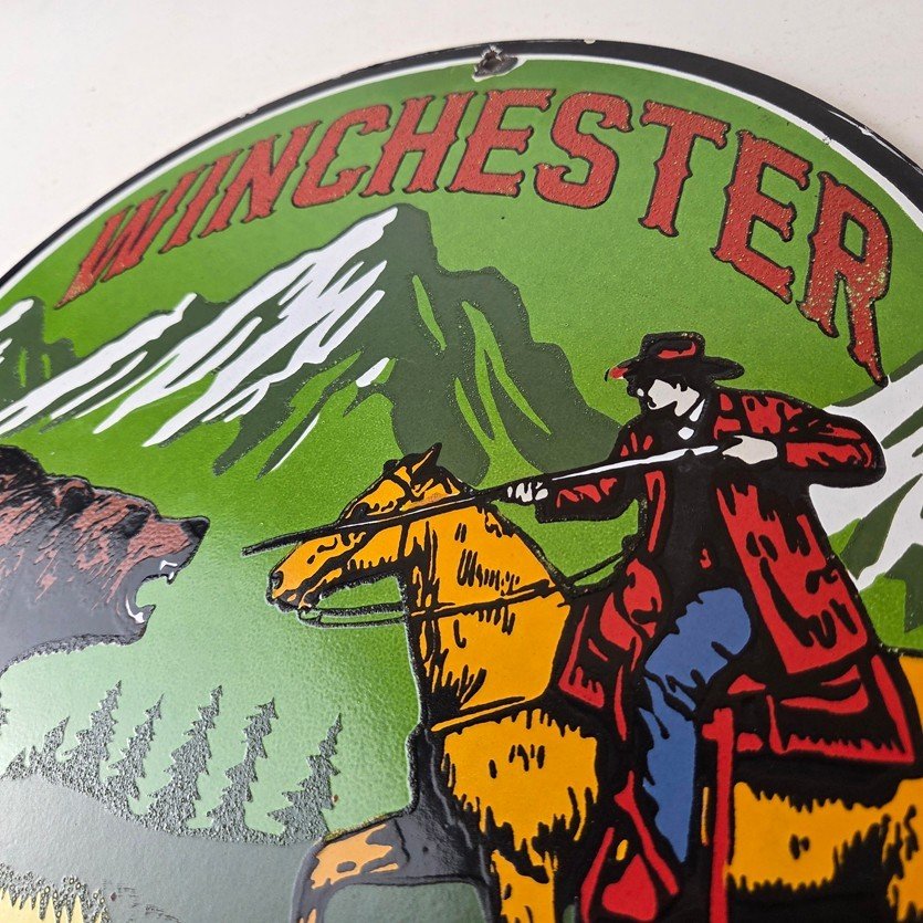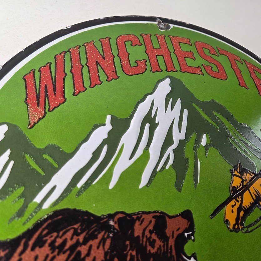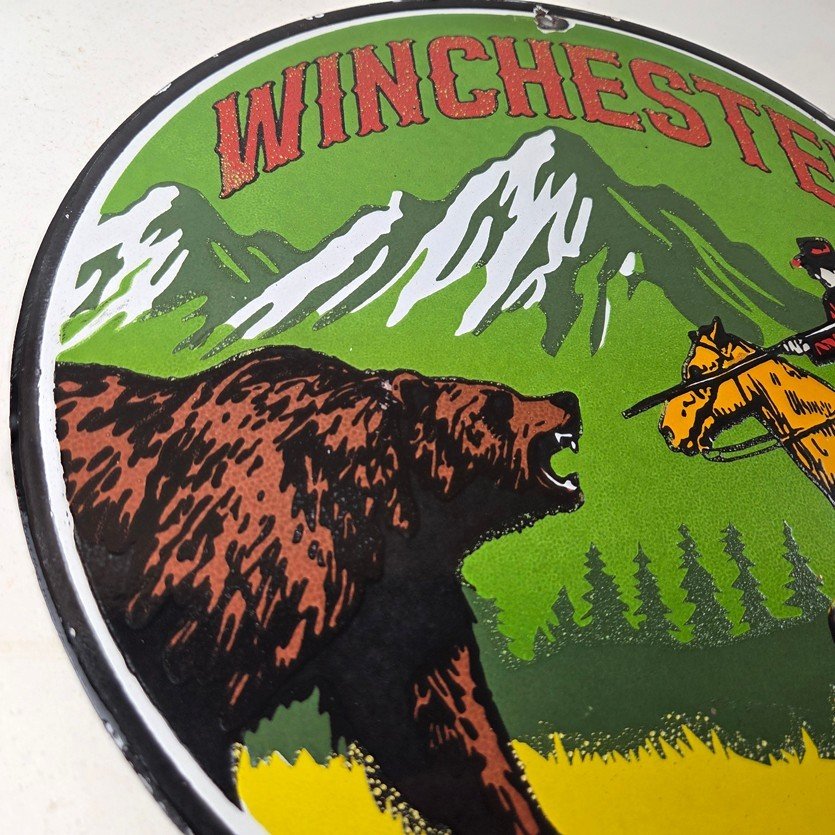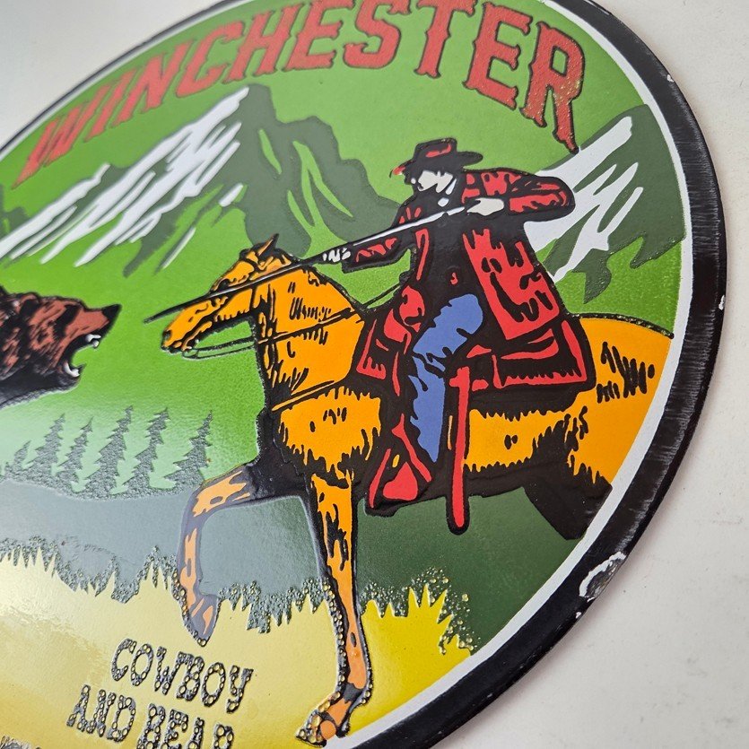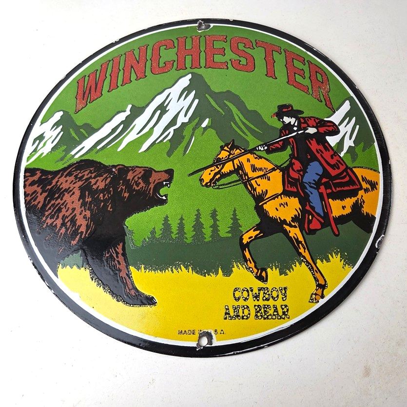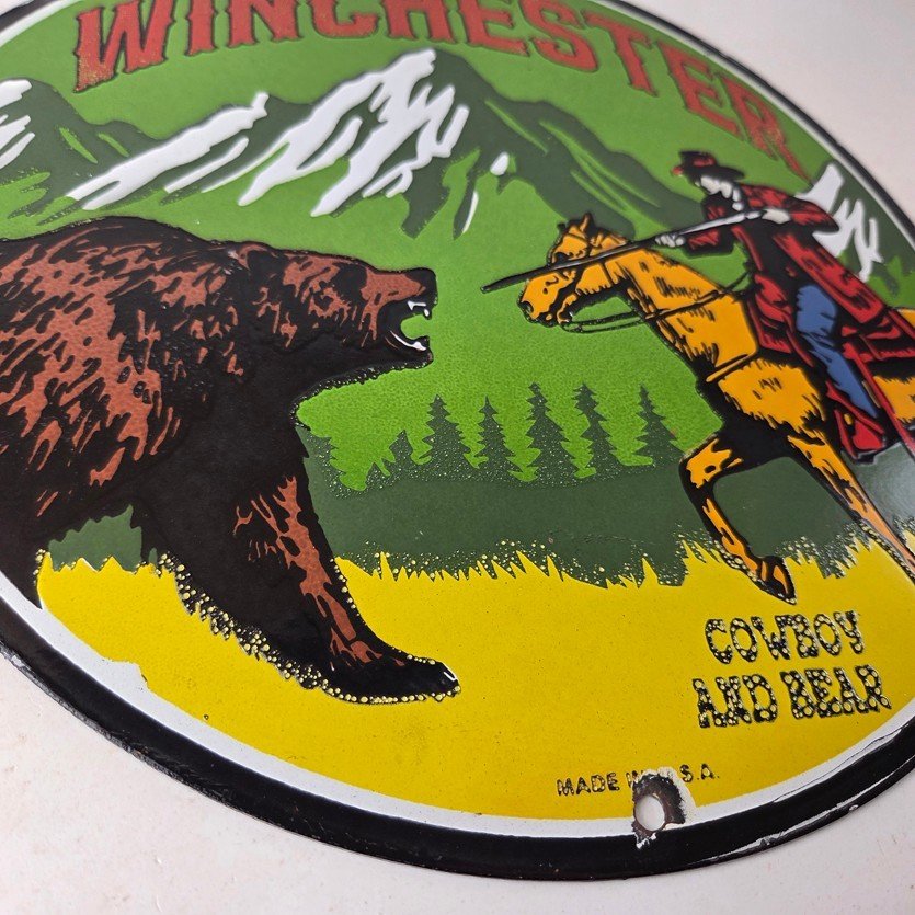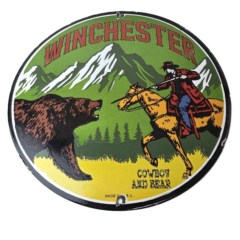 Vintage Winchester Cowboy and Bear Porcelain Firearm Sign.