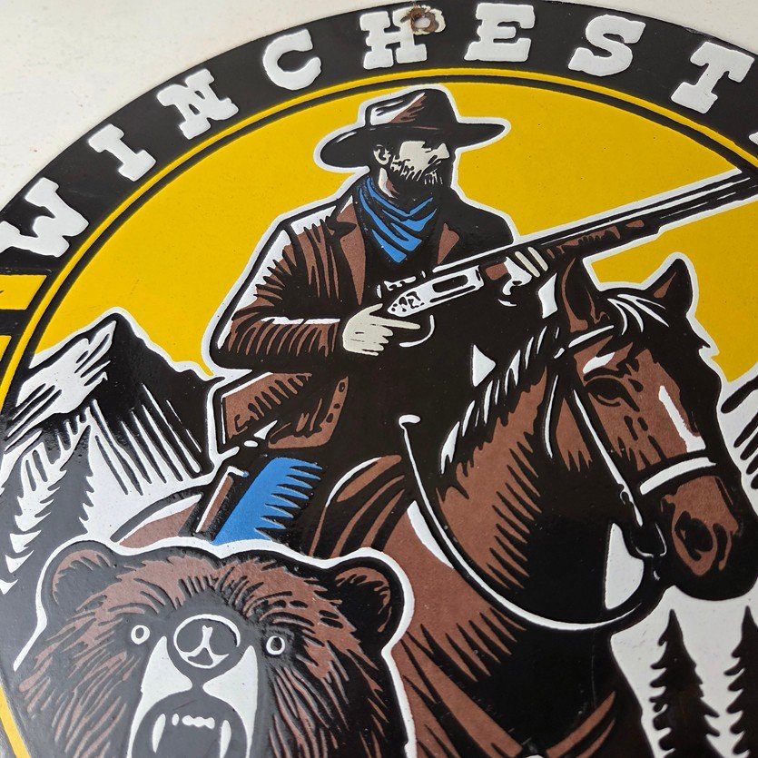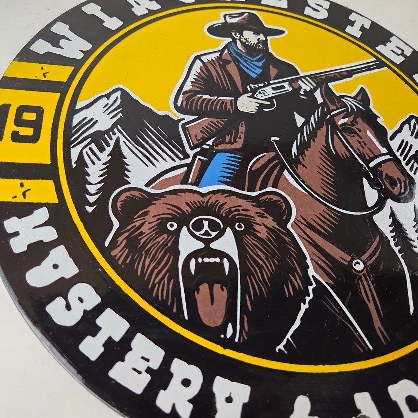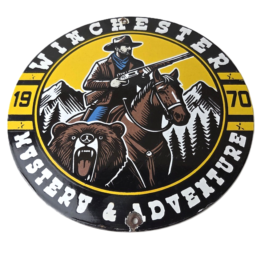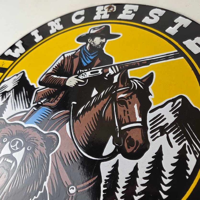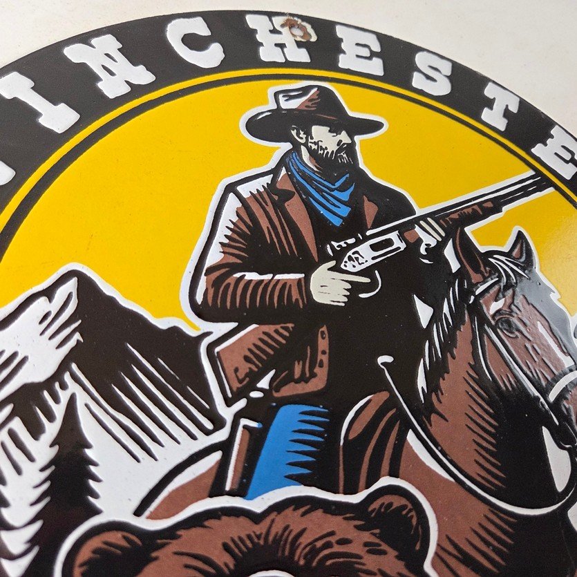 Vintage Winchester Cowboy and Bear Porcelain Firearm Sign.