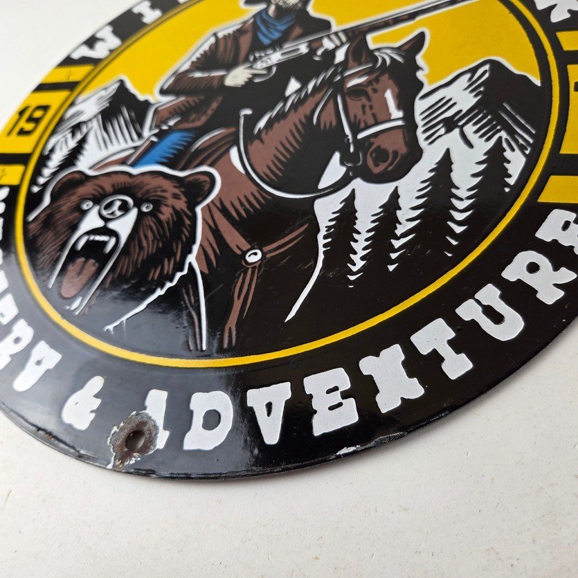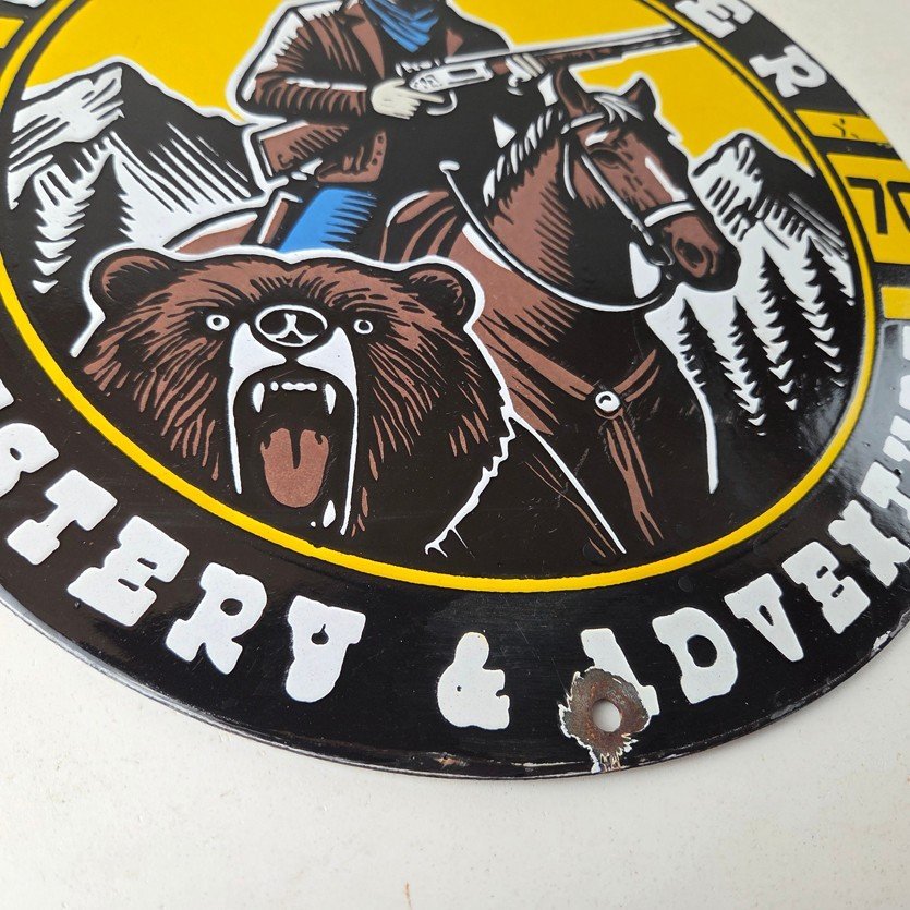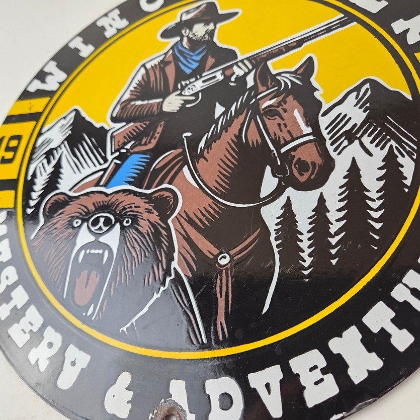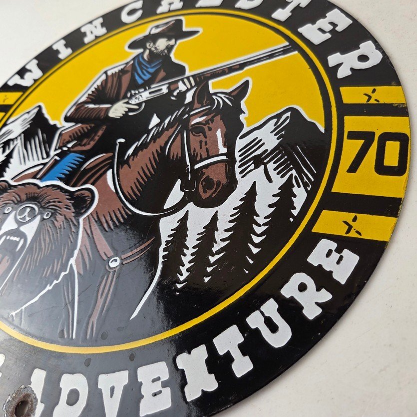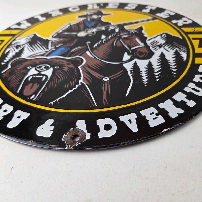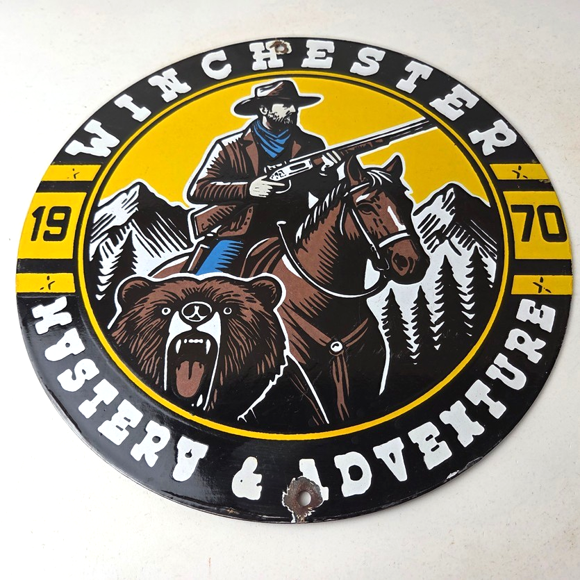 Vintage Winchester Cowboy and Bear Porcelain Firearm Sign.