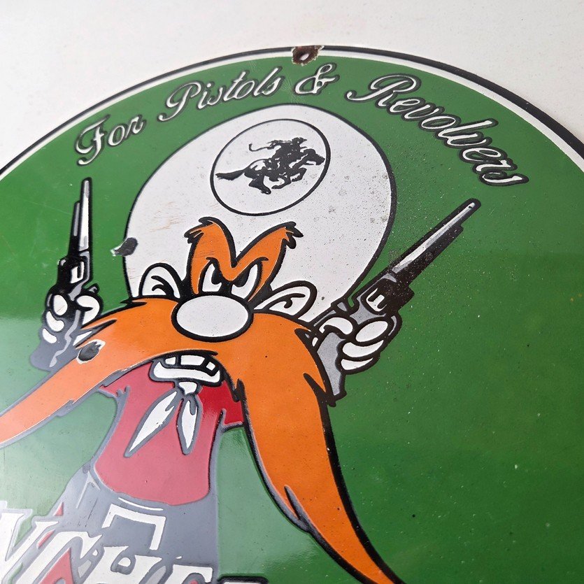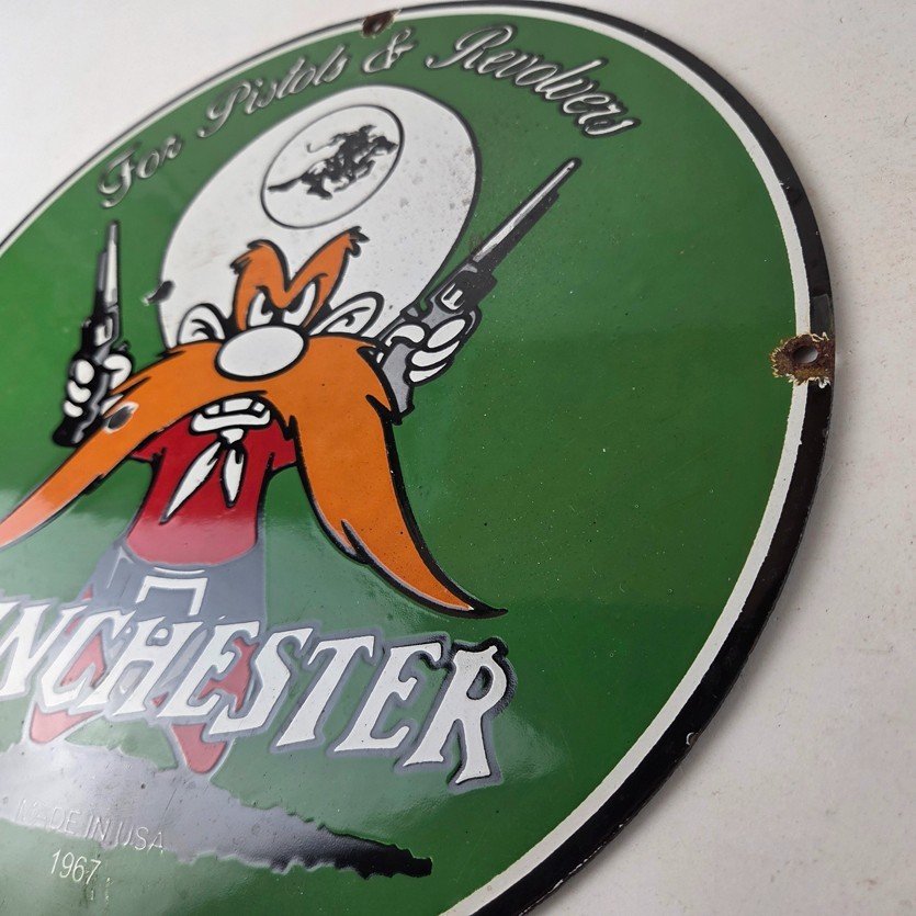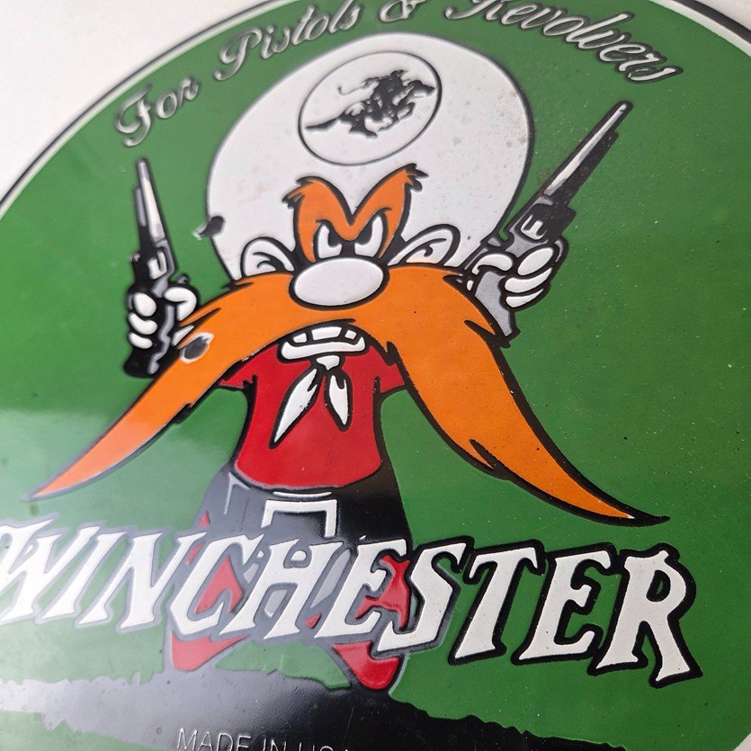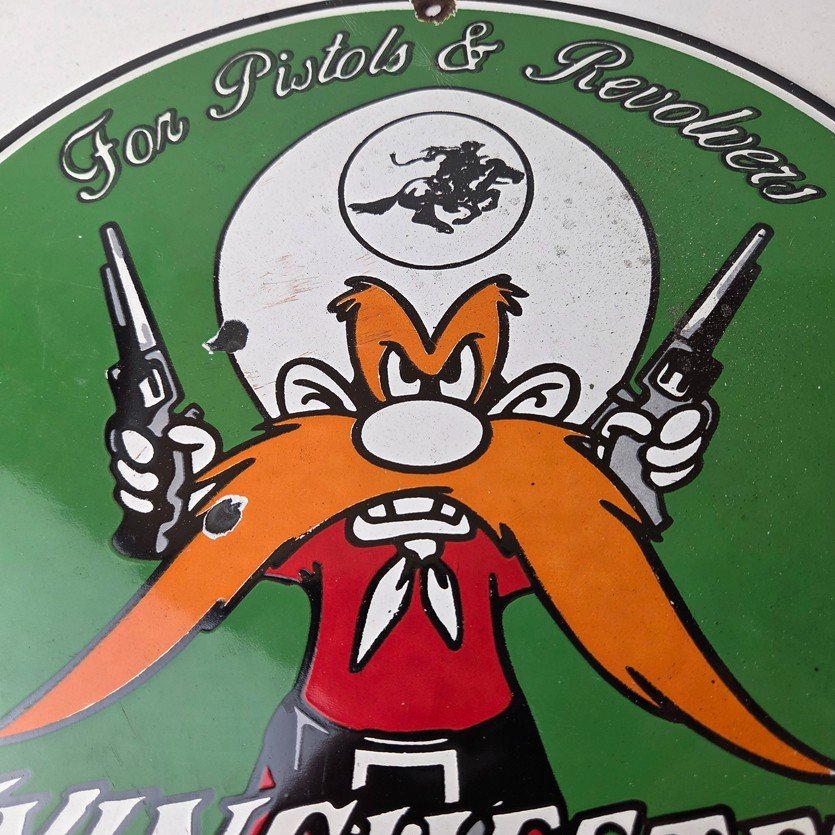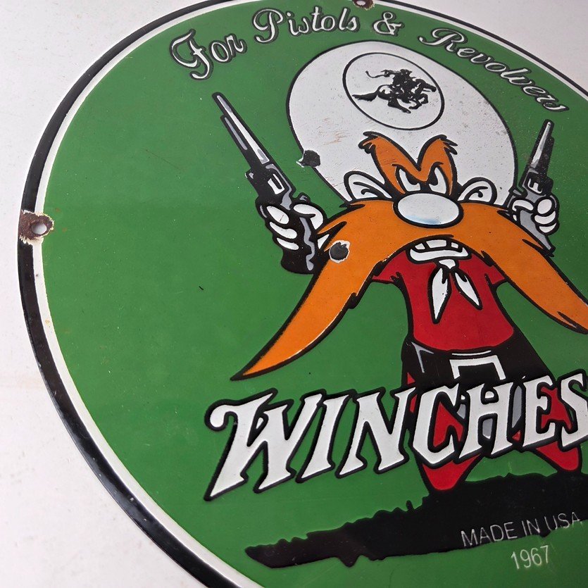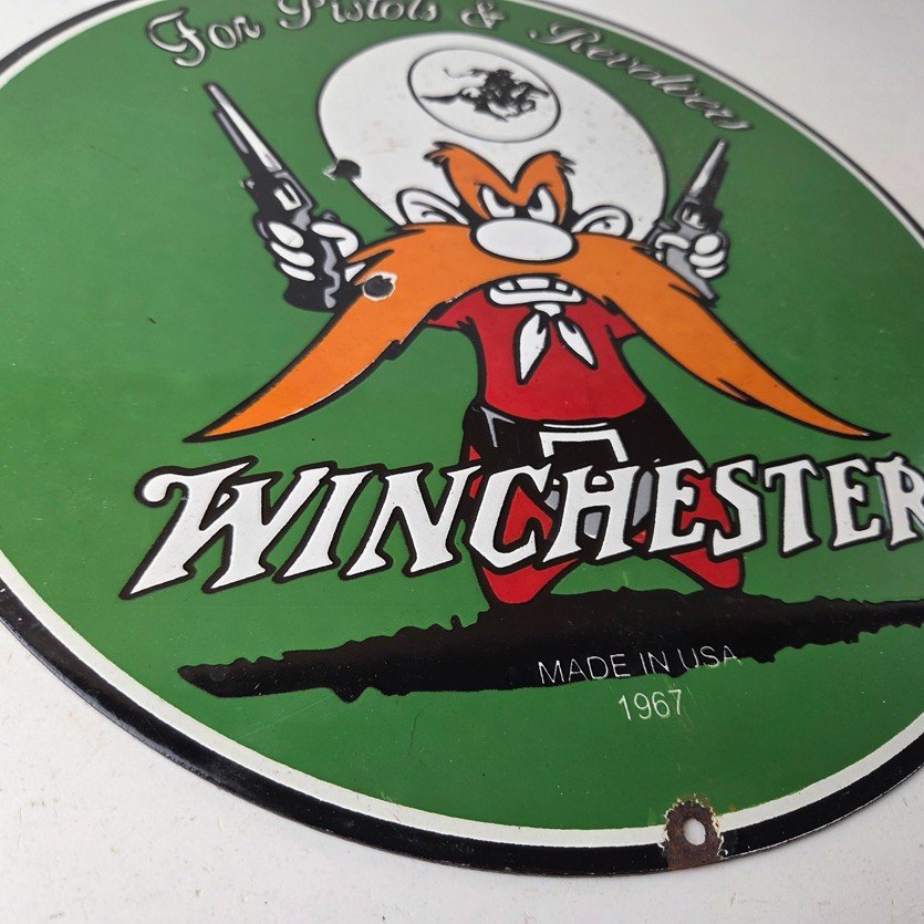 Vintage Winchester Pistols and Revolvers Porcelain Hunting Firearm sign.