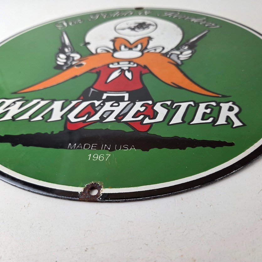 This vintage Winchester sign is a must-have for any collector of gas and outdoor sports memorabilia. Made of durable porcelain enamel, it features the iconic Winchester horse graphic at the top and is perfect for display in a garage or man cave. Measuring at 12 inches, it is a great size for display in a service station or man cave. With its bright colors and classic design, this sign is sure to catch the eye of anyone who appreciates Winchester advertising. Whether you’re a fan of firearms or advertising, this Winchester gas service pump plate is a great addition to any collection.