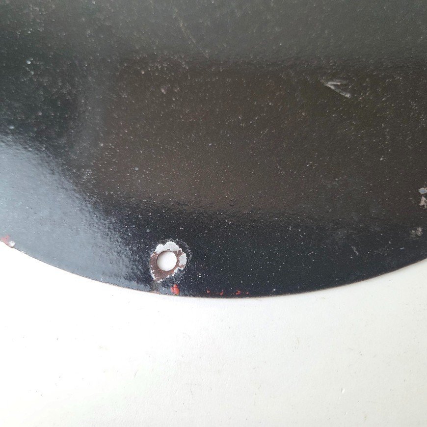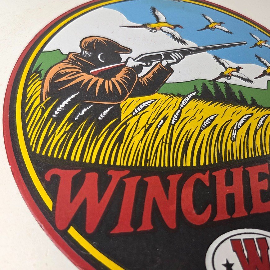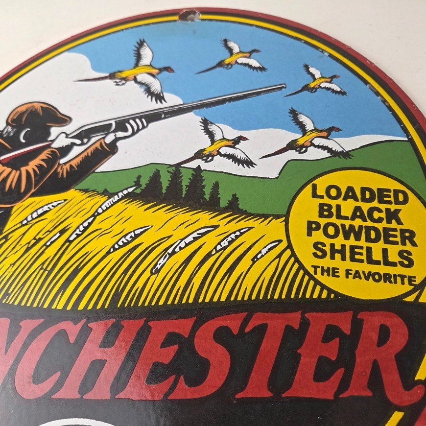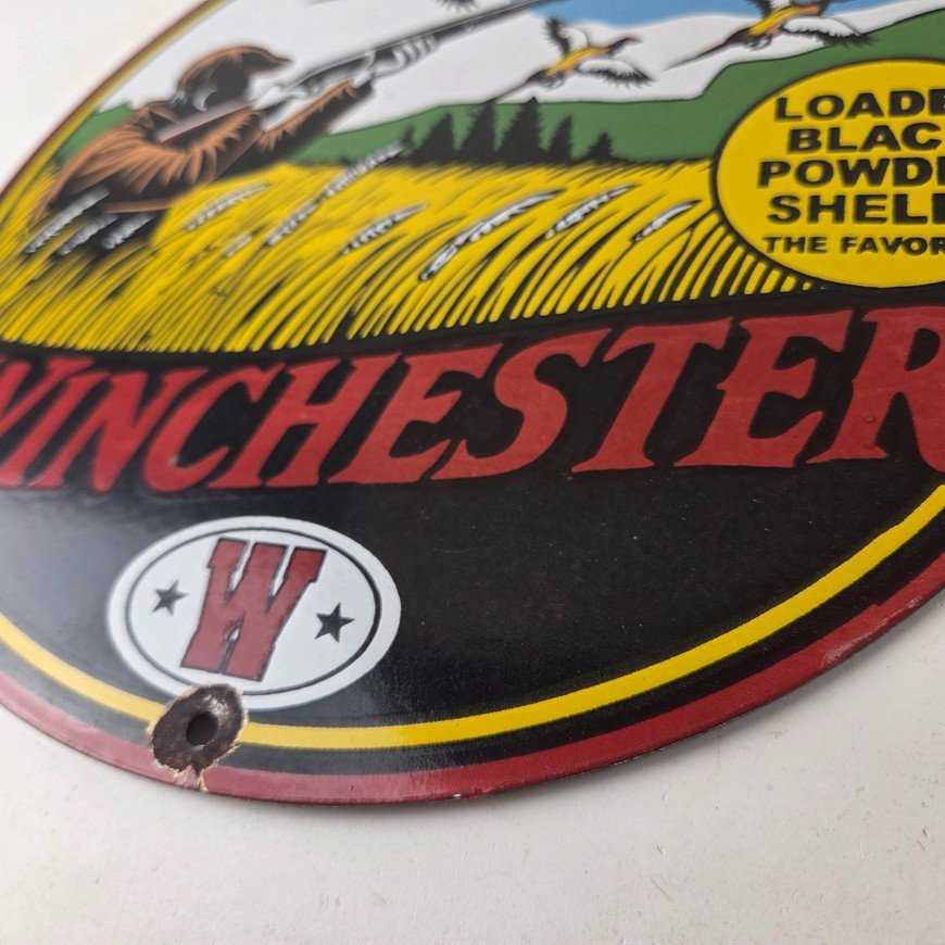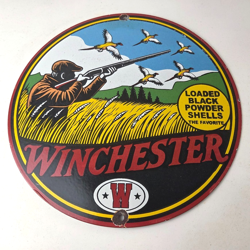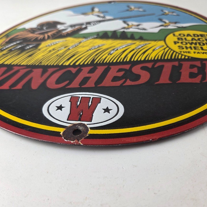 This vintage Winchester porcelain sign features the iconic Winchester firearm brand and is perfect for collectors of hunting and outdoor sports memorabilia. Measuring 12″ in diameter, this red sign is sure to catch the eye of any gas and oil enthusiast.