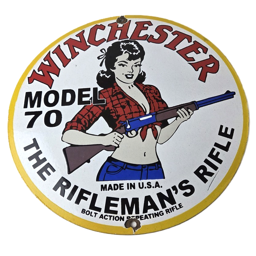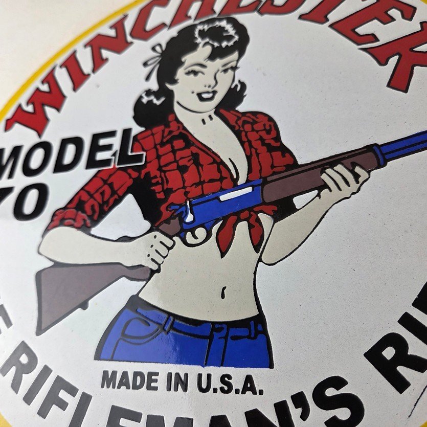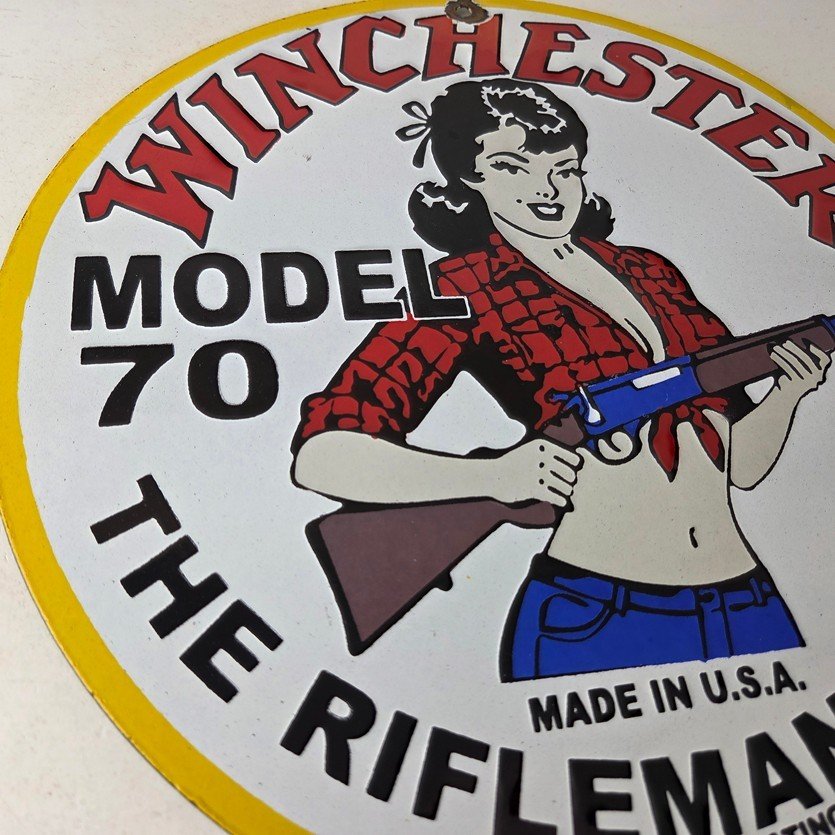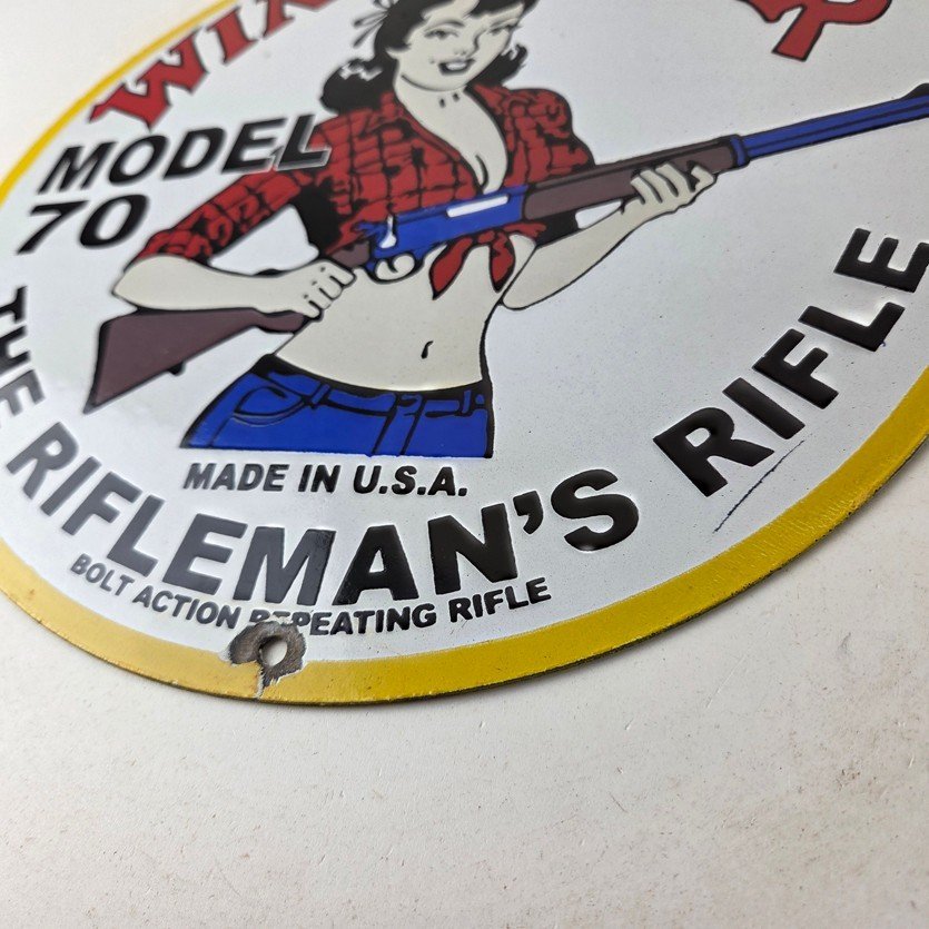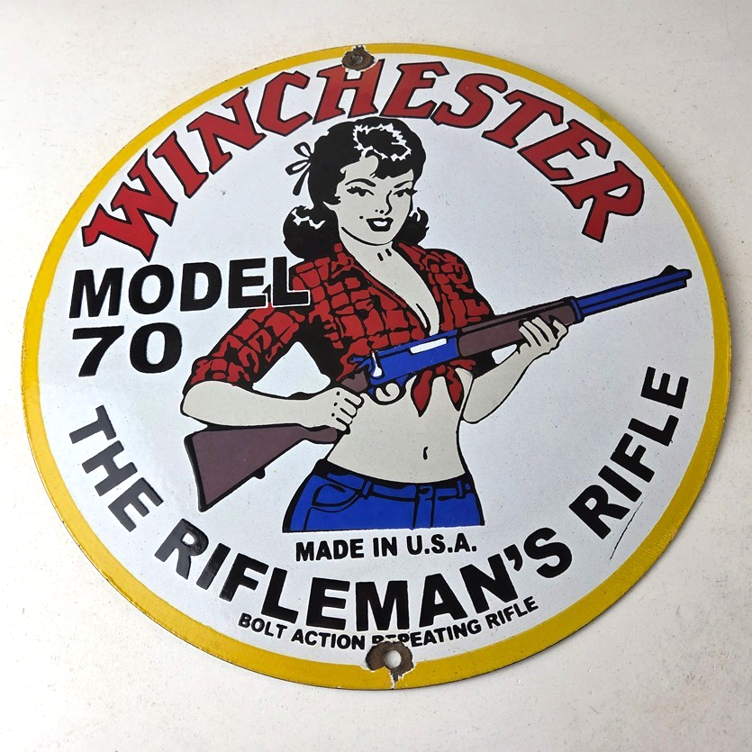 Vintage Winchester Porcelain Sign – Rifleman's Model 70 Gas Service Pump Sign