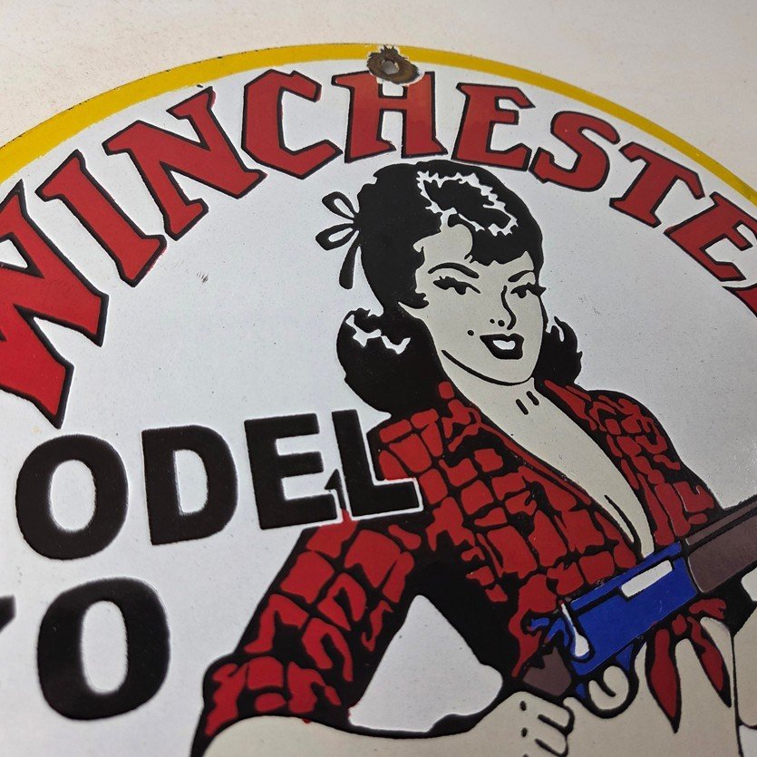 This vintage Winchester sign is a must-have for any collector of gas and outdoor sports memorabilia. Made of durable porcelain enamel, it features the iconic Winchester pinup girl graphic and is perfect for display in a garage or man cave. Measuring at 12 inches, it is a great size for display in a service station or man cave. With its bright colors and classic design, this sign is sure to catch the eye of anyone who appreciates Winchester advertising. Whether you’re a fan of firearms or advertising, this Winchester gas service pump plate is a great addition to any collection.