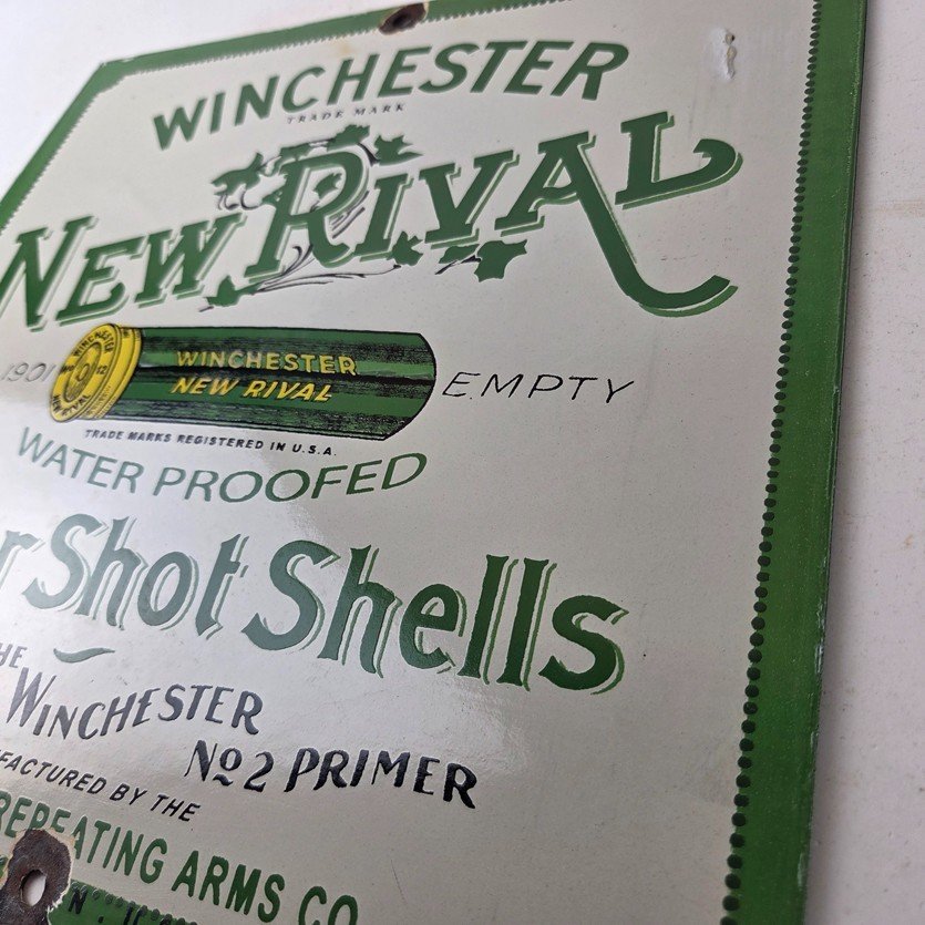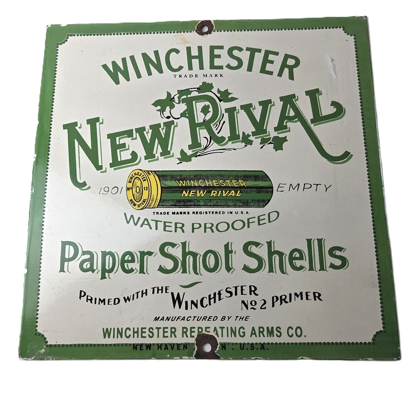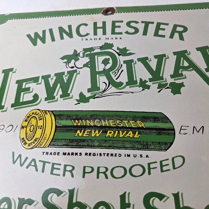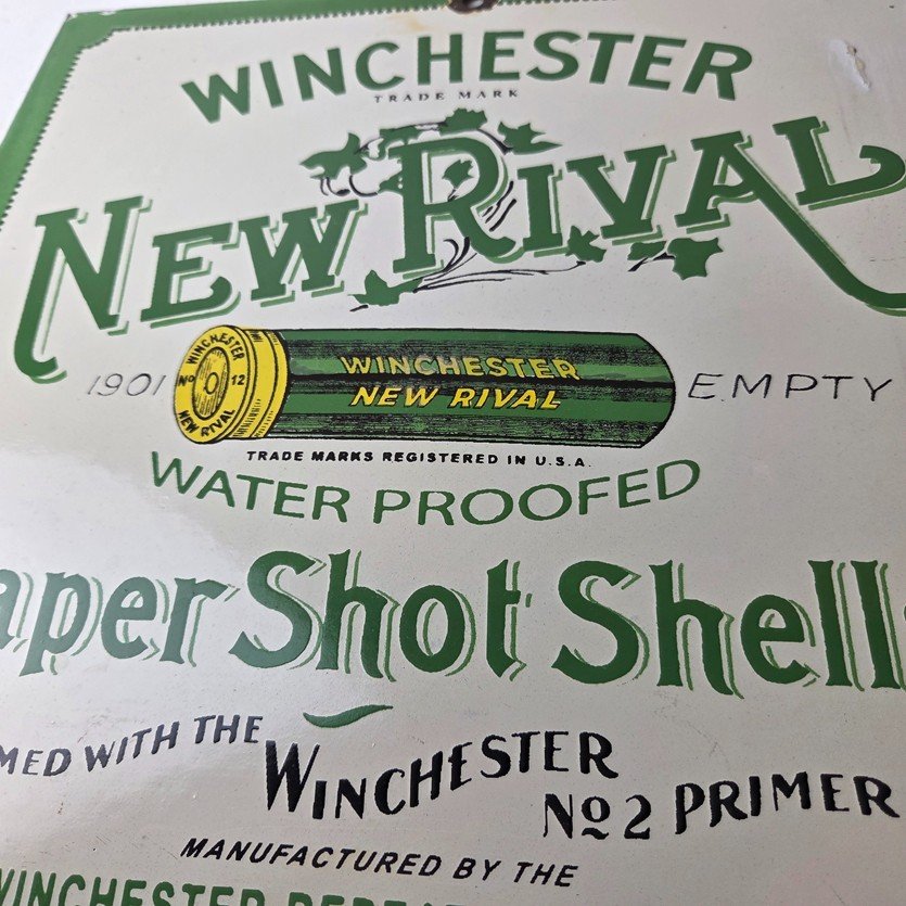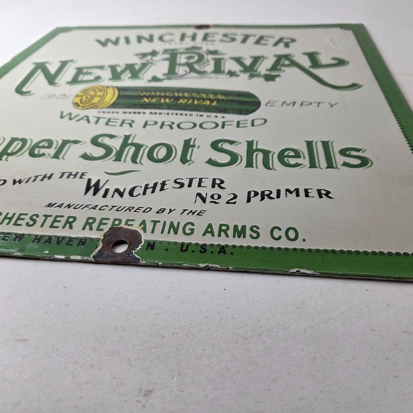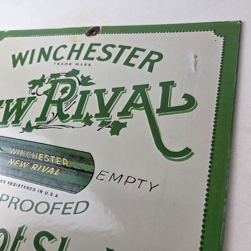 This vintage Winchester porcelain sign features the iconic Winchester firearm brand and is perfect for collectors of hunting and outdoor sports memorabilia. Measuring 12″ in diameter, this red sign is sure to catch the eye of any gas and oil enthusiast.