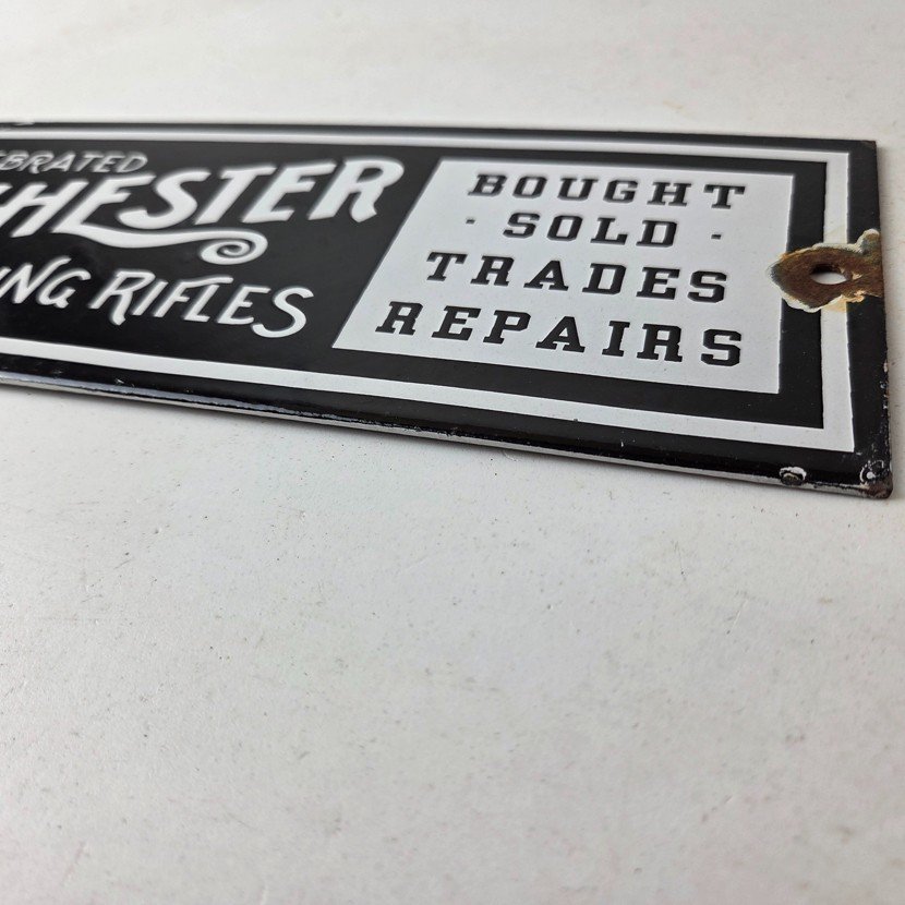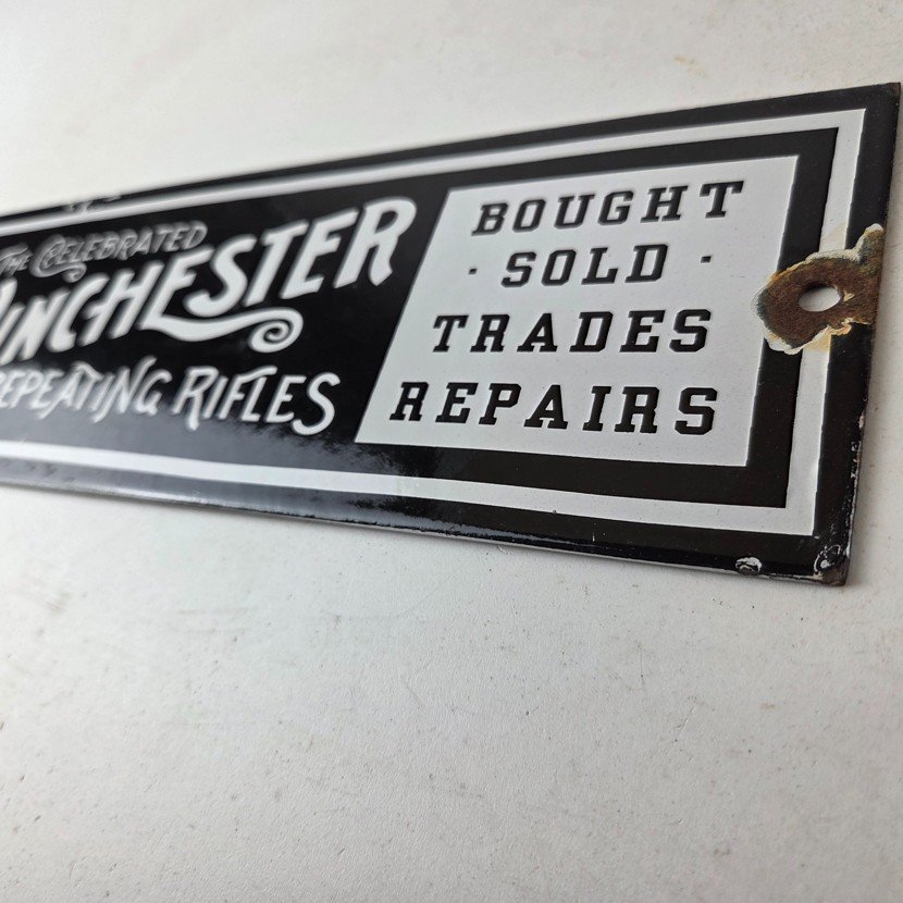 This is a vintage Winchester Repeating Rifles porcelain sign (also known as a Winchester porcelain advertising sign), measuring approximately 11 1/2 inches long by 4 inches high (rectangular shape). It features the classic old-west style lettering: “THE CELEBRATED WINCHESTER” in ornate white script across the top with decorative flourishes, “REPEATING RIFLES” below, and a framed panel on the right reading “BOUGHT · SOLD · TRADES REPAIRS” — a classic Winchester firearms advertising sign.