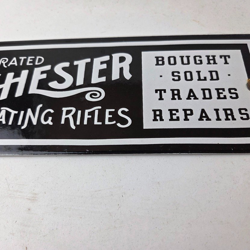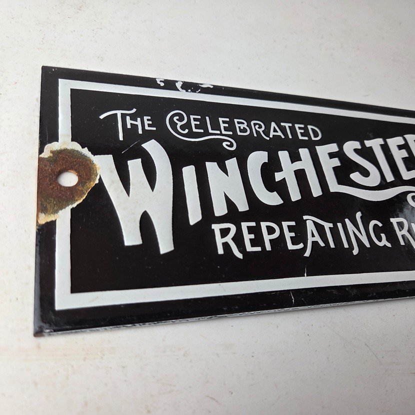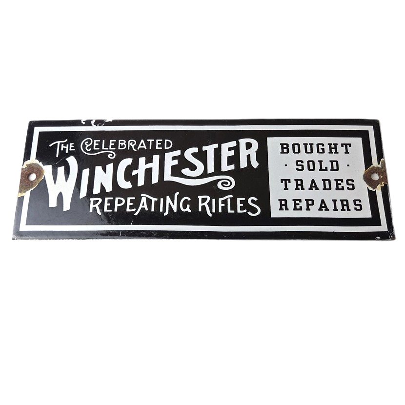 This vintage Winchester repeating rifles sign makes a great addition to a garage, shop display, man cave, gun room, or any Winchester memorabilia collection, vintage firearms advertising collection, or Western memorabilia collection.