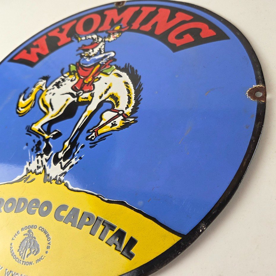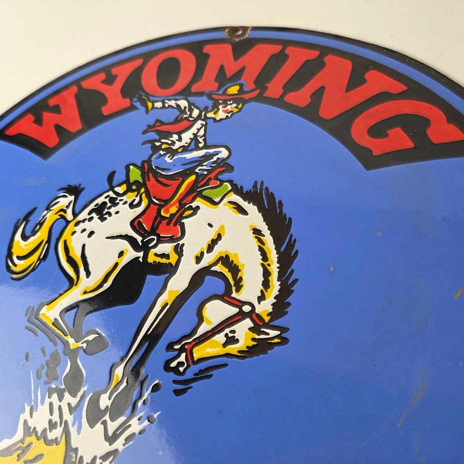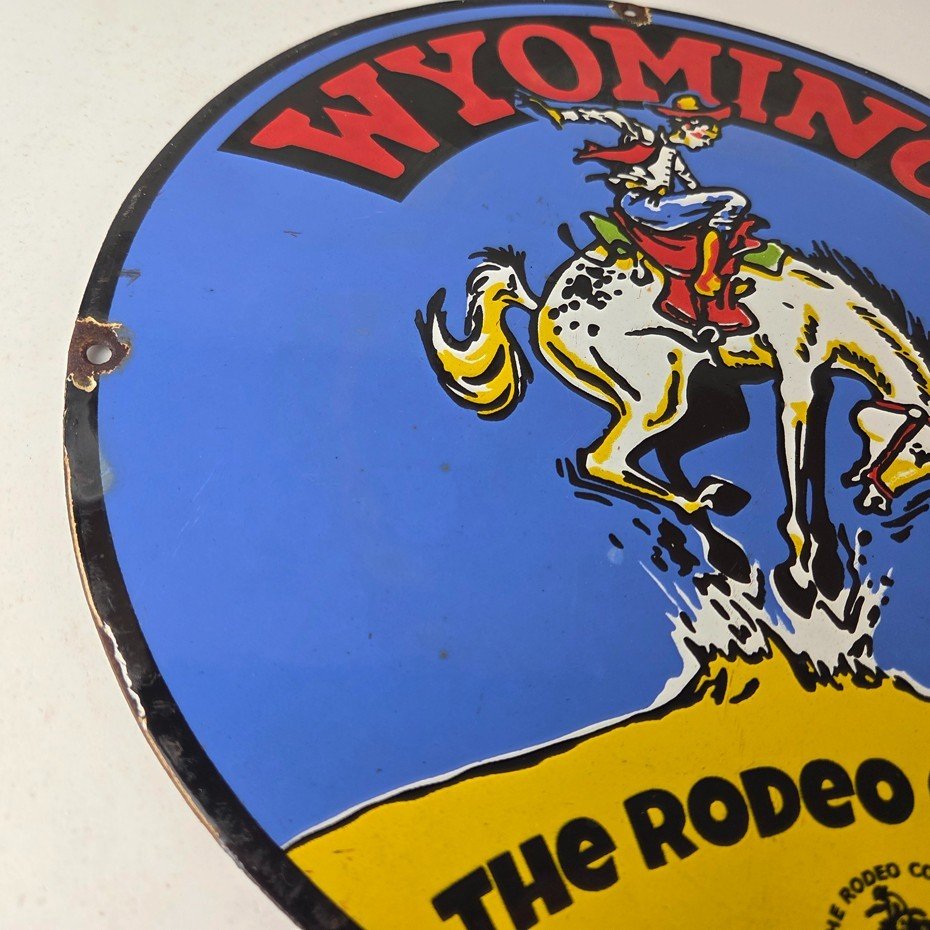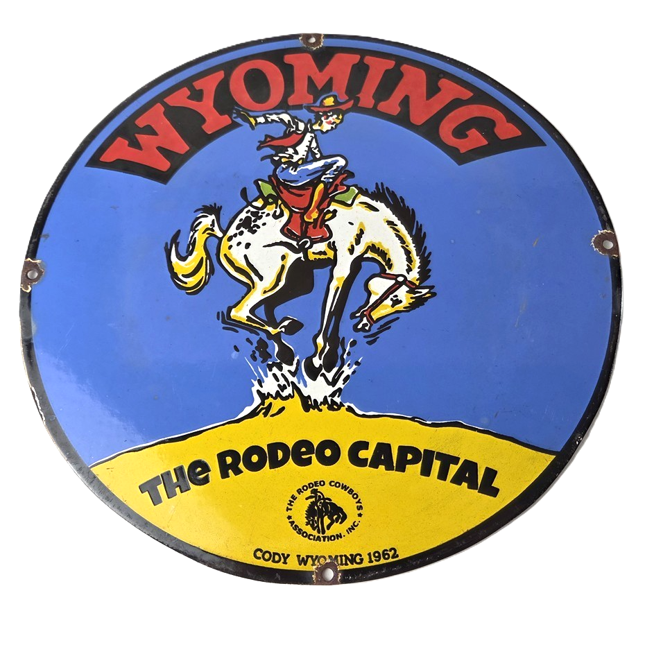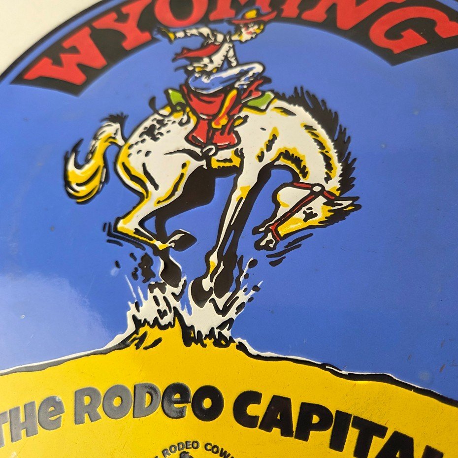 This vintage Wyoming – The Rodeo Capital porcelain sign features really nice graphic of the buckin bronco rodeo. This sign is made of porcelain and measures 12″ across.