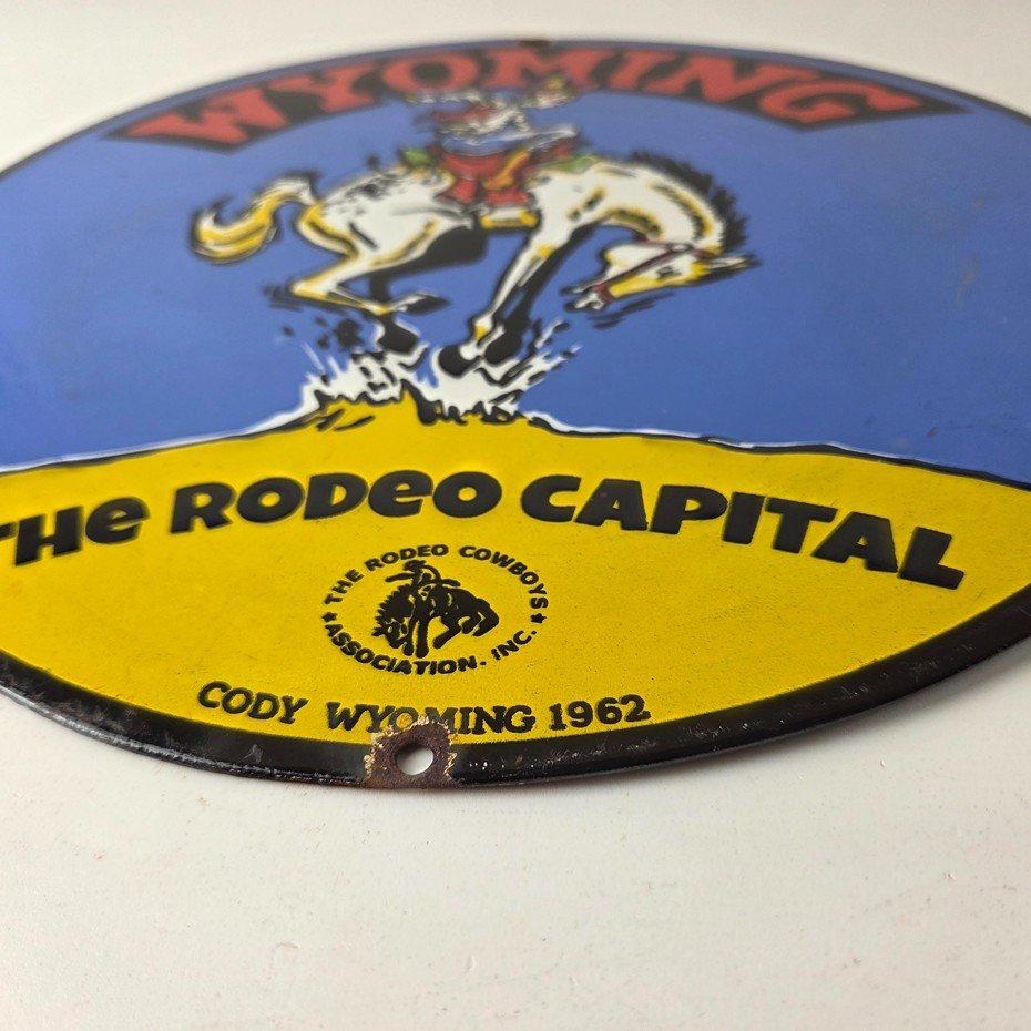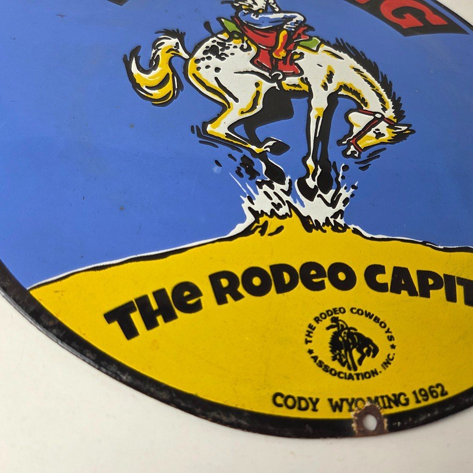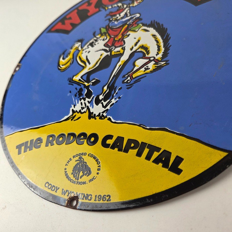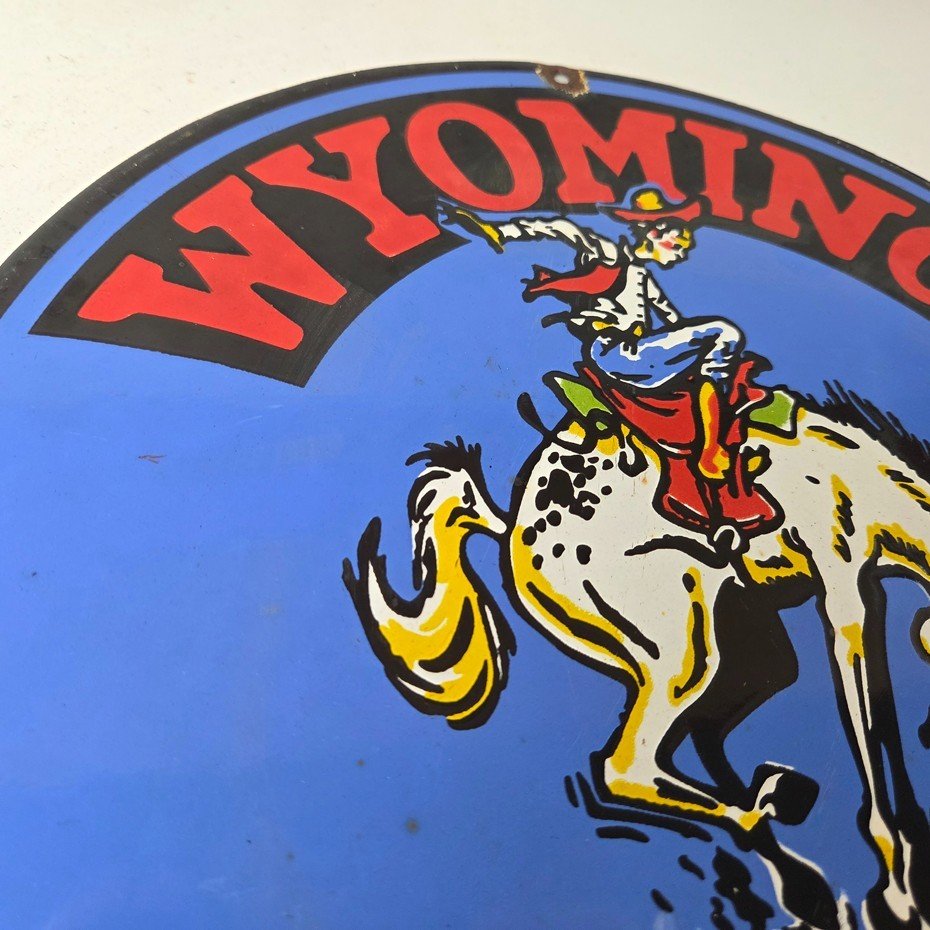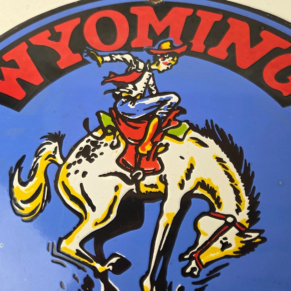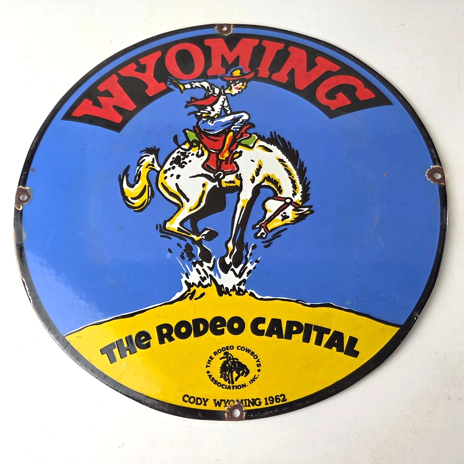 This vintage Wyoming – The Rodeo Capital porcelain sign features really nice graphic of the buckin bronco rodeo. This sign is made of porcelain and measures 12″ across.