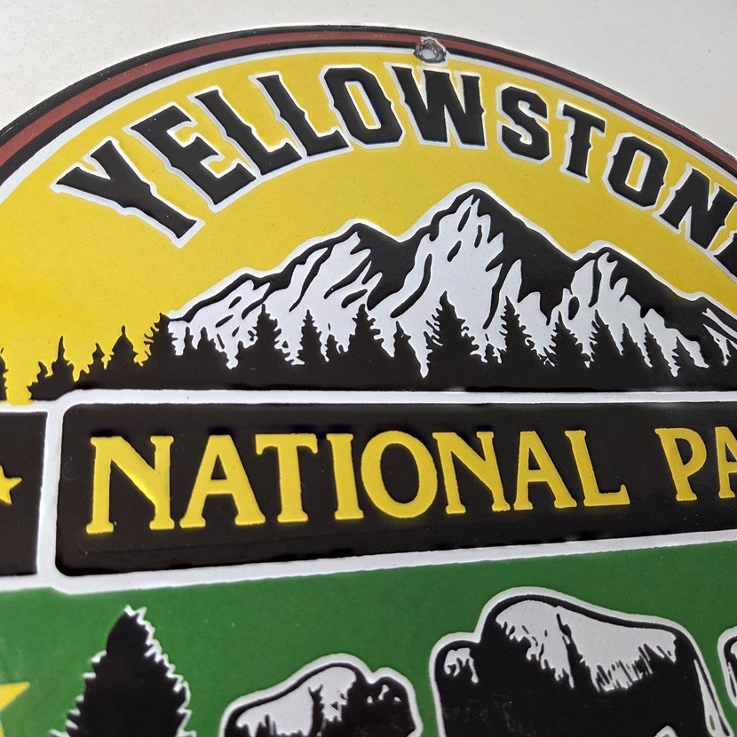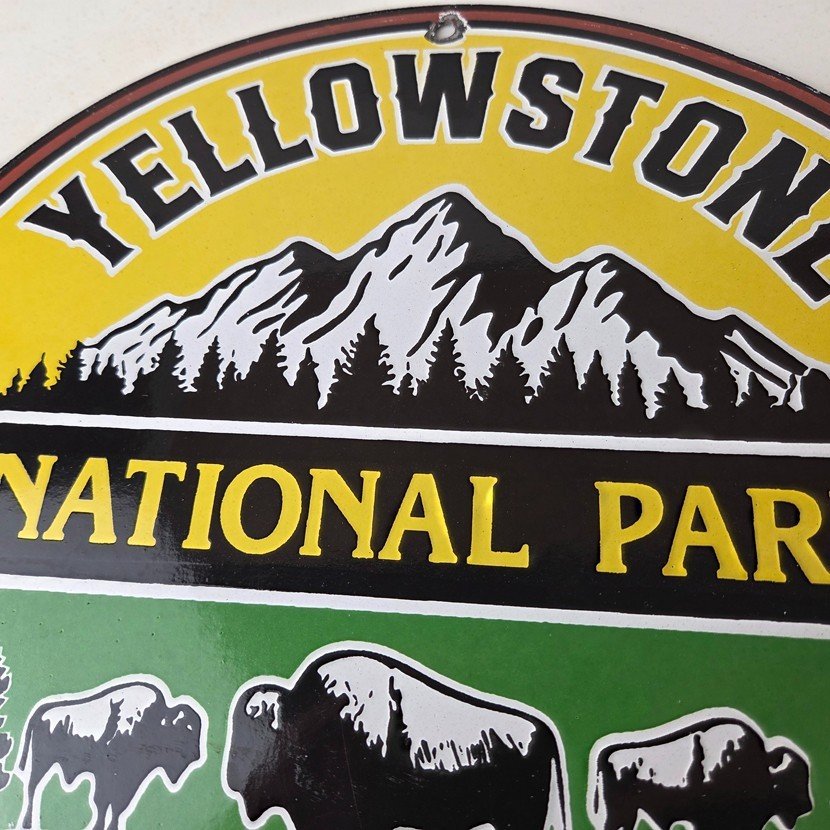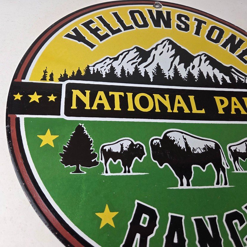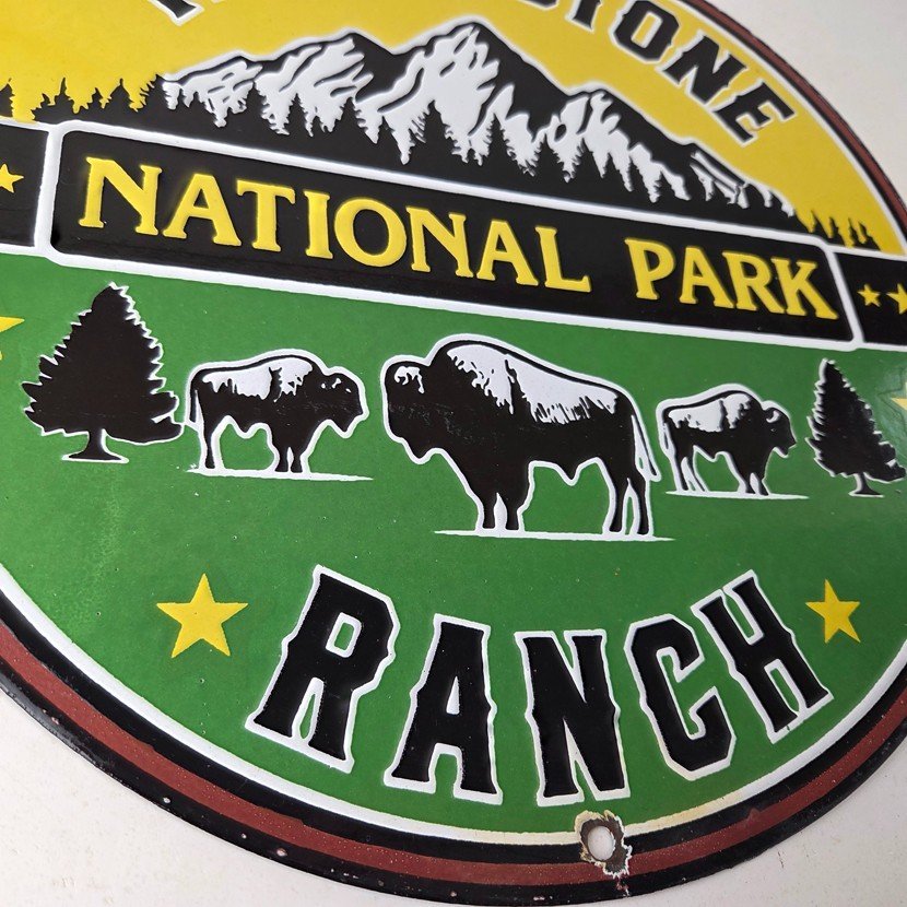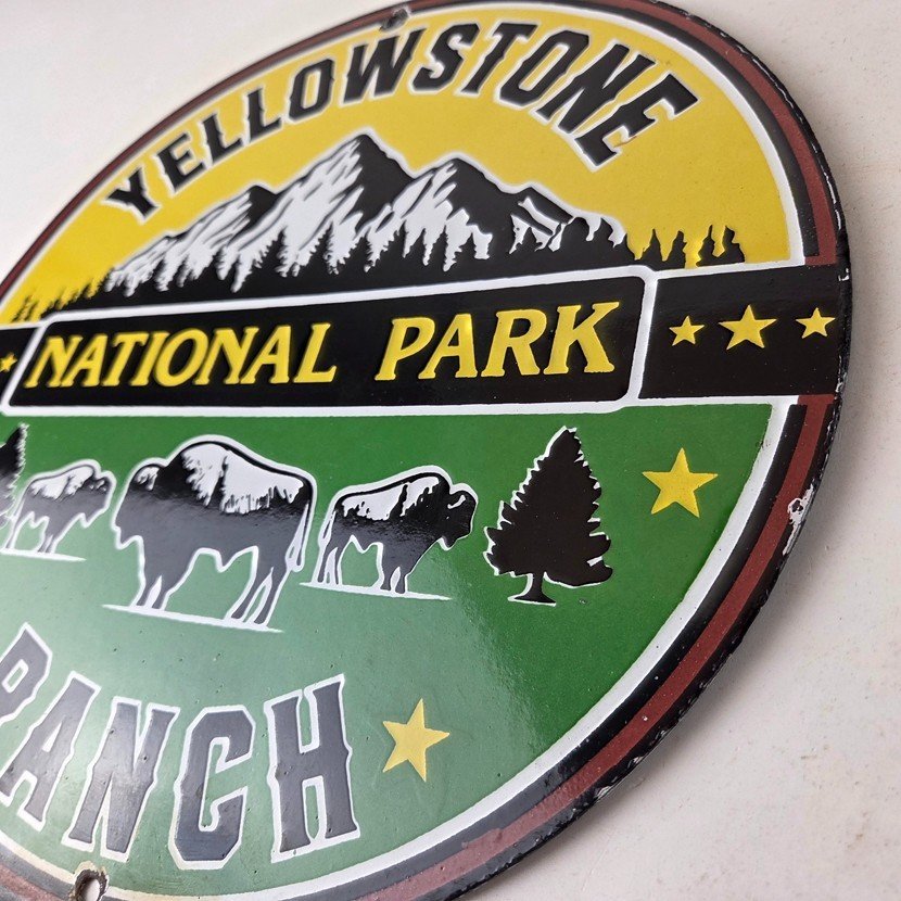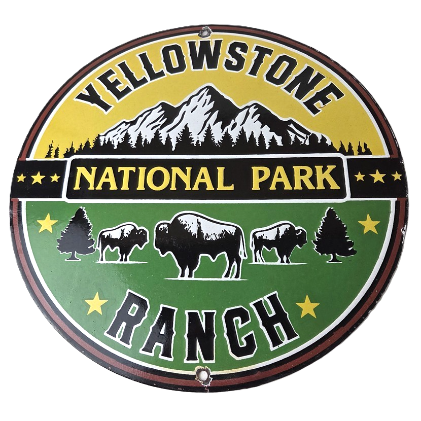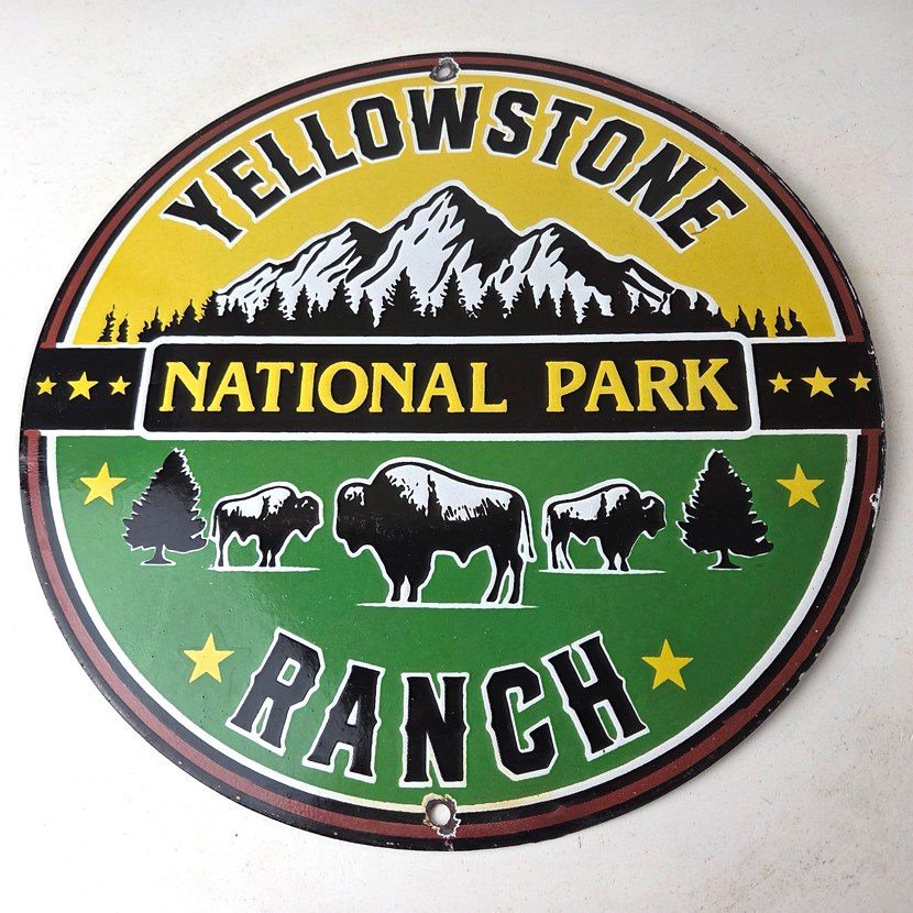 This vintage Yellowstone bison ranch sign makes a great addition to a garage, shop display, man cave, cabin, or any Yellowstone memorabilia collection, vintage national park advertising collection, bison/wildlife sign collection, or Americana outdoor sign collection.