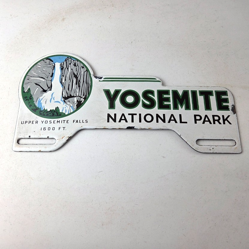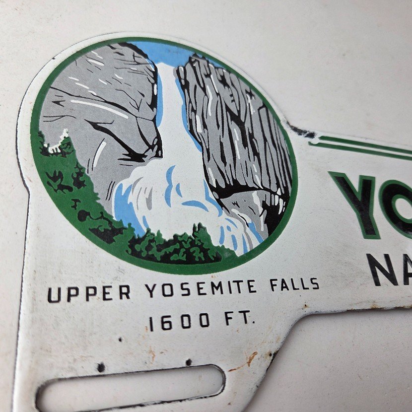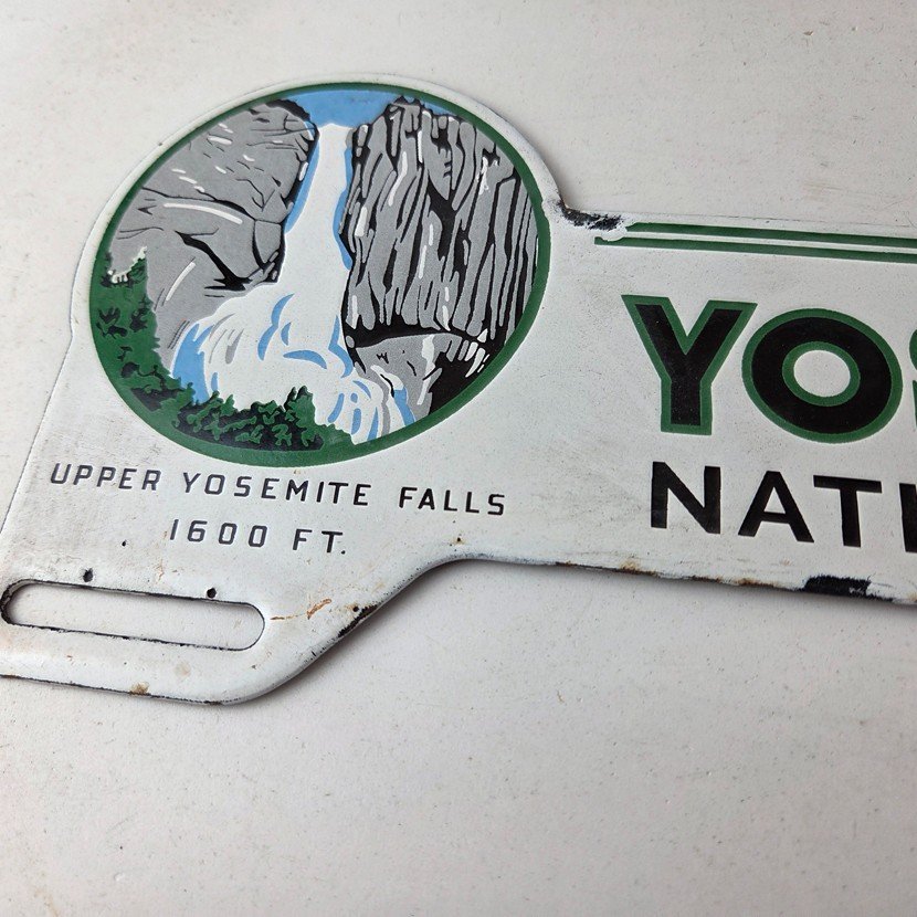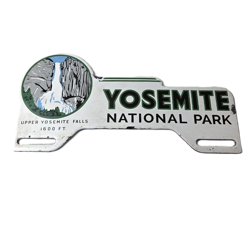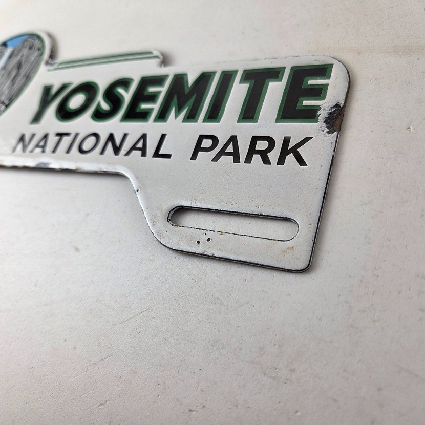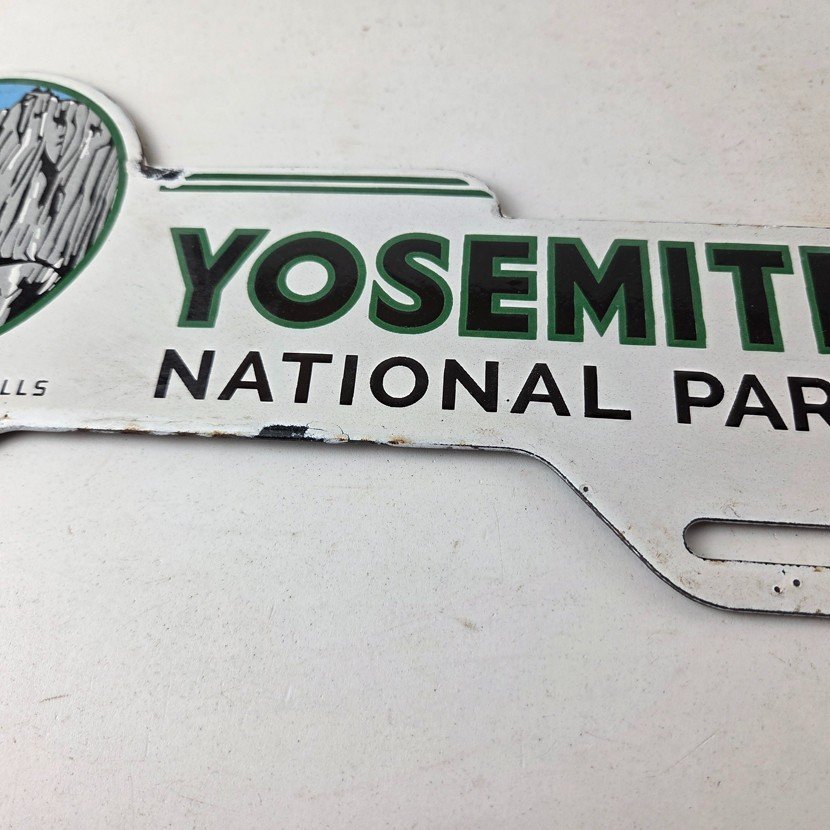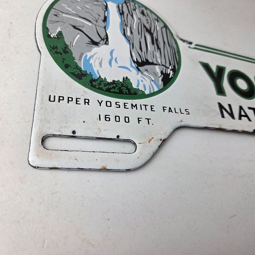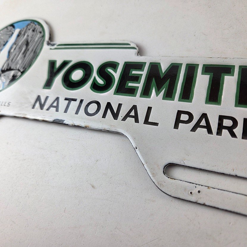 This vintage Yosemite National Park porcelain license plate topper is a must-have for any collector of gas and oil memorabilia. The 11″ by 5 1/2″ porcelain topper features a bold green and blue color with the iconic Yosemite falls graphic, making it a great addition to any collection.