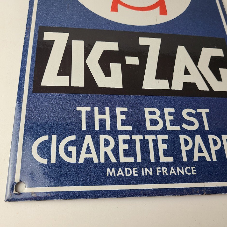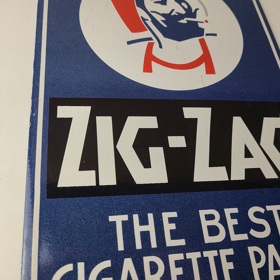 This vintage Cigarette Papers Porcelain sign features the iconic Zig-Zag brand and is perfect for collectors of gas and oil advertising memorabilia. The sign measures 12″ x 8″ and features a vibrant blue and orange color scheme with bold lettering.