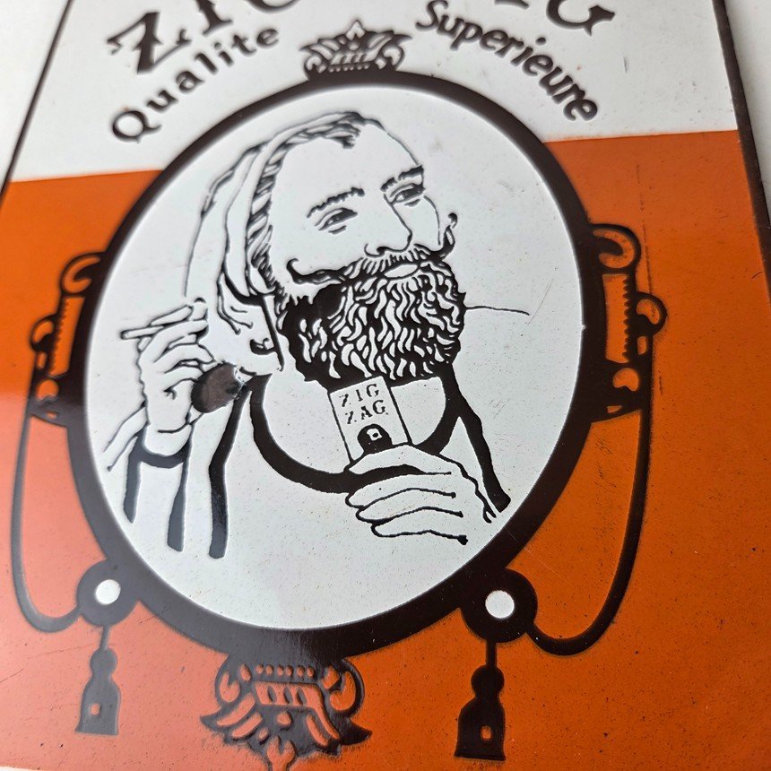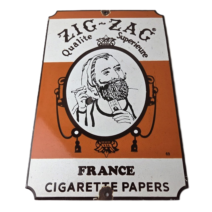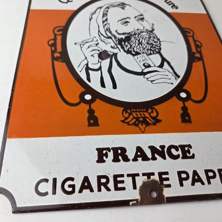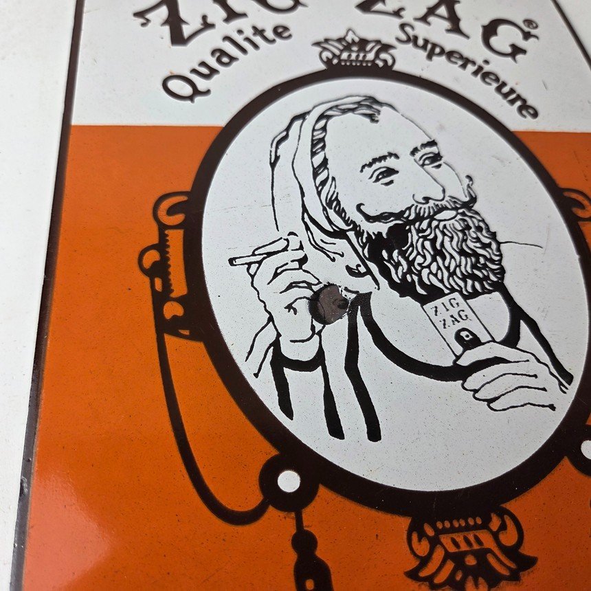 This vintage Cigarette Papers Porcelain sign features the iconic Zig-Zag brand and is perfect for collectors of gas and oil advertising memorabilia. The sign measures 12″ x 8″ and features a vibrant orange color scheme with bold lettering.